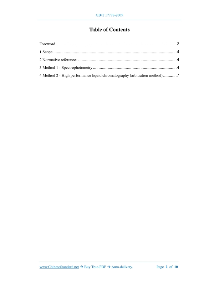 Similar standardsGB/T 17778-2005: Determination of d-biotin in premix---This is an excerpt. Full copy of true-PDF in English version (including equations, symbols, images, flow-chart, tables, and figures etc.), auto-downloaded/delivered in 9 seconds, can be purchased online: https://www.ChineseStandard.net/PDF.aspx/GBT17778-2005GB NATIONAL STANDARD OF THE PEOPLE’S REPUBLIC OF CHINA ICS 65.120 B 46 Replacing GB/T 17778-1999 Determination of d-biotin in premix ISSUED ON: SEPTEMBER 05, 2005 IMPLEMENTED ON: FEBRUARY 01, 2006 Issued by: General Administration of Quality Supervision, Inspection and Quarantine of PRC; Standardization Administration of PRC. Table of ContentsForeword ... 3 1 Scope ... 4 2 Normative references ... 4 3 Method 1 - Spectrophotometry ... 4 4 Method 2 - High performance liquid chromatography (arbitration method) ... 7 Determination of d-biotin in premix1 ScopeThis standard specifies two methods for the determination of d-biotin content in premixed feed, by spectrophotometer and high performance liquid chromatography. Method 1 and Method 2, as specified in this standard, are applicable to the determination of compound premix feed and vitamin premix feed, which has a d-biotin content greater than 1.0 mg/kg. The concentration range of the extract is 2.0 μg/mL ~ 20.0 μg/mL.2 Normative referencesThe provisions in following documents become the provisions of this Standard through reference in this Standard. For the dated references, the subsequent amendments (excluding corrections) or revisions do not apply to this Standard; however, parties who reach an agreement based on this Standard are encouraged to study if the latest versions of these documents are applicable. For undated references, the latest edition of the referenced document applies. GB/T 6682 Water for analytical laboratory use - Specification and test methods (neq ISO 3696:1987) GB/T 14699.1 Feeding stuffs - Sampling3 Method 1 - Spectrophotometry3.1 Principle Extract the d-biotin in the specimen, through the ethanol solution. The d-biotin and 4- dimethylaminocinnamaldehyde in the sulfuric acid ethanol solution will form an orange compound. The color depth, within a certain range, is directly proportional to the d- biotin content. 3.2 Reagents and materials Unless otherwise stated, only reagents of confirmed analytical grade are used in the analysis. The water complies with the provisions of grade-3 water in GB/T 6682. 3.2.1 Absolute ethanol. 3.2.2 Ethanol solution: Mix 90 volumes of ethanol with 10 volumes of water. 3.2.3 Sulfuric acid-ethanol solution: Mix 2 volumes of sulfuric acid with 98 volumes of absolute ethanol. 3.2.4 4-Dimethylaminocinnamaldehyde absolute ethanol solution: 2 g/L. 3.2.5 d-biotin standard solution 3.2.5.1 Standard stock solution: Accurately weigh 0.1000 g of d-biotin standard substance. Dissolve it in ethanol solution (3.2.2). Quantitatively transfer it to a 100 mL volumetric flask. Use ethanol water solution to dilute to the mark. Mix well.1.00 mL of this solution contains 1.00 mg of d-biotin. 3.2.5.2 Standard working solution: Accurately pipette 1.00 mL of d-biotin standard stock solution (3.2.5.1) into a 50 mL volumetric flask. Add ethanol solution, to dilute to the mark. Mix well.1.00 mL of this solution contains 20.0 μg of d-biotin, 3.3 Instruments and equipment 3.3.1 Spectrophotometer (with one derivative function). 3.3.2 Ultrasonic extractor for laboratory use. 3.3.3 Analytical balance: Sensitivity 0.0001 g. 3.4 Preparation of specimens Carry out sampling according to the method specified in GB/T 14699.1. Select a feed sample of at least 500 g. Reduce it to 100 g by quartering. Grind it. Pass it through a 0.42 mm hole sieve. Mix it. Put it in an airtight container. Save it for later use. 3.5 Analytical procedures 3.5.1 Extraction of specimen solution Weigh about 2 g of vitamin premix (accurate to 0.0001 g) AND about 5 g ~ 10 g of compound premix (accurate to 0.000 1 g). Put them in a ground-bottomed flat-bottomed flask. Add 5.00 mL of water to an ultrasonic extractor (3.3.2) for 20 min. Add 20 mL of absolute ethanol (3.2.1). Sonicate it for 20 min. Then transfer to a 50 mL volumetric flask. Use absolute ethanol (3.2.1) to dilute it to the mark. Filter it. Discard the first 10 mL. Use the rest as specimen extract. 3.5.2 Determination 3.5.2.1 Drawing of standard working curve Accurately pipette 0.00, 1.00, 2,00, 5.00, 10.00 mL of d-biotin standard working solution (3.2.5.2), into a 25 mL volumetric flask. Add 10.00, 9.00, 8.00, 5.00, 0.00 mL of ethanol aqueous solution (3.2.2), respectively. Add 1 mL of sulfuric acid-ethanol solution (3.2.3) and 2 mL of 4-dimethylaminocinnamaldehyde dehydrated ethanol solution (3.2.4). Shake well. Place at room temperature for 1 h. Use absolute ethanol solution (3.2.1) to dilute it to the mark. Use a 1.0 cm cuvette, to scan the first derivative of absorbance by a spectrophotometer, at 500 nm ~ 580 nm. Draw the standard working curve of the d-biotin content and the peak difference of the first derivative of absorbance, at 520 nm and 546 nm. 3.5.2.2 Accurately pipette 10.00 mL of 3.5.1 specimen extract, into a 25 mL volumetric flask. Add 1 mL of sulfuric acid-ethanol solution (3.2.3) and 2 mL of 4- dimethylaminocinnamon yeast absolute ethanol solution (3.2.4). Shake well. Let it stand at room temperature for 1 h. Use absolute ethanol (3.2.1) to dilute it to the mark. Use a 1.0 cm cuvette at 500 nm ~ 580 nm, to measure the peak difference of the first derivative of absorbance at 520 nm and 546 nm, through a spectrophotometer. Find the d-biotin content in the specimen extract, from the standard working curve. 3.6 Calculation and presentation of analysis results 3.6.1 The content of d-biotin in the specimen is calculated according to formula (1). Where: X - The content of d-biotin in the specimen, in milligrams per kilogram (mg/kg); m1 - The mass of d-biotin in the specimen extract, as obtained from the standard curve, in micrograms (μg); m2 - The s
