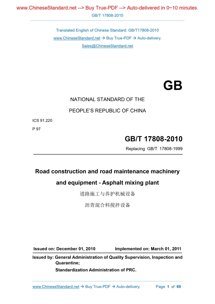 GB/T 17808-2010: Road construction and road maintenance machinery and equipment -- Asphalt mixing plant Delivery: 9 seconds. True-PDF full-copy in English & invoice will be downloaded + auto-delivered via email. See step-by-step procedure Status: Obsolete GB/T 17808: Historical versions
