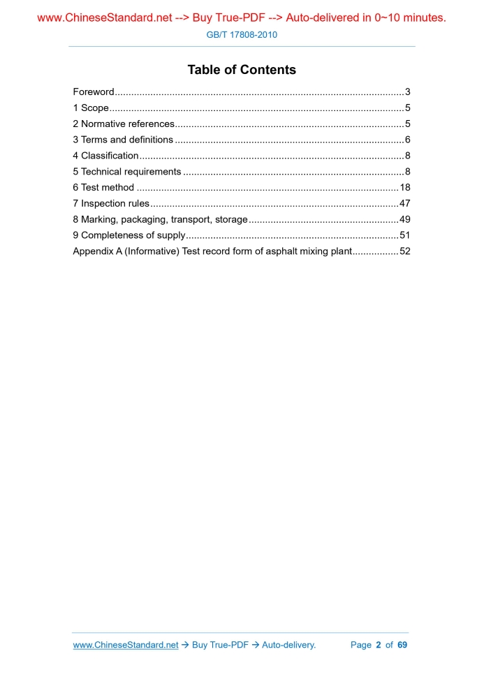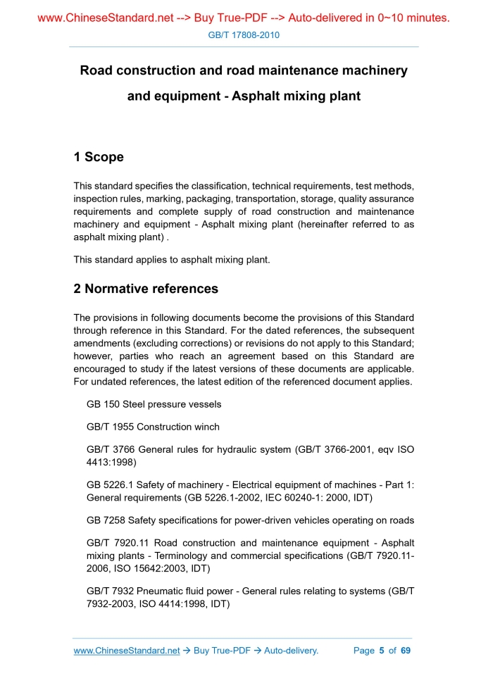 Similar standardsGB/T 17808-2010: Road construction and road maintenance machinery and equipment -- Asphalt mixing plant---This is an excerpt. Full copy of true-PDF in English version (including equations, symbols, images, flow-chart, tables, and figures etc.), auto-downloaded/delivered in 9 seconds, can be purchased online: https://www.ChineseStandard.net/PDF.aspx/GBT17808-2010 GB NATIONAL STANDARD OF THE PEOPLE’S REPUBLIC OF CHINA ICS 91.220 P 97 Replacing GB/T 17808-1999 Road construction and road maintenance machinery and equipment - Asphalt mixing plant 沥青混合料搅拌设备 Issued on: DECEMBER 01, 2010 Implemented on: MARCH 01, 2011 Issued by. General Administration of Quality Supervision, Inspection and Quarantine; Standardization Administration of PRC. Table of ContentsForeword... 3 1 Scope... 5 2 Normative references... 5 3 Terms and definitions... 6 4 Classification... 8 5 Technical requirements... 8 6 Test method... 18 7 Inspection rules... 47 8 Marking, packaging, transport, storage... 49 9 Completeness of supply... 51 Appendix A (Informative) Test record form of asphalt mixing plant... 52 Road construction and road maintenance machinery and equipment - Asphalt mixing plant1 ScopeThis standard specifies the classification, technical requirements, test methods, inspection rules, marking, packaging, transportation, storage, quality assurance requirements and complete supply of road construction and maintenance machinery and equipment - Asphalt mixing plant (hereinafter referred to as asphalt mixing plant). This standard applies to asphalt mixing plant.2 Normative referencesThe provisions in following documents become the provisions of this Standard through reference in this Standard. For the dated references, the subsequent amendments (excluding corrections) or revisions do not apply to this Standard; however, parties who reach an agreement based on this Standard are encouraged to study if the latest versions of these documents are applicable. For undated references, the latest edition of the referenced document applies. GB 150 Steel pressure vessels GB/T 1955 Construction winch GB/T 3766 General rules for hydraulic system (GB/T 3766-2001, eqv ISO 4413.1998) GB 5226.1 Safety of machinery - Electrical equipment of machines - Part 1. General requirements (GB 5226.1-2002, IEC 60240-1.2000, IDT) GB 7258 Safety specifications for power-driven vehicles operating on roads GB/T 7920.11 Road construction and maintenance equipment - Asphalt mixing plants - Terminology and commercial specifications (GB/T 7920.11- 2006, ISO 15642.2003, IDT) GB/T 7932 Pneumatic fluid power - General rules relating to systems (GB/T 7932-2003, ISO 4414.1998, IDT) Fixed asphalt mixing plant The asphalt mixing plant which uses fixed installation, all or part of which needs the support from transportation means during relocation. 3.2 Movable asphalt mixing plant The asphalt mixing plant, all or most of which are equipped with walking devices, that use the traction mechanism as the main means of transport during relocation. 3.3 Standard operating mode The condition of medium-grain ordinary asphalt mixture at which the ambient temperature is 20 °C, it is at the standard atmospheric pressure, the average moisture content of the cold aggregate is 5%, the diesel fuel is used, the hot aggregate temperature is 160 °C or the finished material temperature is 140 °C. 3.4 Fuel consumption rate Under standard operating conditions, for every ton of finished material produced by continuous asphalt mixing plant or for every ton of hot aggregate produced by intermittent asphalt mixing plant, the amount of diesel fuel consumed by the drum burner. Note. The calorific value of diesel is calculated at 46055 kJ/kg. 3.5 Static calibration measurement accuracy (abbreviated as static accuracy It is the calibration accuracy of the standard weight, expressed as a percentage, as the relative error of the difference between the value of the standard weight and the indicated value to the agreed value of the standard weight. 3.6 Dynamic batching measurement accuracy (abbreviated as dynamic accuracy) 5.3.2 The weld shall be flat, well-proportioned, free from defects; meet the requirements of JB/T 5000.3. 5.3.3 The surface of the castings shall be clean, free of pores, looseness and other defects; meet the requirements of JB/T 5000.4 and JB/T 5000.6. 5.3.4 Piping and joints shall be clean and unobstructed, sealed reliably; meet the requirements of JB/T 5000.11. 5.3.5 The hydraulic system shall meet the requirements of GB/T 3766. 5.3.6 The quality of the paint film shall meet the requirements of JG/T 5011.12. 5.3.7 The equipment shall be easy to transport; the hoisting and transportation shall comply with the requirements of relevant standards. 5.4 Towing performance requirements of movable mixing plant 5.4.1 When each transport unit is towed by a wheeled tractor, the driving speed shall not be higher than 20 km/h. The components are connected reliably, without loosening, deformation or damage. 5.4.2 The size limits of each transport unit during towing are as follows. total height 4.5 m, total width 3 m, total length 20 m. 5.4.3 The minimum turning diameter is not more than 60 m; the minimum ground clearance is not less than 265 mm. 5.4.4 The axle load of the transport unit shall meet the requirements of relevant specifications and shall not deviate from the design value by ±2.0%. 5.4.5 When driving at a speed of 20 km/h, the maximum braking distance shall meet the requirements of GB 7258. 5.5 Assembly technical requirements 5.5.1 Cold material supply system 5.5.1.1 The cold material supply system consists of cold material silos, feeders, aggregate belt conveyors, inclined belt conveyors. 5.5.1.2 The cold material silo's volume and material supply capacity shall meet the requirements of the maximum production capacity of the asphalt mixing plant; the material supply shall be stable and reliable. 5.5.1.3 The cold material silo adopts