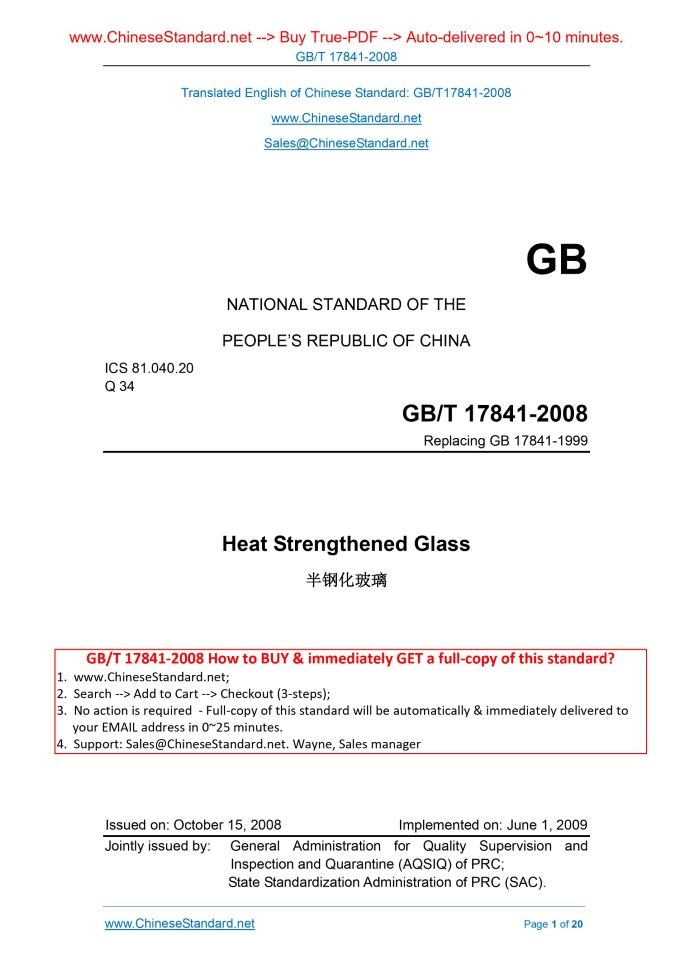 GB/T 17841-2008: Heat strengthened glass Delivery: 9 seconds. True-PDF full-copy in English & invoice will be downloaded + auto-delivered via email. See step-by-step procedure Status: Valid GB/T 17841: Historical versions