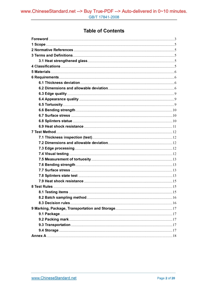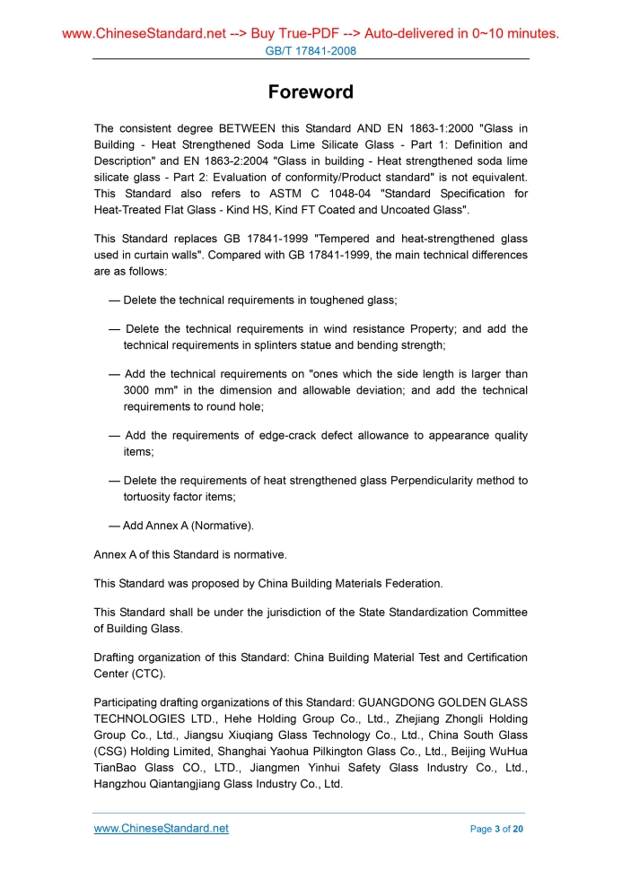 Similar standardsGB/T 17841-2008: Heat strengthened glass---This is an excerpt. Full copy of true-PDF in English version (including equations, symbols, images, flow-chart, tables, and figures etc.), auto-downloaded/delivered in 9 seconds, can be purchased online: https://www.ChineseStandard.net/PDF.aspx/GBT17841-2008GB NATIONAL STANDARD OF THE PEOPLE’S REPUBLIC OF CHINA ICS 81.040.20 Q 34 Replacing GB 17841-1999 Heat Strengthened Glass Issued on. OCTOBER 15, 2008 Implemented on. JUNE 1, 2009 Jointly issued by. General Administration for Quality Supervision and Inspection and Quarantine (AQSIQ) of PRC; State Standardization Administration of PRC (SAC). Table of ContentsForeword... 3 1 Scope... 5 2 Normative References... 5 3 Terms and Definitions... 5 4 Classifications... 5 5 Materials... 6 6 Requirements... 6 7 Test Method... 12 8 Test Rules... 15 9 Marking, Package, Transportation and Storage... 17 Annex A... 18ForewordThe consistent degree BETWEEN this Standard AND EN 1863-1.2000 "Glass in Building - Heat Strengthened Soda Lime Silicate Glass - Part 1.Definition and Description" and EN 1863-2.2004 "Glass in building - Heat strengthened soda lime silicate glass - Part 2.Evaluation of conformity/Product standard" is not equivalent. This Standard also refers to ASTM C 1048-04 "Standard Specification for Heat-Treated Flat Glass - Kind HS, Kind FT Coated and Uncoated Glass". This Standard replaces GB 17841-1999 "Tempered and heat-strengthened glass used in curtain walls". Compared with GB 17841-1999, the main technical differences are as follows. — Delete the technical requirements in toughened glass; — Delete the technical requirements in wind resistance Property; and add the technical requirements in splinters statue and bending strength; — Add the technical requirements on "ones which the side length is larger than 3000 mm" in the dimension and allowable deviation; and add the technical requirements to round hole; — Add the requirements of edge-crack defect allowance to appearance quality items; — Delete the requirements of heat strengthened glass Perpendicularity method to tortuosity factor items; — Add Annex A (Normative). Annex A of this Standard is normative. This Standard was proposed by China Building Materials Federation. This Standard shall be under the jurisdiction of the State Standardization Committee of Building Glass. Drafting organization of this Standard. China Building Material Test and Certification Center (CTC). Participating drafting organizations of this Standard. GUANGDONG GOLDEN GLASS TECHNOLOGIES LTD., Hehe Holding Group Co., Ltd., Zhejiang Zhongli Holding Group Co., Ltd., Jiangsu Xiuqiang Glass Technology Co., Ltd., China South Glass (CSG) Holding Limited, Shanghai Yaohua Pilkington Glass Co., Ltd., Beijing WuHua TianBao Glass CO., LTD., Jiangmen Yinhui Safety Glass Industry Co., Ltd., Hangzhou Qiantangjiang Glass Industry Co., Ltd. Chief Drafting staffs of this Standard. Wu Huiyan, Shi Xinyong, Wang Wenbiao, Xiao Weiwen, Wu Congzhen, Sun Dahai, Ai Fazhi, Long Linxing, Yang Hongbin, Chen Xinsheng, Zhou Jian, Ping Baizhan, Yang Jianhua, Jia Xiangdao, Zhao Wei, Qiu Juan. The previous edition replaced by this Standard is as follows. - GB 17841-1999. Heat Strengthened Glass1 ScopeThis Standard specifies terms and definitions, classification, technical requirements, test method, test rules and marking, Package and transportation and storage of heat strengthened glass made by the heat treatment. This Standard is applicable to heat strengthened glass for building made by heat treatment. The heat strengthened glass for other purpose except building may reference to this Standard according to the characteristics of the products.2 Normative ReferencesThe following standards contain provisions which, through reference in this text, constitute provisions of this Standard. For dated references, the subsequent amendments or revisions of these publications do not apply. However, parties who enter into agreement based on this part are encouraged to investigate the possibility of applying the most recent edition of the normative document indicated below. For undated references, the latest edition of the normative document referred to applies. GB/T 1216 External micrometer GB/T 8170 Rules for Rounding Off Of Numerical Values GB 15763.2-2005 Safety Glazing Materials in Building - Part 2.Tempered Glass3 Terms and DefinitionsThe following terms and definitions apply in this Standard.4 ClassificationsBased on production process, heat strengthened glass may be classified as heat strengthened glass made with perpendicularity method and heat strengthened glass made with horizon method.5 MaterialsThe quality of the glass sheets for producing heat strengthened glass shall meet the requirements the related product standards.6 RequirementsProperty items and test methods of Heat strengthened glass shall meet the requirements of the items in Table 1. 6.1 Thickness deviation The Thickness deviation of the products shall meet the requirements of the standards applying the adopted glass sheets. 6.2 Dimensions and allowable deviation 6.2.3 Round hole 6.2.3.1 General This article is only applicable to the products of which the normal thickness is not less than 4mm. The edge processing quality of round hole shall be negotiated by the supplying and demanding parties. 6.5 Tortuosity The tortuosity factor of flat product made with horizon method shall meet the requirements of Table 6; the tortuosity factor of flat product with perpendicular method shall be negotiated by the supplying and demanding parties. 6.7 Surface stress Inspected in accordance with 7.7, the surface stress shall meet the requirements in Table 8. 6.8 Splinters statue The splinters statue of the glass of which the thickness is not larger than 8mm shall be inspected in accordance with 7.8; the splinters statue of each test sample shall meet the requirements in 6.8.1.The splinters statue of the glass of which the thickness