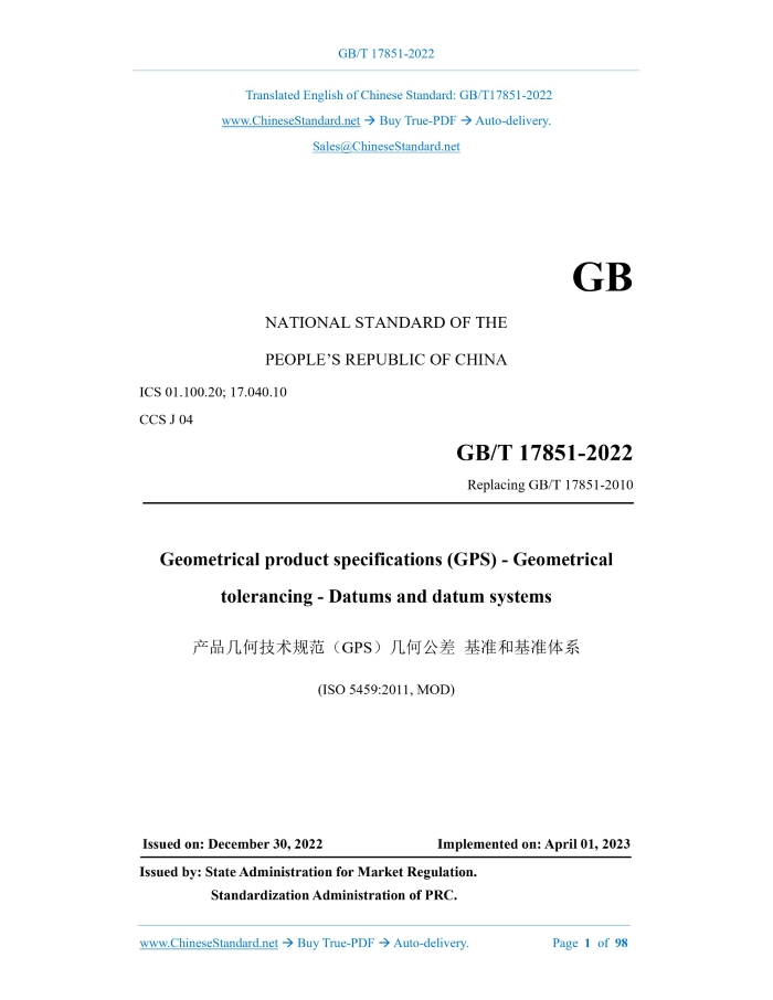 GB/T 17851-2022: Geometrical product specifications (GPS) - Geometrical tolerancing - Datums and datum systems Delivery: 9 seconds. True-PDF full-copy in English & invoice will be downloaded + auto-delivered via email. See step-by-step procedure Status: Valid GB/T 17851: Historical versions