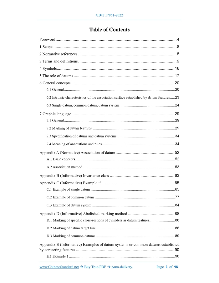 Similar standardsGB/T 17851-2022: Geometrical product specifications (GPS) - Geometrical tolerancing - Datums and datum systems---This is an excerpt. Full copy of true-PDF in English version (including equations, symbols, images, flow-chart, tables, and figures etc.), auto-downloaded/delivered in 9 seconds, can be purchased online: https://www.ChineseStandard.net/PDF.aspx/GBT17851-2022 GB NATIONAL STANDARD OF THE PEOPLE’S REPUBLIC OF CHINA ICS 01.100.20; 17.040.10 CCS J 04 Replacing GB/T 17851-2010 Geometrical product specifications (GPS) - Geometrical tolerancing - Datums and datum systems (ISO 5459:2011, MOD) ISSUED ON: DECEMBER 30, 2022 IMPLEMENTED ON: APRIL 01, 2023 Issued by: State Administration for Market Regulation. Standardization Administration of PRC. Table of ContentsForeword ... 4 1 Scope ... 8 2 Normative references ... 8 3 Terms and definitions ... 9 4 Symbols ... 16 5 The role of datums ... 17 6 General concepts ... 20 6.1 General... 20 6.2 Intrinsic characteristics of the association surface established by datum features ... 23 6.3 Single datum, common datum, datum system ... 24 7 Graphic language ... 29 7.1 General... 29 7.2 Marking of datum features ... 29 7.3 Specification of datums and datum systems ... 34 7.4 Meaning of annotations and rules ... 34 Appendix A (Normative) Association of datum ... 52 A.1 Basic concepts ... 52 A.2 Association method ... 53 Appendix B (Informative) Invariance class ... 63 Appendix C (Informative) Example 1) ... 65 C.1 Example of single datum ... 65 C.2 Example of common datum ... 77 C.3 Example of datum system ... 84 Appendix D (Informative) Abolished marking method ... 88 D.1 Marking of specific cross-sections of cylinders as datum features ... 88 D.2 Marking of datum target line ... 88 D.3 Marking of common datums ... 89 Appendix E (Informative) Examples of datum systems or common datums established by contacting features ... 90 E.1 Example 1 ... 90 E.2 Example 2 ... 91 E.3 Example 3 ... 92 E.4 Example 4 ... 93 E.5 Example 5 ... 94 Appendix F (Normative) Relationships and dimensions of graphic symbols ... 95 Appendix G (Informative) Relationship to matrix model ... 96 G.1 Overview ... 96 G.2 Information about standards and their use ... 96 G.3 Location in GPS matrix model ... 96 G.4 Related standards ... 97 References ... 98 Geometrical product specifications (GPS) - Geometrical tolerancing - Datums and datum systems1 ScopeThis document specifies the terminology, rules and methods related to the marking and understanding of datums and datum systems in product technical documentation. This document also provides corresponding explanations of the concepts involved to facilitate understanding. This document defines a set of normative operations for establishing datums and datum systems (see GB/T 24637.2). Its inspection operation set (see GB/T 24637.2) can take different forms (physical simulation or mathematical association); however, this is not the content discussed in this document. Note: GB/T 16671 gives detailed rules on the maximum material requirements and minimum material requirements of the datum. This document applies to product geometric technical specifications related to datums and datum systems.2 Normative referencesThe contents of the following documents constitute essential provisions of this document through normative references in the text. Among them, for dated reference documents, only the version corresponding to the date applies to this document; for undated reference documents, the latest version (including all amendments) applies to this document. GB/T 1182-2018 Geometrical product specifications (GPS) - Geometrical tolerancing - Tolerances of form, orientation, location and run-out (ISO 1101:2017, MOD) GB/T 16671-2018 Geometrical product specifications (GPS) - Geometrical tolerancing - Maximum material requirement (MMR), least material requirement (LMR) and reciprocity requirement (RPR) (ISO 2692:2014, MOD) GB/T 24637.1 Geometrical product specifications (GPS) - General concepts - Part 1: Model for geometrical specification and verification (GB/T 24637.1-2020, ISO 17450-1:2011, MOD) - Composite surface (e.g. a free-shaped curved surface). Each single feature or collection feature belongs to an invariance class (see Appendix B for explanations of invariance class, degrees of invariance, degrees of freedom). Association features are established from actual single datum features or extracted single datum features. Association features can be determined through association, which include constraints on the feature itself or constraints relative to one or more other features. The orientation features that constitute the datum are determined by these association features. See Appendix A for the default association method. One or more single features can be used to establish a datum. If only a single feature is used, a single datum is established. If multiple single features are used, these features may either be considered simultaneously to establish a common datum, OR they may be established in a defined order to establish a datum system (see 6.3). All datum features used to establish datums shall be clearly marked. A single datum (see 6.3.2), a common datum (see 6.3.3) or a datum system (see 6.3.4) in the geometric specification shall be clearly defined. For the association, if any additional constraints are required, they shall be defined. Note 1: Datums and datum systems are geometric features, not coordinate systems. Coordinate systems can be established on datums. Note 2: This document does not provide the expression of the coordinate system. This part of the content may be added in subsequent versions or amendments of GB/T 17851. Example: The single datum marked in Figure 4 is derived from actual features that are cylindrical in the nominal state, which is used to orient or locate the tolerance zone. In order to export this datum, the following shall be done: - Separation: To determine the actual composition 