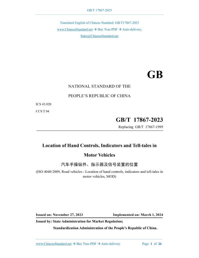 GB/T 17867-2023: Location of hand controls, indicators and tell-tales in motor vehicles Delivery: 9 seconds. True-PDF full-copy in English & invoice will be downloaded + auto-delivered via email. See step-by-step procedure Status: Valid GB/T 17867: Historical versions