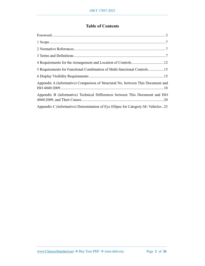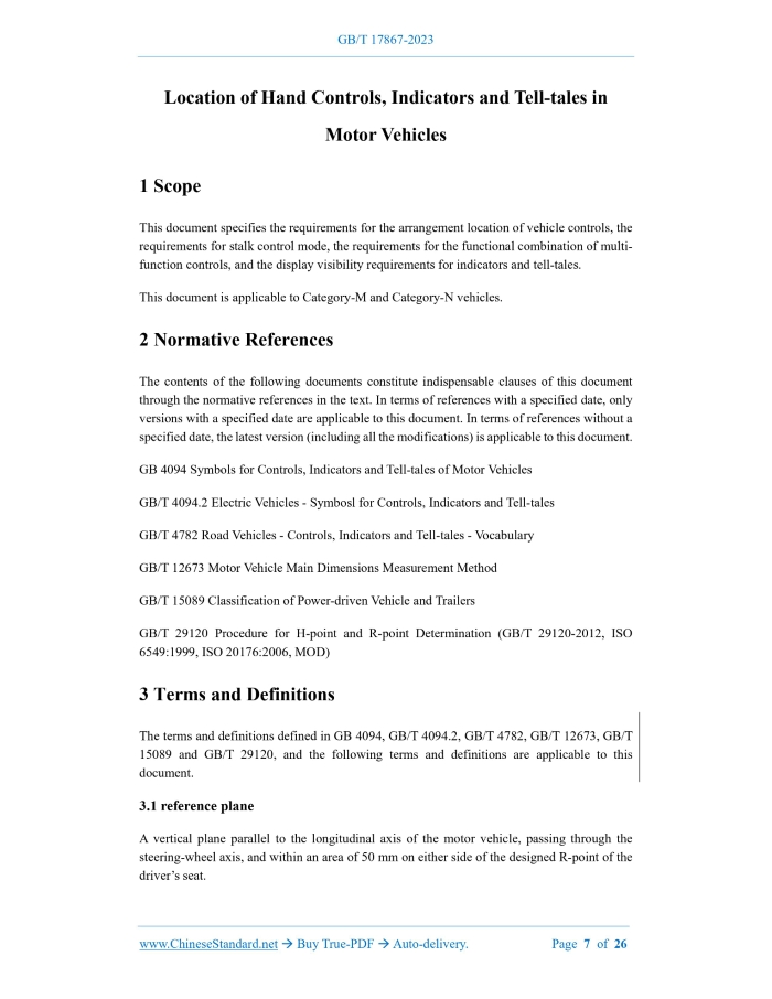 Similar standardsGB/T 17867-2023: Location of hand controls, indicators and tell-tales in motor vehicles---This is an excerpt. Full copy of true-PDF in English version (including equations, symbols, images, flow-chart, tables, and figures etc.), auto-downloaded/delivered in 9 seconds, can be purchased online: https://www.ChineseStandard.net/PDF.aspx/GBT17867-2023GB NATIONAL STANDARD OF THE PEOPLE’S REPUBLIC OF CHINA ICS 43.020 CCS T 04 Replacing GB/T 17867-1999 Location of Hand Controls, Indicators and Tell-tales in Motor Vehicles (ISO 4040:2009, Road vehicles - Location of hand controls, indicators and tell-tales in motor vehicles, MOD) ISSUED ON: NOVEMBER 27, 2023 IMPLEMENTED ON: MARCH 1, 2024 Issued by: State Administration for Market Regulation; Standardization Administration of the People’s Republic of China. Table of ContentsForeword ... 3 1 Scope ... 7 2 Normative References ... 7 3 Terms and Definitions ... 7 4 Requirements for the Arrangement and Location of Controls ... 12 5 Requirements for Functional Combination of Multi-functional Controls ... 15 6 Display Visibility Requirements ... 15 Appendix A (informative) Comparison of Structural No. between This Document and ISO 4040:2009 ... 18 Appendix B (informative) Technical Differences between This Document and ISO 4040:2009, and Their Causes ... 20 Appendix C (informative) Determination of Eye Ellipse for Category-M1 Vehicles .. 23 Location of Hand Controls, Indicators and Tell-tales in Motor Vehicles1 ScopeThis document specifies the requirements for the arrangement location of vehicle controls, the requirements for stalk control mode, the requirements for the functional combination of multi- function controls, and the display visibility requirements for indicators and tell-tales. This document is applicable to Category-M and Category-N vehicles.2 Normative ReferencesThe contents of the following documents constitute indispensable clauses of this document through the normative references in the text. In terms of references with a specified date, only versions with a specified date are applicable to this document. In terms of references without a specified date, the latest version (including all the modifications) is applicable to this document. GB 4094 Symbols for Controls, Indicators and Tell-tales of Motor Vehicles GB/T 4094.2 Electric Vehicles - Symbosl for Controls, Indicators and Tell-tales GB/T 4782 Road Vehicles - Controls, Indicators and Tell-tales - Vocabulary GB/T 12673 Motor Vehicle Main Dimensions Measurement Method GB/T 15089 Classification of Power-driven Vehicle and Trailers GB/T 29120 Procedure for H-point and R-point Determination (GB/T 29120-2012, ISO 6549:1999, ISO 20176:2006, MOD)3 Terms and DefinitionsThe terms and definitions defined in GB 4094, GB/T 4094.2, GB/T 4782, GB/T 12673, GB/T 15089 and GB/T 29120, and the following terms and definitions are applicable to this document. 3.1 reference plane A vertical plane parallel to the longitudinal axis of the motor vehicle, passing through the steering-wheel axis, and within an area of 50 mm on either side of the designed R-point of the driver’s seat. Description of indexes: 1---display area used by the pointer; 2---display area for other information. Figure 2 -- Example of Indicator Display Area 3.4 steering-wheel plane The plane tangent to the upper surface of the steering wheel rim as set by the vehicle manufacturer, with the wheels in a straight-ahead position. 3.5 steering-wheel axis A straight line passing through the center of rotation of the steering wheel rim and perpendicular to the steering-wheel plane. 3.6 zone 1 The zone located on the left side of the reference plane, and enclosed by the following planes: ---a plane parallel to the steering-wheel plane and at a distance of 20 mm above it; ---a plane parallel to the steering-wheel plane and at a distance of 170 mm below it; ---a cylindrical surface extending 100 mm outward along the outer edge of the steering wheel rim, with its axis coinciding with the steering-wheel axis; ---a cylindrical surface extending 130 mm inward along the inner edge of the steering wheel rim, with its axis coinciding with the steering-wheel axis; ---two planes passing through the steering-wheel axis, and the intersection of the two planes with the steering-wheel plane and the reference plane constitute 40 and 130. EXAMPLE: see Figure 3. 3.7 zone 2 The zone enclosed by the following planes: ---a plane parallel to the steering-wheel plane and at a distance of 20 mm above it; ---a plane parallel to the steering-wheel plane and at a distance of 170 mm below it; ---a cylindrical surface with a radius of 50 mm, with its axis coinciding with the steering- wheel axis. EXAMPLE: see Figure 3. NOTE 2: see Figure 4.4 Requirements for the Arrangement and Location ofControls 4.1 The controls include mechanical controls and virtual controls. 4.2 The arrangement and location of the mechanical controls shall satisfy the requirements of 4.3 ~ 4.16. The arrangement and location of the virtual controls should be visible and easy to operate. 4.3 For Category-M1 vehicles, all controls listed in 4.4 ~ 4.16 shall be arranged within the driver’s hand control area. For Category-M2, Category-M3 and Category-N vehicles, the controls listed in 4.4 ~ 4.16 shall be arranged within the driver’s hand control area when wearing a seat belt. 4.4 If the following devices are controlled by the controls, the operational area of the controls shall be arranged in zone 1: ---headlights (high beam, switching between high beam and low beam, and low beam); ---headlight warning (instantaneous high beam warning); ---turn-signal indicator. 4.5 The master lighting switch shall be arranged on the left side of the reference plane. 4.6 Part of the operational area of the audio (for example, honking horn) controls shall be arranged in zone 1 or zone 2. The auxiliary audio (for example, low-speed tone) controls may be arranged elsewhere, or the operational area c