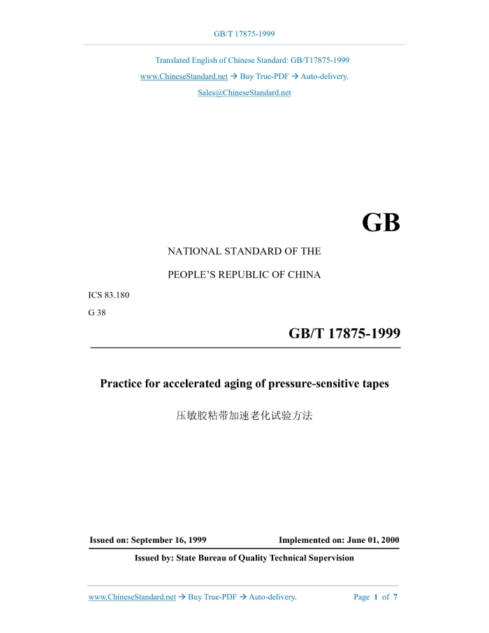 GB/T 17875-1999: Practice for accelerated aging of pressure-sensitive tapes Delivery: 9 seconds. True-PDF full-copy in English & invoice will be downloaded + auto-delivered via email. See step-by-step procedure Status: Obsolete