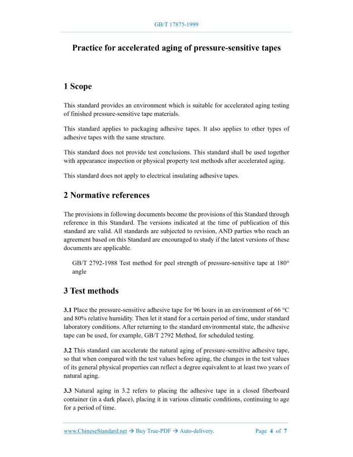 Similar standardsGB/T 17875-1999: Practice for accelerated aging of pressure-sensitive tapes---This is an excerpt. Full copy of true-PDF in English version (including equations, symbols, images, flow-chart, tables, and figures etc.), auto-downloaded/delivered in 9 seconds, can be purchased online: https://www.ChineseStandard.net/PDF.aspx/GBT17875-1999GB NATIONAL STANDARD OF THE PEOPLE’S REPUBLIC OF CHINA ICS 83.180 G 38 Practice for accelerated aging of pressure-sensitive tapes ISSUED ON: SEPTEMBER 16, 1999 IMPLEMENTED ON: JUNE 01, 2000 Issued by: State Bureau of Quality Technical Supervision Table of ContentsForeword ... 3 1 Scope ... 4 2 Normative references ... 4 3 Test methods ... 4 4 Test device ... 5 5 Reagents or materials ... 5 6 Preparation of solution ... 6 7 Sampling ... 6 8 Specimens ... 6 9 Test steps ... 6 10 Test report ... 7 Practice for accelerated aging of pressure-sensitive tapes1 ScopeThis standard provides an environment which is suitable for accelerated aging testing of finished pressure-sensitive tape materials. This standard applies to packaging adhesive tapes. It also applies to other types of adhesive tapes with the same structure. This standard does not provide test conclusions. This standard shall be used together with appearance inspection or physical property test methods after accelerated aging. This standard does not apply to electrical insulating adhesive tapes.2 Normative referencesThe provisions in following documents become the provisions of this Standard through reference in this Standard. The versions indicated at the time of publication of this standard are valid. All standards are subjected to revision, AND parties who reach an agreement based on this Standard are encouraged to study if the latest versions of these documents are applicable. GB/T 2792-1988 Test method for peel strength of pressure-sensitive tape at 180° angle3 Test methods3.1 Place the pressure-sensitive adhesive tape for 96 hours in an environment of 66 °C and 80% relative humidity. Then let it stand for a certain period of time, under standard laboratory conditions. After returning to the standard environmental state, the adhesive tape can be used, for example, GB/T 2792 Method, for scheduled testing. 3.2 This standard can accelerate the natural aging of pressure-sensitive adhesive tape, so that when compared with the test values before aging, the changes in the test values of its general physical properties can reflect a degree equivalent to at least two years of natural aging. 3.3 Natural aging in 3.2 refers to placing the adhesive tape in a closed fiberboard container (in a dark place), placing it in various climatic conditions, continuing to age for a period of time.6 Preparation of solution6.1 Prepare an aqueous ammonium sulfate solution by mixing ammonium sulfate and distilled water or soft water, at a weight ratio of 1:1. The amount of water (ml) shall not be less than 500 × 132 × the volume of air in the test tank (cubic meters). In this way, it can get 500 times the amount of water, which is necessary to maintain 80% humidity in the air in the tank and to replenish the moisture absorbed by the tape roll at 66 °C. What is obtained at this time is a saturated solution of ammonium sulfate, which can continue to remain saturated at 66 °C. In a closed test tank, the solution both creates and controls the necessary humidity in the test tank.7 Sampling7.1 Sampling for this standard shall be in accordance with the requirements of the appropriate material or commodity specification. 7.2 In the absence of the requirements mentioned in 7.1, the sampling method may be carried out, according to the requirements of the physical property test method to be carried out after accelerated aging.8 Specimens8.1 The specimen is a finished adhesive tape rolled on a reel. 8.2 The length of the adhesive tape on the roll slightly exceeds the total length of the specimen, which is required for the physical property test after accelerated aging. 8.3 The width of the adhesive tape shall not be less than 12 mm. 8.4 The adhesive tape rolls shall be original and not re-rolled.9 Test steps9.1 The tape roll is located above the solution in the test tank. The edge flange plane of the tape roll is parallel to the liquid level. 9.2 The volume of the tape roll placed shall not exceed 1/4 of the air volume of the test tank. 9.3 To expose all surfaces of the tape roll to moist air, use a breakaway stand that shall not absorb water. 9.4 Close the test tank and place it in the oven. ......Source: Above contents are excerpted from the full-copy PDF -- translated/reviewed by: www.ChineseStandard.net / Wayne Zheng et al. Tips & Frequently Asked Questions:Question 1: How long will the true-PDF of English version of GB/T 17875-1999 be delivered?Answer: The full copy PDF of English version of GB/T 17875-1999 can be downloaded in 9 seconds, and it will also be emailed to you in 9 seconds (double mechanisms to ensure the delivery reliably), with PDF-invoice.Question 2: Can I share the purchased PDF of GB/T 17875-1999_English with my colleagues?Answer: Yes. The purchased PDF of GB/T 17875-1999_English will be deemed to be sold to your employer/organization who actually paid for it, including your colleagues and your employer's intranet.Question 3: Does the price include tax/VAT?Answer: Yes. Our tax invoice, downloaded/delivered in 9 seconds, includes all tax/VAT and complies with 100+ countries' tax regulations (tax exempted in 100+ countries) -- See Avoidance of Double Taxation Agreements (DTAs): List of DTAs signed between Singapore and 100+ countriesQuestion 4: Do you accept my currency other than USD?Answer: Yes. www.ChineseStandard.us -- GB/T 17875-1999 -- Click this link and select your country/currency to pay, the exact amount in your currency will be printed on the invoice. Full PDF will also be downloaded/emailed in 9 seconds.How to buy and download a true PDF of English version of GB/T 17875-1999?A step-