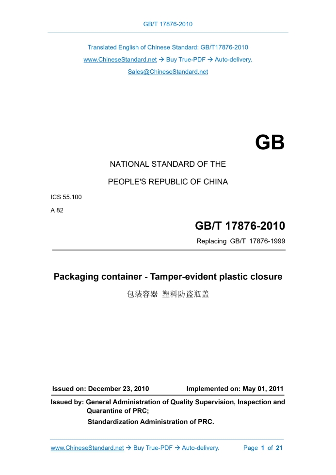 GB/T 17876-2010: Packaging container - Tamper-evident plastic closure Delivery: 9 seconds. True-PDF full-copy in English & invoice will be downloaded + auto-delivered via email. See step-by-step procedure Status: Valid GB/T 17876: Historical versions