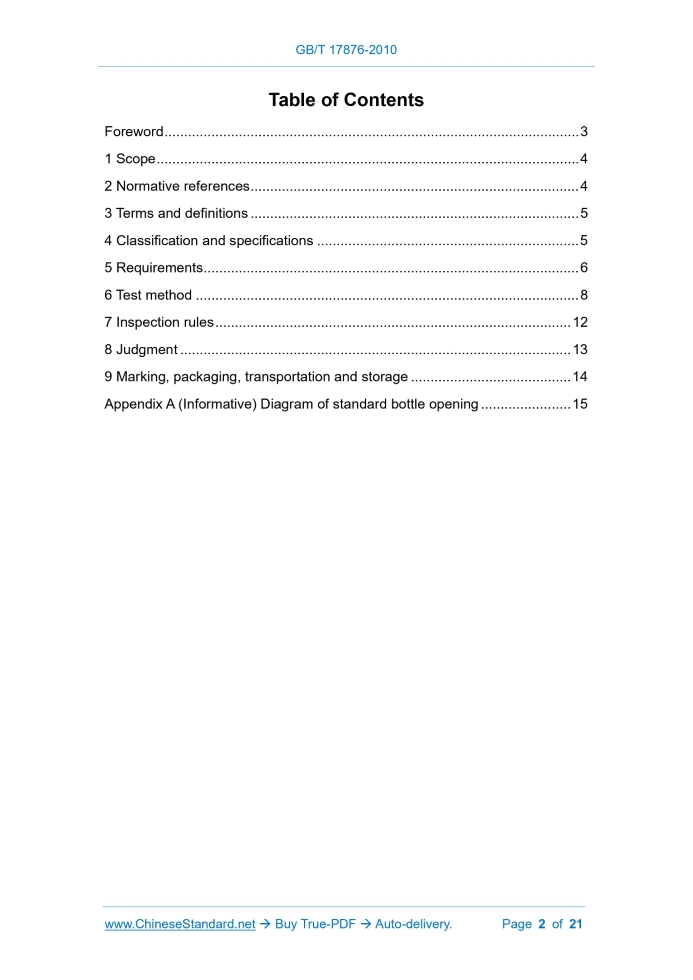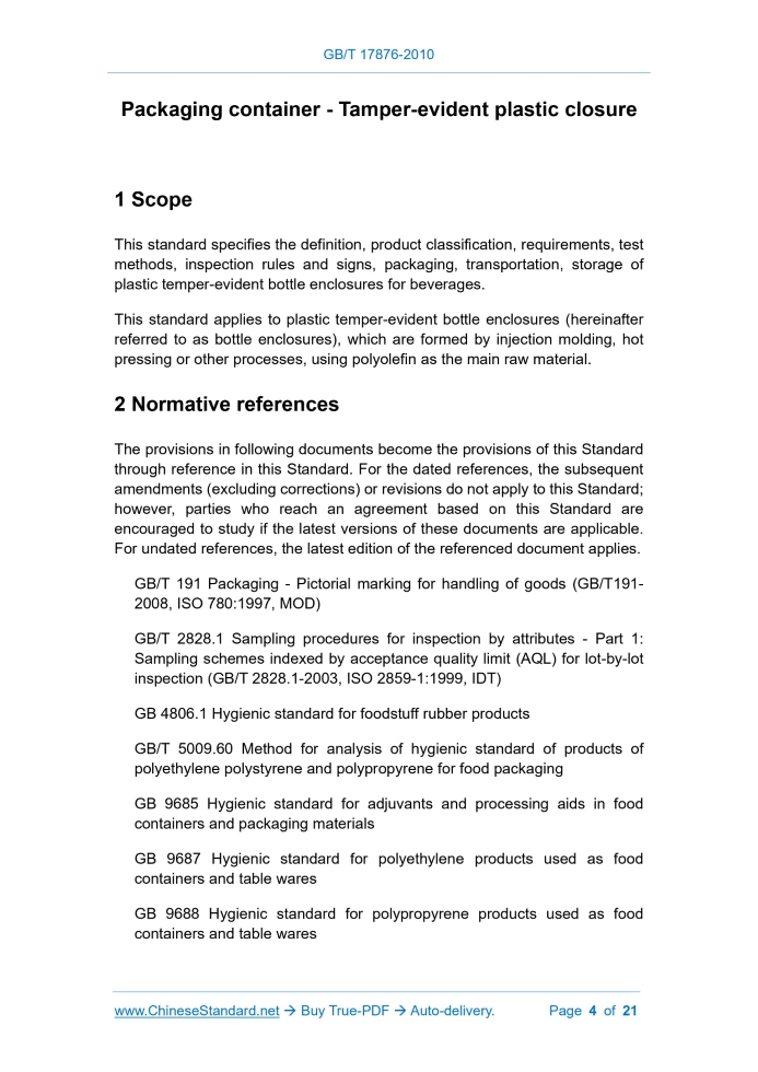 Similar standardsGB/T 17876-2010: Packaging container - Tamper-evident plastic closure---This is an excerpt. Full copy of true-PDF in English version (including equations, symbols, images, flow-chart, tables, and figures etc.), auto-downloaded/delivered in 9 seconds, can be purchased online: https://www.ChineseStandard.net/PDF.aspx/GBT17876-2010GB NATIONAL STANDARD OF THE PEOPLE'S REPUBLIC OF CHINA ICS 55.100 A 82 Replacing GB/T 17876-1999 Packaging container - Tamper-evident plastic closure ISSUED ON: DECEMBER 23, 2010 IMPLEMENTED ON: MAY 01, 2011 Issued by: General Administration of Quality Supervision, Inspection and Quarantine of PRC; Standardization Administration of PRC. Table of ContentsForeword ... 3 1 Scope ... 4 2 Normative references ... 4 3 Terms and definitions ... 5 4 Classification and specifications ... 5 5 Requirements ... 6 6 Test method ... 8 7 Inspection rules ... 12 8 Judgment ... 13 9 Marking, packaging, transportation and storage ... 14 Appendix A (Informative) Diagram of standard bottle opening ... 15 Packaging container - Tamper-evident plastic closure1 ScopeThis standard specifies the definition, product classification, requirements, test methods, inspection rules and signs, packaging, transportation, storage of plastic temper-evident bottle enclosures for beverages. This standard applies to plastic temper-evident bottle enclosures (hereinafter referred to as bottle enclosures), which are formed by injection molding, hot pressing or other processes, using polyolefin as the main raw material.2 Normative referencesThe provisions in following documents become the provisions of this Standard through reference in this Standard. For the dated references, the subsequent amendments (excluding corrections) or revisions do not apply to this Standard; however, parties who reach an agreement based on this Standard are encouraged to study if the latest versions of these documents are applicable. For undated references, the latest edition of the referenced document applies. GB/T 191 Packaging - Pictorial marking for handling of goods (GB/T191- 2008, ISO 780:1997, MOD) GB/T 2828.1 Sampling procedures for inspection by attributes - Part 1: Sampling schemes indexed by acceptance quality limit (AQL) for lot-by-lot inspection (GB/T 2828.1-2003, ISO 2859-1:1999, IDT) GB 4806.1 Hygienic standard for foodstuff rubber products GB/T 5009.60 Method for analysis of hygienic standard of products of polyethylene polystyrene and polypropyrene for food packaging GB 9685 Hygienic standard for adjuvants and processing aids in food containers and packaging materials GB 9687 Hygienic standard for polyethylene products used as food containers and table wares GB 9688 Hygienic standard for polypropyrene products used as food containers and table wares3 Terms and definitionsThe following terms and definitions apply to this standard 3.1 Temper-evident plastic closure It is made of plastic and cannot be restored to its original packaging form, after being encapsulated and opened. 3.2 Removal torque The maximum torque, which is required to open the temper-evident closure of the package. 3.3 Bridge break torque The maximum torque, which is required to break the temper-evident band. 3.4 Temper-evident band It is composed of a bridge connected and completely or partially disconnected from the closure after opening. Note: The temper-evident band is divided into two types: drop type and connection type.4 Classification and specifications4.1 Classification 4.1.1 Products are classified into closure with cushion and closure without cushions, according to the structure of the closure. 4.1.2 Products are divided into one-time forming bottle closure and multiple forming bottle closure, according to the manufacturing process. 4.1.3 Products are classified into carbonated beverage bottle closure (hereinafter referred to as carbonated closure) and non-carbonated beverage closure (hereinafter referred to as non-carbonated closure), according to their direction of the pasting. Observe the integrity of the pattern. 6.4 Physical and mechanical properties 6.4.1 Sealing performance test 6.4.1.1 Use a capping machine for non-carbonated closures, to apply the closure, at the rated torque that meets the capping requirements. Use a seal tester to carry out testing. Pressurize to 200 kPa. Hold the pressure underwater for 1 min. Observe whether there is air leakage. Then increase the pressure to 350 kPa. Hold the pressure for 1 min. Observe whether the closure is loose and pops up. 6.4.1.2 Use a capping machine for carbonated closures, to apply the closure, according to the rated torque that meets the capping requirements. Cut off the temper-evident band. Use a seal tester to carry out testing. Pressurize it to 690 kPa. Hold the pressure underwater for 1 min. Observe whether there is air leakage. Then Increase the pressure to 1207 kPa. Hold the pressure for 1 min. Observe whether the closure is loose and pops up. 6.4.2 Thermal stability test 6.4.2.1 After filling the bottle with nominal volume of water, use a capping machine to seal the non-carbonated closure, according to the rated torque that meets the capping requirements. After laying it down for 24 hours in the freezer at 4 °C ± 1 °C, turn it upside down, to observe whether the closure is bursting or deforming, whether the seal has liquid leakage. 6.4.2.2 After filling the bottle with nominal volume of carbonated water, which contains 4.2 ± 0.1 volume of carbon dioxide, use a capping machine to seal the carbonated closure, according to the rated torque that meets the capping requirements. After placing it in a 4 °C ± 1 °C freezer for 24 hours, turn it upside down, to observe whether the closure is cracked or deformed, whether the seal has gas leakage or liquid leakage. 6.4.2.3 After filling the bottle with carbonated water, which contains a nominal capacity of 4.2 ± 0.1 volume of carbon dioxide, use a capping machine to seal the carbonated closure, according to th