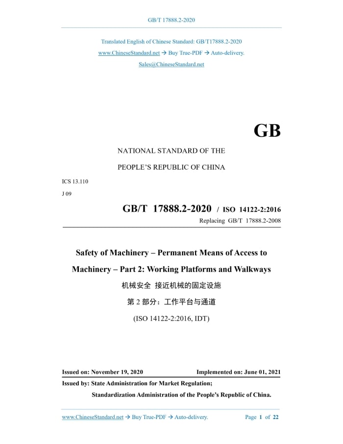 GB/T 17888.2-2020: Safety of machinery. Permanent means of access to machinery - Part 2: Working platforms and walkways Delivery: 9 seconds. True-PDF full-copy in English & invoice will be downloaded + auto-delivered via email. See step-by-step procedure Status: Valid GB/T 17888.2: Historical versions