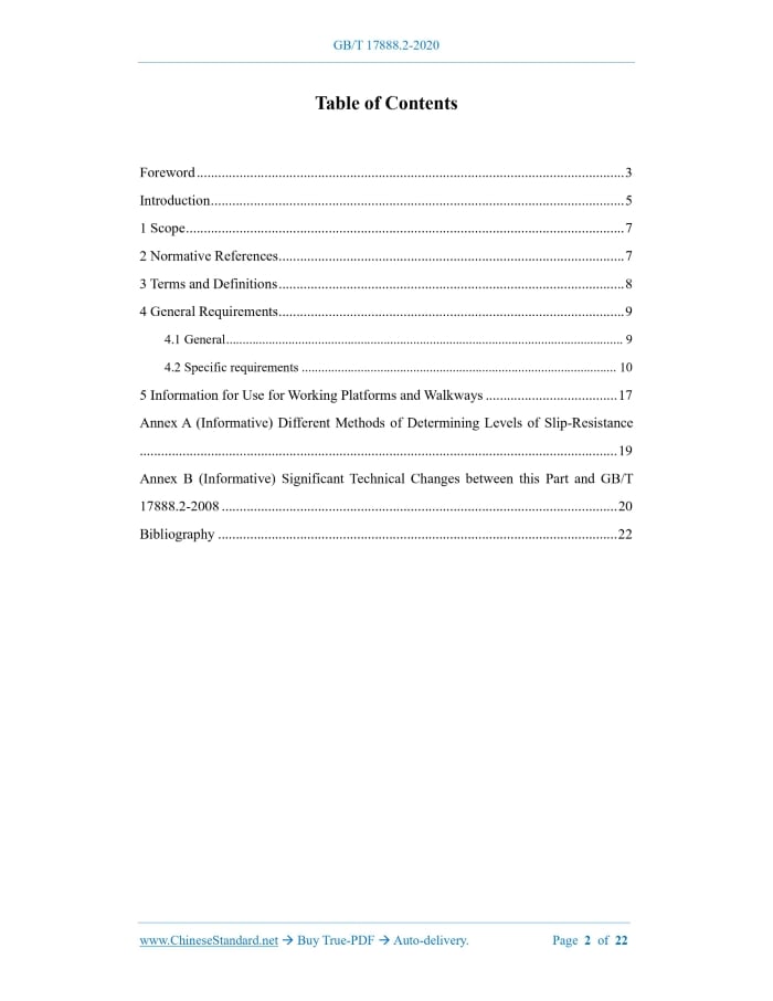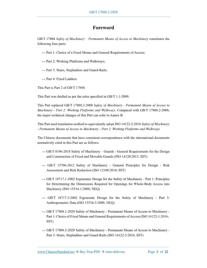 Similar standardsGB/T 17888.2-2020: Safety of machinery. Permanent means of access to machinery - Part 2: Working platforms and walkways---This is an excerpt. Full copy of true-PDF in English version (including equations, symbols, images, flow-chart, tables, and figures etc.), auto-downloaded/delivered in 9 seconds, can be purchased online: https://www.ChineseStandard.net/PDF.aspx/GBT17888.2-2020 GB NATIONAL STANDARD OF THE PEOPLE’S REPUBLIC OF CHINA ICS 13.110 J 09 GB/T 17888.2-2020 / ISO 14122-2:2016 Replacing GB/T 17888.2-2008 Safety of Machinery – Permanent Means of Access to Machinery – Part 2: Working Platforms and Walkways (ISO 14122-2:2016, IDT) ISSUED ON: NOVEMBER 19, 2020 IMPLEMENTED ON: JUNE 01, 2021 Issued by: State Administration for Market Regulation; Standardization Administration of the People’s Republic of China. Table of ContentsForeword ... 3 Introduction ... 5 1 Scope ... 7 2 Normative References ... 7 3 Terms and Definitions ... 8 4 General Requirements ... 9 4.1 General ... 9 4.2 Specific requirements ... 10 5 Information for Use for Working Platforms and Walkways ... 17 Annex A (Informative) Different Methods of Determining Levels of Slip-Resistance ... 19 Annex B (Informative) Significant Technical Changes between this Part and GB/T 17888.2-2008 ... 20 Bibliography ... 22ForewordGB/T 17888 Safety of Machinery – Permanent Means of Access to Machinery constitutes the following four parts: --- Part 1: Choice of a Fixed Means and General Requirements of Access; --- Part 2: Working Platforms and Walkways; --- Part 3: Stairs, Stepladders and Guard-Rails; --- Part 4: Fixed Ladders. This Part is Part 2 of GB/T 17888. This Part was drafted as per the rules specified in GB/T 1.1-2009. This Part replaced GB/T 17888.2-2008 Safety of Machinery - Permanent Means of Access to Machinery - Part 2: Working Platforms and Walkways. Compared with GB/T 17888.2-2008, the major technical changes of this Part can refer to Annex B. This Part used translation method to equivalently adopt ISO 14122-2:2016 Safety of Machinery - Permanent Means of Access to Machinery - Part 2: Working Platforms and Walkways. The Chinese documents that have consistent correspondence with the international documents normatively cited in this Part are as follows: --- GB/T 8196-2018 Safety of Machinery – Guards - General Requirements for the Design and Construction of Fixed and Movable Guards (ISO 14120:2015, IDT) --- GB/T 15706-2012 Safety of Machinery - General Principles for Design - Risk Assessment and Risk Reduction (ISO 12100:2010, IDT) --- GB/T 18717.1-2002 Ergonomic Design for the Safety of Machinery - Part 1: Principles for Determining the Dimensions Required for Openings for Whole-Body Access into Machinery (ISO 15534-1:2000, NEQ) --- GB/T 18717.3-2002 Ergonomic Design for the Safety of Machinery - Part 3: Anthropometric Data (ISO 15534-3:2000, NEQ) --- GB/T 17888.1-2020 Safety of Machinery - Permanent Means of Access to Machinery - Part 1: Choice of Fixed Means and General Requirements of Access (ISO 14122-1:2016, IDT) --- GB/T 17888.3-2020 Safety of Machinery - Permanent Means of Access to Machinery - Part 3: Stairs, Stepladders and Guard-Rails (ISO 14122-3:2016, IDT) --- GB/T 23821-2009 Safety of Machinery - Safety Distances to Prevent Hazard Zones Being Reached by Upper and Lower Limbs (ISO 13857:2008, IDT) This Part made the following editorial modifications: --- Change the symbol of the head height from h to e; --- Adjust the logical relationship of the specific requirements in 4.2.4.5.2 when the gap is greater than 20mm; --- Change the symbol of edge height from h to α in Figure 3. This Part was proposed by and under the jurisdiction of National Technical Committee on Mechanical Safety of Standardization Administration of China (SAC/TC 208). Drafting organizations of this Part: Ningbo Vichnet Technology Co., Ltd.; Zhangjiagang Zhonglei Industrial Co., Ltd.; Maanshan Chenxu Mechanical Produce Co., Ltd.; Suzhou Lihong Standardization Consulting Service Co., Ltd.; Zhengzhou Guizhu Industry and Trading Co., Ltd.; China Productivity Center for Machinery; Zhejiang Aopeng Industry and Trading Co., Ltd.; Tianjin Jinmao Group Co., Inc.; Wright Housewares Co., Ltd. Foshan; Shanghai Ruiju Metal Products Co., Ltd.; Shenyang Yongpan Metal Products Co., Ltd.; Nanjing Forestry University/National-Provincial Joint Engineering Research Center of Biomaterials for Electromechanical Product Packaging; Yancheng STG Safety Equipment Co., Ltd.; Fujian Minxuan Technology Co., Ltd.; Xiamen Yangmai Electric Co., Ltd.; Xi’an Yuntuo Electric Co., Ltd.; Suzhou Angoey Smart Safety Technologies Co., Ltd.; Shaanxi Guohongfu Testing Technology Co., Ltd.; Nan'an Zhongji Standardization Research Institute Co., Ltd.; Lihong Safety Engineering (Shanghai) Co., Ltd.; Zhejiang Anya Smart Technology Co., Ltd.; Quanzhou Association of Standardization; Xi'an Zhiheng Electrical Apparatus Technology Co., Ltd.; Jinhua Wangyuan Electronic Technology Co., Ltd.; and Suzhou Metrology and Testing Institute. Chief drafting staffs of this Part: Wen Lijun, Liu Yuan, Shi Liping, Wang Jiahao, Liu Zhiyong, Chen Miaoren, Li Qin, Liu Zhilong, Wang Shengjiang, Cai Qiang, Xiong Yuping, Zhu Bin, Liu Xiaolin, Wang Xuezhi, Fu Huiqing, Hu Youyu, Chen Mingzhne, Cai Baorong, Yang Yi, Ju Ronghua, Yao Jiayi, Cheng Hongbing, Liang Runxi, Qin Peijun, Yu Bo, Li Jie, Shen Dehong, Chen Jiaxing, Zhao Maocheng, Lin Hongsong, Hu Mingjun, Liu Ying, Li Liyan, Cai Binbin, Li Chunping, Chen Huiling, Cheng Sifu, Chen Dongmin, Dong Kaibo, Su Shiwei, Hou Hongying Chen Jiali, Jia Shuxu, Chen Zhuoxian, and Zhang Xiaofei. The historical editions replaced by this Part are as follows: --- GB 17888.2-1999, GB/T 17888.2-2008. Safety of Machinery – Permanent Means of Access to Machinery – Part 2: Working Platforms and Walkways1 ScopeThis Part of GB/T 17888 gives requirements for non-powered working platforms and walkways which are a part of a stationary machine, and to