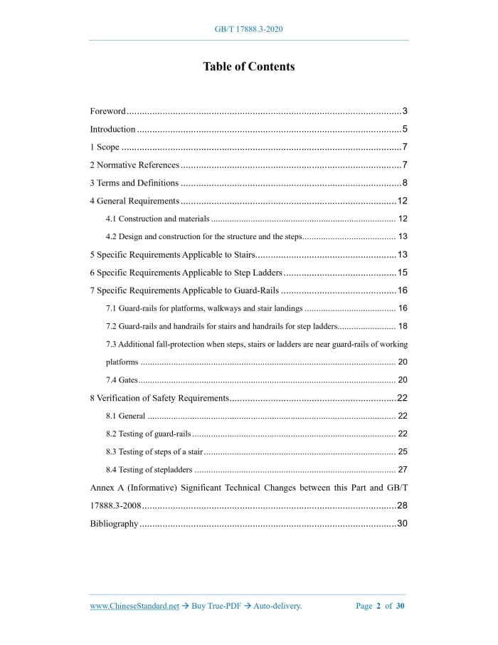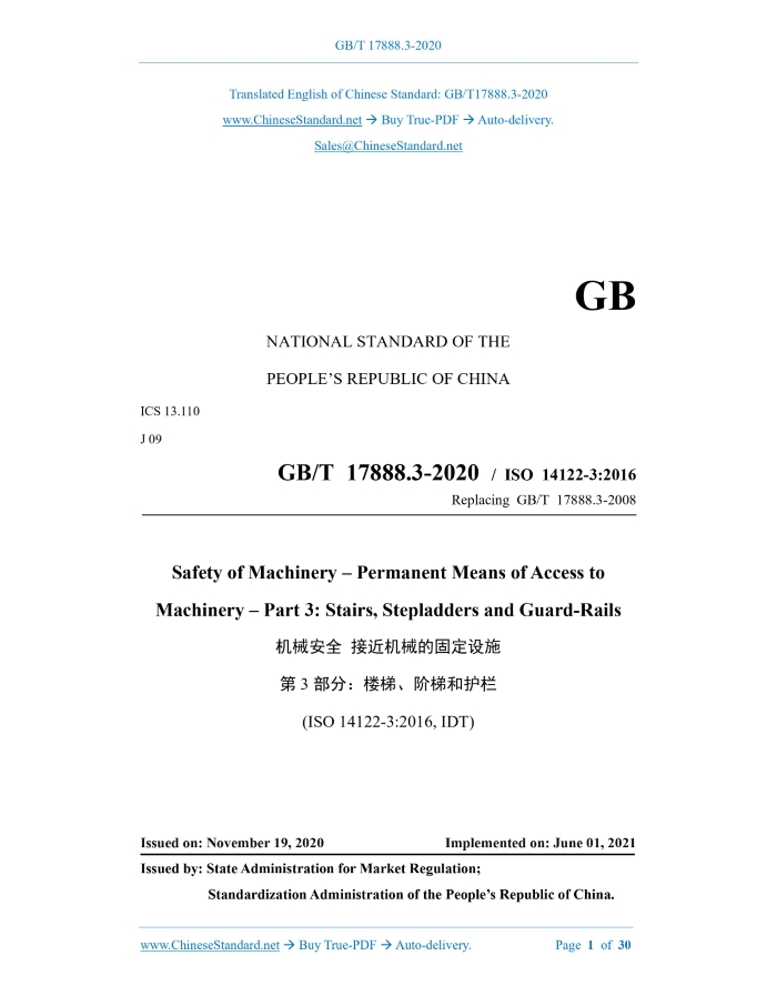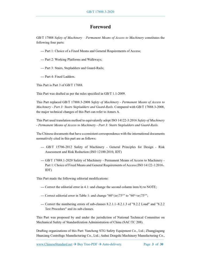 Similar standardsGB/T 17888.3-2020: Safety of machinery. Permanent means of access to machinery - Part 3: Stairs, stepladders and guard-rails---This is an excerpt. Full copy of true-PDF in English version (including equations, symbols, images, flow-chart, tables, and figures etc.), auto-downloaded/delivered in 9 seconds, can be purchased online: https://www.ChineseStandard.net/PDF.aspx/GBT17888.3-2020 GB NATIONAL STANDARD OF THE PEOPLE’S REPUBLIC OF CHINA ICS 13.110 J 09 GB/T 17888.3-2020 / ISO 14122-3:2016 Replacing GB/T 17888.3-2008 Safety of Machinery – Permanent Means of Access to Machinery – Part 3: Stairs, Stepladders and Guard-Rails (ISO 14122-3:2016, IDT) ISSUED ON: NOVEMBER 19, 2020 IMPLEMENTED ON: JUNE 01, 2021 Issued by: State Administration for Market Regulation; Standardization Administration of the People’s Republic of China. Table of ContentsForeword ... 3 Introduction ... 5 1 Scope ... 7 2 Normative References ... 7 3 Terms and Definitions ... 8 4 General Requirements ... 12 4.1 Construction and materials ... 12 4.2 Design and construction for the structure and the steps ... 13 5 Specific Requirements Applicable to Stairs ... 13 6 Specific Requirements Applicable to Step Ladders ... 15 7 Specific Requirements Applicable to Guard-Rails ... 16 7.1 Guard-rails for platforms, walkways and stair landings ... 16 7.2 Guard-rails and handrails for stairs and handrails for step ladders... 18 7.3 Additional fall-protection when steps, stairs or ladders are near guard-rails of working platforms ... 20 7.4 Gates ... 20 8 Verification of Safety Requirements ... 22 8.1 General ... 22 8.2 Testing of guard-rails ... 22 8.3 Testing of steps of a stair ... 25 8.4 Testing of stepladders ... 27 Annex A (Informative) Significant Technical Changes between this Part and GB/T 17888.3-2008 ... 28 Bibliography ... 30ForewordGB/T 17888 Safety of Machinery – Permanent Means of Access to Machinery constitutes the following four parts: --- Part 1: Choice of a Fixed Means and General Requirements of Access; --- Part 2: Working Platforms and Walkways; --- Part 3: Stairs, Stepladders and Guard-Rails; --- Part 4: Fixed Ladders. This Part is Part 3 of GB/T 17888. This Part was drafted as per the rules specified in GB/T 1.1-2009. This Part replaced GB/T 17888.3-2008 Safety of Machinery - Permanent Means of Access to Machinery - Part 3: Stairs Stepladders and Guard-Rails. Compared with GB/T 17888.3-2008, the major technical changes of this Part can refer to Annex A. This Part used translation method to equivalently adopt ISO 14122-3:2016 Safety of Machinery - Permanent Means of Access to Machinery - Part 3: Stairs Stepladders and Guard-Rails. The Chinese documents that have a consistent correspondence with the international documents normatively cited in this part are as follows: --- GB/T 15706-2012 Safety of Machinery - General Principles for Design - Risk Assessment and Risk Reduction (ISO 12100:2010, IDT) --- GB/T 17888.1-2020 Safety of Machinery - Permanent Means of Access to Machinery - Part 1: Choice of Fixed Means and General Requirements of Access (ISO 14122-1:2016, IDT) This Part made the following editorial modifications: --- Correct the editorial error in 4.1: and change the second column item b) to NOTE; --- Correct editorial error in Table 1: and change "60°≤α≤75°" to "60°< α≤75°"; --- Correct the numbering errors of sub-clauses 8.2.1.1~8.2.1.3 of "8.2.2 Load" and "8.2.2 Test Procedure" and its sub-clauses. This Part was proposed by and under the jurisdiction of National Technical Committee on Mechanical Safety of Standardization Administration of China (SAC/TC 208). Drafting organizations of this Part: Yancheng STG Safety Equipment Co., Ltd.; Zhangjiagang Huaxiang Centrifuge Manufacturing Co., Ltd.; Anhui Dengshi Machinery Manufacturing Co., Safety of Machinery – Permanent Means of Access to Machinery – Part 3: Stairs, Stepladders and Guard-Rails1 ScopeThis Part of GB/T 17888 gives requirements for non-powered stairs, stepladders and guard- rails which are a part of a stationary machine, and to the non-powered adjustable parts (e.g., foldable, slidable) and movable parts of those fixed means of access. NOTE 1: “Fixed” means of access are those mounted in such a manner (for example, by screws, nuts, welding) that they can only be removed by the use of tools. This Part specifies minimum requirements that also apply when the same means of access is required as the part of the building or civil construction (e.g., stairs, stepladders, guard-rails) where the machine is installed, on condition that the main function of that part of the construction is to provide a means of access to the machine. NOTE 2: Where no local regulation or standards exists, this part of ISO 14122 may be used also for means of access which are outside the scope of the standard. It is intended that this Part be used with GB/T 17888.1 to give the requirements for steps, stepladders, and guard-rails. The GB/T 17888 series as a whole is applicable to both stationary and mobile machinery where fixed means of access are necessary. It is not applicable to powered means of access such as lifts, escalators, or other devices specially designed to lift persons between two levels.2 Normative ReferencesThe following documents are essential to the application of this document. For the dated documents, only the versions with the dates indicated are applicable to this document; for the undated documents, only the latest version (including all the amendments) is applicable to this document. ISO 12100 Safety of Machinery – General Principles for Design – Risk Assessment and Risk Reduction ISO 14122-1:2016 Safety of Machinery – Permanent Means of Access to Machinery – Part 1: Choice of Fixed Means and General Requirements of Access ......Source: Above contents are excerpted from the full-copy PDF -- translated/reviewed by: www.ChineseStandard.net / Wayne Zheng et al. Tips & Frequently Asked Questions:Questi