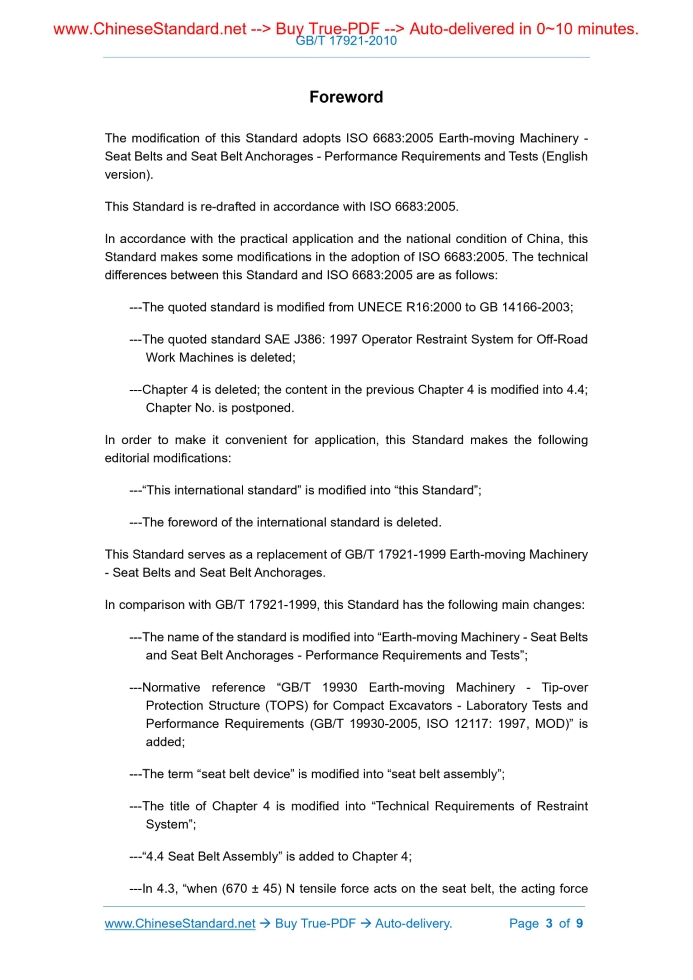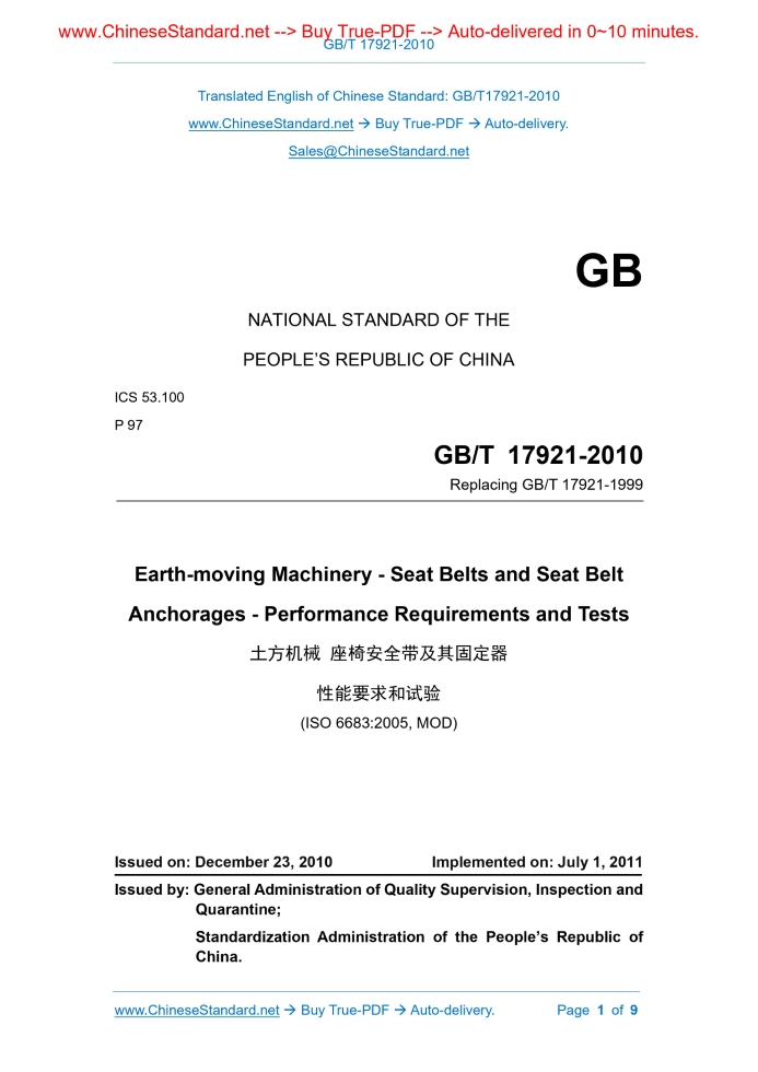 GB/T 17921-2010: Earth-moving machinery -- Seat belts and seat belt anchorages -- Performance requirements and tests Delivery: 9 seconds. True-PDF full-copy in English & invoice will be downloaded + auto-delivered via email. See step-by-step procedure Status: Valid GB/T 17921: Historical versions