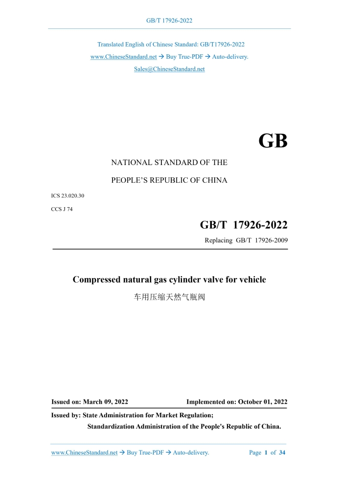 GB/T 17926-2022: Compressed natural gas cylinder valve for vehicle Delivery: 9 seconds. True-PDF full-copy in English & invoice will be downloaded + auto-delivered via email. See step-by-step procedure Status: Valid GB/T 17926: Historical versions