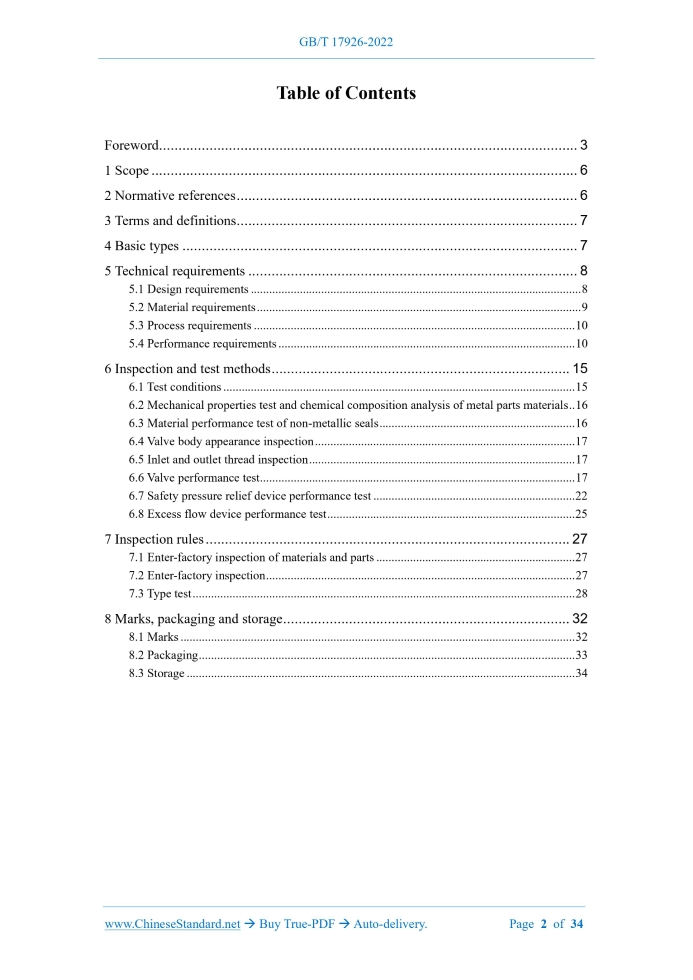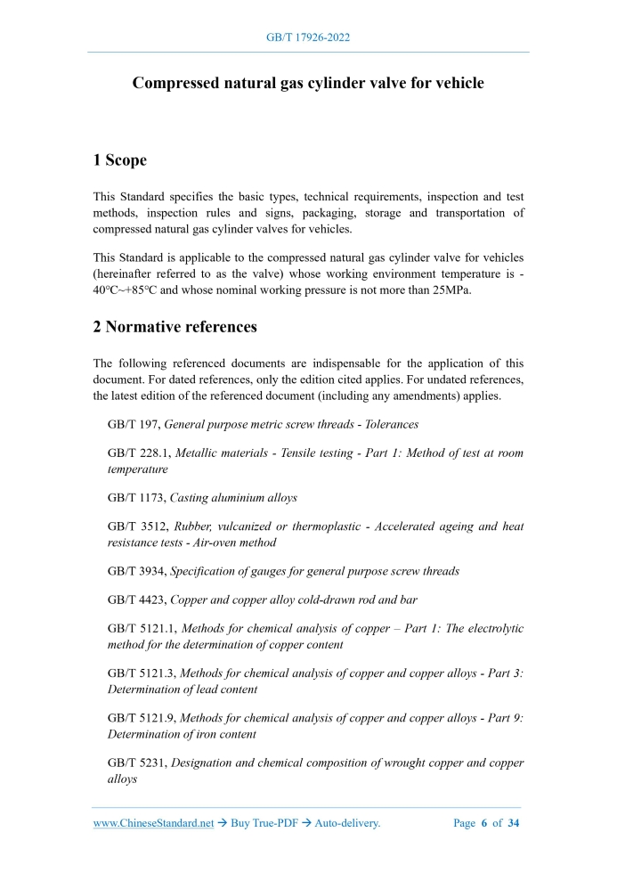 Similar standardsGB/T 17926-2022: Compressed natural gas cylinder valve for vehicle---This is an excerpt. Full copy of true-PDF in English version (including equations, symbols, images, flow-chart, tables, and figures etc.), auto-downloaded/delivered in 9 seconds, can be purchased online: https://www.ChineseStandard.net/PDF.aspx/GBT17926-2022NATIONAL STANDARD OF THE PEOPLE’S REPUBLIC OF CHINA ICS 23.020.30 CCS J 74 Replacing GB/T 17926-2009 Compressed natural gas cylinder valve for vehicle Issued on. MARCH 09, 2022 Implemented on. OCTOBER 01, 2022 Issued by. State Administration for Market Regulation; Standardization Administration of the People's Republic of China. Table of ContentsForeword... 3 1 Scope... 6 2 Normative references... 6 3 Terms and definitions... 7 4 Basic types... 7 5 Technical requirements... 8 5.1 Design requirements... 8 5.2 Material requirements... 9 5.3 Process requirements... 10 5.4 Performance requirements... 10 6 Inspection and test methods... 15 6.1 Test conditions... 15 6.2 Mechanical properties test and chemical composition analysis of metal parts materials.. 16 6.3 Material performance test of non-metallic seals... 16 6.4 Valve body appearance inspection... 17 6.5 Inlet and outlet thread inspection... 17 6.6 Valve performance test... 17 6.7 Safety pressure relief device performance test... 22 6.8 Excess flow device performance test... 25 7 Inspection rules... 27 7.1 Enter-factory inspection of materials and parts... 27 7.2 Enter-factory inspection... 27 7.3 Type test... 28 8 Marks, packaging and storage... 32 8.1 Marks... 32 8.2 Packaging... 33 8.3 Storage... 341 ScopeThis Standard specifies the basic types, technical requirements, inspection and test methods, inspection rules and signs, packaging, storage and transportation of compressed natural gas cylinder valves for vehicles. This Standard is applicable to the compressed natural gas cylinder valve for vehicles (hereinafter referred to as the valve) whose working environment temperature is - 40℃~+85℃ and whose nominal working pressure is not more than 25MPa.2 Normative referencesThe following referenced documents are indispensable for the application of this document. For dated references, only the edition cited applies. For undated references, the latest edition of the referenced document (including any amendments) applies. GB/T 197, General purpose metric screw threads - Tolerances GB/T 228.1, Metallic materials - Tensile testing - Part 1.Method of test at room temperature GB/T 1173, Casting aluminium alloys GB/T 3512, Rubber, vulcanized or thermoplastic - Accelerated ageing and heat resistance tests - Air-oven method GB/T 3934, Specification of gauges for general purpose screw threads GB/T 4423, Copper and copper alloy cold-drawn rod and bar GB/T 5121.1, Methods for chemical analysis of copper – Part 1.The electrolytic method for the determination of copper content GB/T 5121.3, Methods for chemical analysis of copper and copper alloys - Part 3. Determination of lead content3 Terms and definitionsFor the purposes of this document, the terms and definitions defined in GB/T 8337, GB/T 13005, GB/T 16918, GB/T 33215 as well as the followings apply. 3.1 excess flow device a device that can act and limit the gas flow when the gas flow or the pressure difference between the inlet and outlet exceeds the set value4 Basic types4.1 The opening-closing type of the valve is manual control. 4.2 The valve shall have a safety relief device (pressure relief device; PRD). Its type is a bursting disc-fusible alloy plug series composite device. 4.3 According to the requirements of use, a flow restricting device can be set on the valve. 4.4 Model indication method. The valve model shall consist of the following parts. The code of the compressed natural gas cylinder valve for vehicles is represented by "CTF".5 Technical requirements5.1 Design requirements 5.1.1 The connection thread specification of the air inlet of the valve shall be PZ27.8 taper thread or M25×2 ordinary thread. 5.1.5 The excess flow device shall be designed with a bypass channel. 5.1.6 The valve shall specify the design service life. Valves are designed for at least one cylinder inspection cycle. 5.2 Material requirements 5.2.1 Metal part material 5.2.2 Non-metallic seal material 5.2.2.1 Oxygen aging resistance The non-metallic seals shall be kept for 96h continuously in oxygen with a temperature of 70℃±5℃, a test pressure of 2MPa and a purity of ≥99.5%, and there shall be no visible cracks and damages. 5.3 Process requirements 5.3.1 The valve body shall be forged. There shall be no defects such as cracks, wrinkles, inclusions, porosity, shrinkage holes, and underfills on the surface that would impair valve performance. When the shot blasting process is used on the surface of the valve body, the size and depth of the pits on the surface shall be uniform. 5.4 Performance requirements 5.4.1 Valve performance 5.4.1.1 Open and close At the nominal working pressure, the valve shall be able to fully open and close according to the temperature and test torque specified in Table 1. 5.4.1.2 Excess torque resistance The threads connecting the inlet and outlet of the valve to external parts shall bear the following excess torque. 5.4.2 Safety pressure relief device performance 5.4.2.1 Extrusion resistance After holding the pressure for 30 minutes at 1.2 times the nominal working pressure, increase the pressure to 2.25 times the nominal working pressure at a rate of 0.5MPa/s, and the fusible alloy of PRD shall not be extruded. 5.4.3.2 Pressure pulse Apply the nominal working pressure to the air inlet and air outlet of the excess flow device respectively and perform 100 pulses each, which shall meet the requirements of 5.4.3.3. 5.4.3.3 Flow limiting When the pressure difference between the two ends of the inlet and outlet of the excess flow device exceeds 0.65 MPa, the excess flow device shall be able to act and restrict the flow. When the pressure diff