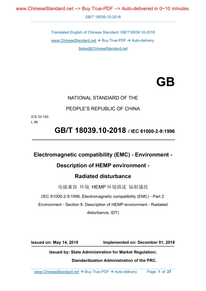 GB/T 18039.10-2018: Electromagnetic compatibility (EMC) -- Environment -- Description of HEMP environment -- Radiated disturbance Delivery: 9 seconds. True-PDF full-copy in English & invoice will be downloaded + auto-delivered via email. See step-by-step procedure Status: Valid