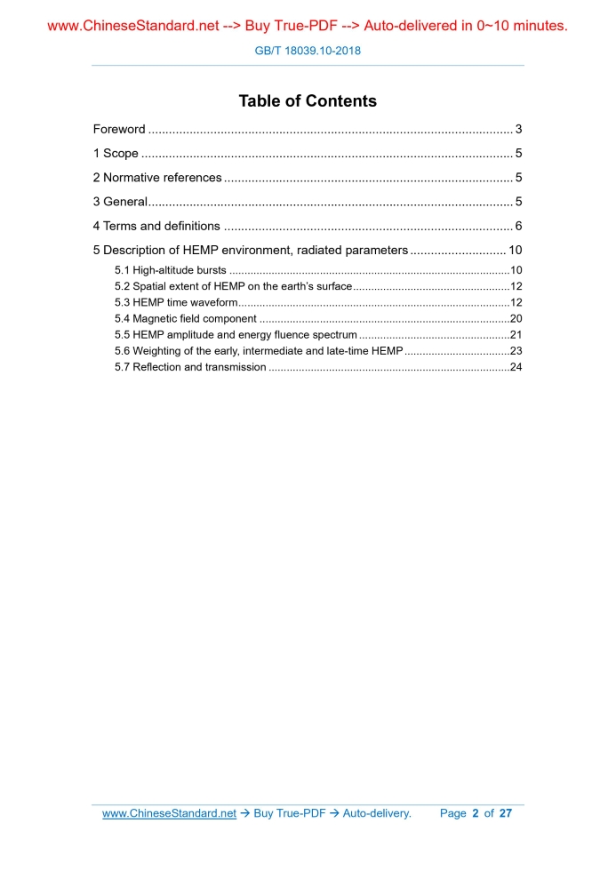 Similar standardsGB/T 18039.10-2018: Electromagnetic compatibility (EMC) -- Environment -- Description of HEMP environment -- Radiated disturbance---This is an excerpt. Full copy of true-PDF in English version (including equations, symbols, images, flow-chart, tables, and figures etc.), auto-downloaded/delivered in 9 seconds, can be purchased online: https://www.ChineseStandard.net/PDF.aspx/GBT18039.10-2018 Electromagnetic compatibility(EMC)--Environment--Description of HEMP environment--Radiated disturbance ICS 33.100 L06 National Standards of People's Republic of China Electromagnetic compatibility environment HEMP environment describes radiated disturbance [IEC 61000-2-9.1996, Electromagneticcompatibility (EMC)- Part 2.Environment-Section9. DescriptionofHEMPenvironment- Radiateddisturbance, IDT] Published on.2018-05-14 2018-12-01 implementation State market supervision and administration China National Standardization Administration issued Content Foreword III 1 Scope 1 2 Normative references 1 3 Overview 1 4 Terms and Definitions 1 5 Description of high-altitude electromagnetic pulse environment, radiation parameter 4 5.1 High-altitude nuclear explosion 4 5.2 HEMP on the ground scope 5 5.3 HEMP Time Domain Waveform 6 5.4 Magnetic field component 11 5.5 HEMP amplitude spectrum and energy fluence spectrum 11 5.6 Impact weights of early, intermediate and late HEMPs 13 5.7 Reflection and Transmission 13 ForewordThe Electromagnetic Compatibility Environment is divided into the following sections. ---GB /Z 18039.1-2000 Classification of electromagnetic environment in electromagnetic compatibility environment; ---GB /Z 18039.2-2000 Electromagnetic compatibility environment industrial equipment power supply low frequency conducted disturbance emission level assessment; ---GB/T 18039.3-2017 Electromagnetic compatibility environment common low-voltage power supply system low-frequency conduction disturbance and signal transmission Capacity level ---GB/T 18039.4-2017 Compatibility level of low frequency conducted disturbance in electromagnetic compatibility environment factory; ---GB /Z 18039.5-2003 Electromagnetic compatibility environment public power supply system low frequency conduction disturbance and electromagnetic transmission of signal transmission surroundings; ---GB /Z 18039.6-2005 Electromagnetic compatibility environment Low frequency magnetic field in various environments; ---GB /Z 18039.7-2011 Electromagnetic compatibility environment, voltage sag, short-term interruption and its measurement system Counting results ---GB/T 18039.8-2012 Electromagnetic compatibility environment High altitude nuclear electromagnetic pulse (HEMP) environment describes conducted disturbance; ---GB/T 18039.9-2013 Electromagnetic compatibility environment common medium voltage power supply system low frequency conduction disturbance and signal transmission Capacity level This part is the 10th part of GB/T 18039. This part is drafted in accordance with the rules given in GB/T 1.1-2009. This section uses the translation method equivalent to IEC 61000-2-9.1996 Electromagnetic Compatibility (EMC) Part 2. Environment Section 9. The HEMP environment describes radiated disturbances. This section has made the following editorial changes. --- In line with the existing standard series, change the name of this part to "Electromagnetic compatibility environment HEMP environment describes radiated disturbance". --- According to the original meaning, move the formula in the upper left corner of the original picture 5 to the footnote of Figure 5. --- According to Chinese writing habits, the explanatory text of the original texts 14a), 14b) is placed before the figure in Figure 14. --- According to the Chinese writing habits, the explanatory text of the original text 15 is placed before the figure in Fig. 15. --- According to Chinese writing habits, the explanatory text of the original texts 16a), 16b) is placed before the figure in Figure 16. This part is proposed and managed by the National Electromagnetic Compatibility Standardization Technical Committee (SAC/TC246). This section was drafted by. Tsinghua University. The main drafters of this section. Meng Cui, Li Xin, Tan Zhaojie, Fan Yafang. Electromagnetic compatibility environment HEMP environment describes radiated disturbance1 ScopeThis part of the Electromagnetic Compatibility Environment defines a high altitude electromagnetic pulse (HEMP) environment, one of the effects of high altitude nuclear explosions. There are two situations to consider when studying this topic. ---High altitude nuclear explosion; --- Low-altitude nuclear explosion. For civilian systems, the most serious situation is a high-altitude nuclear explosion. In this case, other effects of nuclear explosions, such as explosions, Ground impact, heat radiation and ionizing radiation will not affect the ground. However, electromagnetic pulses generated by nuclear explosions may cause communication systems. Damage and destruction of the system, electronics and power systems, which in turn affects the stability of modern society. The purpose of this section is to establish a general reference for the HEMP environment, to select the actual environmental parameters for sensitive devices, and to evaluate their sensitivity. Sensitivity.2 Normative referencesThe following documents are indispensable for the application of this document. For dated references, only dated versions apply to this article. Pieces. For undated references, the latest edition (including all amendments) applies to this document. GB/T 4365-2003 Electrotechnical terminology electromagnetic compatibility [idtIEC 60050 (161)..1990]3 OverviewHigh-altitude (above 30km) nuclear explosions produce three types of electromagnetic pulses that can be observed on the Earth's surface. --- Early high altitude electromagnetic pulse (fast); --- Medium-term high altitude electromagnetic pulse (medium); --- Late high altitude electromagnetic puls