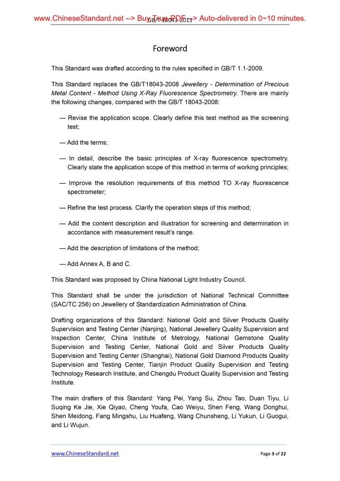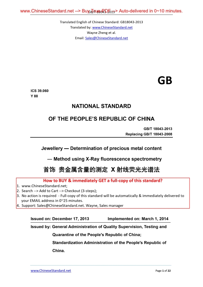 Similar standardsGB/T 18043-2013: Jewellery -- Determination of precious metal content -- Method using X-ray fluorescence spectrometry---This is an excerpt. Full copy of true-PDF in English version (including equations, symbols, images, flow-chart, tables, and figures etc.), auto-downloaded/delivered in 9 seconds, can be purchased online: https://www.ChineseStandard.net/PDF.aspx/GBT18043-2013 GB18043‐2013 Wayne Zheng et al. GB ICS 39.060 Y 88 NATIONAL STANDARD GB/T 18043-2013 Replacing GB/T 18043-2008 Jewellery — Determination of precious metal content — Method using X-Ray fluorescence spectrometry Issued on. DECEMBER 17, 2013 Implemented on. MARCH 1, 2014 Issued by. General Administration of Quality Supervision, Testing and Quarantine of the People's Republic of China; Standardization Administration of the People's Republic of China. Table of ContentsForeword... 3 Introduction... 5 1 Scope... 6 2 Normative references... 6 3 Terms and definitions... 6 4 Method and principle... 7 5 Instruments and equipment... 7 6 Test method... 7 7 Factors that affect the measurement results... 8 8 Processing of measurement results... 9 9 Limitations... 9 Annex A... 11 Annex B... 12 Annex C... 20ForewordThis Standard was drafted according to the rules specified in GB/T 1.1-2009. This Standard replaces the GB/T18043-2008 Jewellery - Determination of Precious Metal Content - Method Using X-Ray Fluorescence Spectrometry. There are mainly the following changes, compared with the GB/T 18043-2008. — Revise the application scope. Clearly define this test method as the screening test; — Add the terms; — In detail, describe the basic principles of X-ray fluorescence spectrometry. Clearly state the application scope of this method in terms of working principles; — Improve the resolution requirements of this method TO X-ray fluorescence spectrometer; — Refine the test process. Clarify the operation steps of this method; — Add the content description and illustration for screening and determination in accordance with measurement result’s range. — Add the description of limitations of the method; — Add Annex A, B and C. This Standard was proposed by China National Light Industry Council. This Standard shall be under the jurisdiction of National Technical Committee (SAC/TC 256) on Jewellery of Standardization Administration of China. Drafting organizations of this Standard. National Gold and Silver Products Quality Supervision and Testing Center (Nanjing), National Jewellery Quality Supervision and Inspection Center, China Institute of Metrology, National Gemstone Quality Supervision and Testing Center, National Gold and Silver Products Quality Supervision and Testing Center (Shanghai), National Gold Diamond Products Quality Supervision and Testing Center, Tianjin Product Quality Supervision and Testing Technology Research Institute, and Chengdu Product Quality Supervision and Testing Institute. The main drafters of this Standard. Yang Pei, Yang Su, Zhou Tao, Duan Tiyu, Li Suqing Ke Jie, Xie Qiyao, Cheng Youfa, Cao Weiyu, Shen Feng, Wang Donghui, Shen Meidong, Fang Mingshu, Liu Huafeng, Wang Chunsheng, Li Yukun, Li Guogui, and Li Wujun. The previous editions replaced by this Standard are as follows. — GB/T 18043-2000, GB/T 18043-2008.IntroductionThe test laboratory that uses this Standard is required to develop implementation details such as - personnel, facilities and environmental conditions, equipment (including working reference materials), and uncertainty evaluation. During use of this Standard, it is necessary to refer to Annex A, Annex B, and Annex C to perform sample testing, data processing, and result determination. Jewellery — Determination of precious metal content — Method using X-Ray fluorescence spectrometry1 ScopeThis Standard specifies the methods and requirements for applying X-ray fluorescence spectrometry to determine the precious metal content in jewellery. This Standard applies to qualitative analysis for jewellery and other art-wares. And it also applies to the screening test of precious metal content (gold, silver, platinum, and palladium) in jewellery and other art-wares.2 Normative referencesThe articles contained in the following documents have become part of this document when they are quoted herein. For the dated documents so quoted, all the modifications (Including all corrections) or revisions made thereafter shall be applicable to this document. GB 11887 Jewellery - Fineness of precious metal alloys and designation3 Terms and definitionsFor the purpose of this document, the following terms and definitions shall apply. 3.1 Screening A kind of analysis method that preliminarily quantifies the element’s content in the substance to be tested.4 Method and principleThrough X-ray excitation (penetration thickness is typically a few microns to tens of microns), the elements on surface layer of jewellery can emit characteristic X-ray fluorescence spectrum. Perform the qualitative analysis according to the characteristic spectrum lines (energy or wavelength).5 Instruments and equipment5.1 X-ray fluorescence spectrometer. Peak of manganese at 5.89 keV energy position - its resolution is better than 170 eV.6 Test method6.1 Instrument calibration Calibration shall be conducted periodically in accordance with the specific requirements for instruments. 6.2 Test conditions 6.3 Test method 6.3.1 Check sample varieties, imprinting, appearance and other properties. 6.3.2 Conduct qualitative analysis to determine the composition of principal elements and impurity elements. 6.3.3 According to the results of qualitative analysis, select the reference materials whose purity level basically matches with the impurity components’. Each reference materials shall be measured for three times at least. Obtain the average value after repeated measurements. Use the standard values and the corresponding average values of each element’s content AS the parameters. Draw the correction c