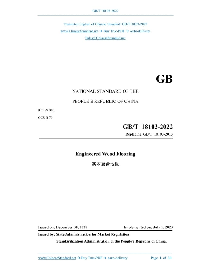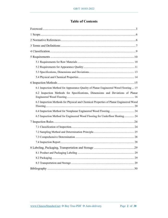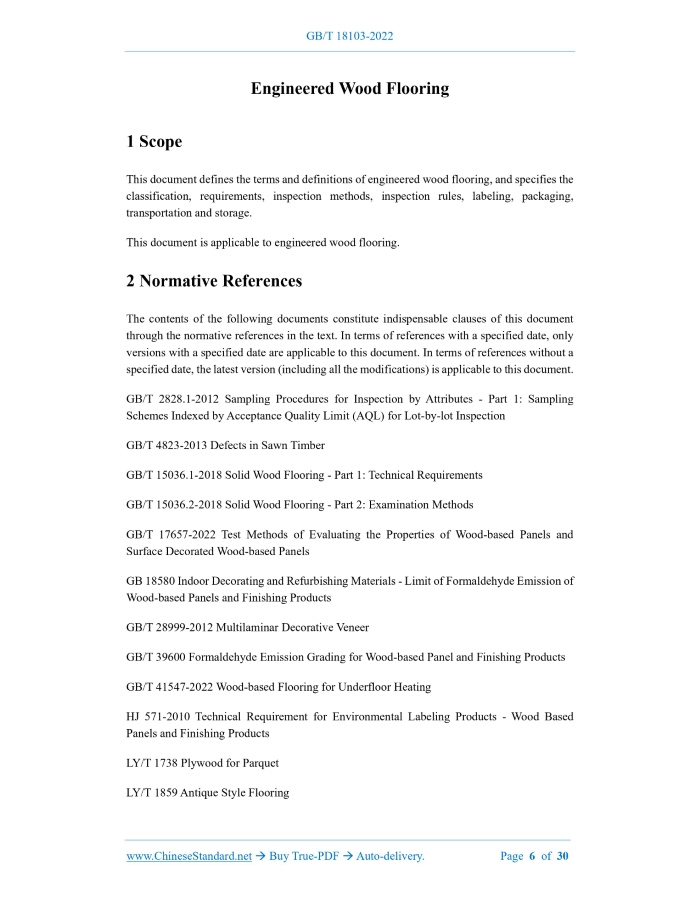 Similar standardsGB/T 18103-2022: Engineered wood flooring---This is an excerpt. Full copy of true-PDF in English version (including equations, symbols, images, flow-chart, tables, and figures etc.), auto-downloaded/delivered in 9 seconds, can be purchased online: https://www.ChineseStandard.net/PDF.aspx/GBT18103-2022GB NATIONAL STANDARD OF THE PEOPLE’S REPUBLIC OF CHINA ICS 79.080 CCS B 70 Replacing GB/T 18103-2013 Engineered Wood Flooring Issued on. DECEMBER 30, 2022 Implemented on. JULY 1, 2023 Issued by. State Administration for Market Regulation; Standardization Administration of the People’s Republic of China. Table of ContentsForeword... 3 1 Scope... 6 2 Normative References... 6 3 Terms and Definitions... 7 4 Classification... 9 5 Requirements... 10 5.1 Requirements for Raw Materials... 10 5.2 Requirements for Appearance Quality... 11 5.3 Specifications, Dimensions and Deviations... 13 5.4 Physical and Chemical Properties... 14 6 Inspection Methods... 15 6.1 Inspection Method for Appearance Quality of Planar Engineered Wood Flooring... 15 6.2 Inspection Methods for Specifications, Dimensions and Deviations of Planar Engineered Wood Flooring... 16 6.3 Inspection Methods for Physical and Chemical Properties of Planar Engineered Wood Flooring... 20 6.4 Inspection Method for Nonplanar Engineered Wood Flooring... 24 6.5 Inspection Method for Engineered Wood Flooring for Underfloor Heating... 24 7 Inspection Rules... 24 7.1 Classification of Inspection... 24 7.2 Sampling Method and Determination Principle... 25 7.3 Comprehensive Determination... 28 7.4 Inspection Report... 28 8 Labeling, Packaging, Transportation and Storage... 29 8.1 Product and Packaging Labeling... 29 8.2 Packaging... 29 8.3 Transportation and Storage... 29 Bibliography... 301 ScopeThis document defines the terms and definitions of engineered wood flooring, and specifies the classification, requirements, inspection methods, inspection rules, labeling, packaging, transportation and storage. This document is applicable to engineered wood flooring.2 Normative ReferencesThe contents of the following documents constitute indispensable clauses of this document through the normative references in the text. In terms of references with a specified date, only versions with a specified date are applicable to this document. In terms of references without a specified date, the latest version (including all the modifications) is applicable to this document. GB/T 2828.1-2012 Sampling Procedures for Inspection by Attributes - Part 1.Sampling Schemes Indexed by Acceptance Quality Limit (AQL) for Lot-by-lot Inspection GB/T 4823-2013 Defects in Sawn Timber GB/T 15036.1-2018 Solid Wood Flooring - Part 1.Technical Requirements GB/T 15036.2-2018 Solid Wood Flooring - Part 2.Examination Methods GB/T 17657-2022 Test Methods of Evaluating the Properties of Wood-based Panels and Surface Decorated Wood-based Panels GB 18580 Indoor Decorating and Refurbishing Materials - Limit of Formaldehyde Emission of Wood-based Panels and Finishing Products GB/T 28999-2012 Multilaminar Decorative Veneer GB/T 39600 Formaldehyde Emission Grading for Wood-based Panel and Finishing Products GB/T 41547-2022 Wood-based Flooring for Underfloor Heating HJ 571-2010 Technical Requirement for Environmental Labeling Products - Wood Based Panels and Finishing Products3 Terms and DefinitionsWhat is defined in GB/T 4823-2013, and the following terms and definitions are applicable to this document. 3.1 engineered wood flooring Flooring made of solid wood panels or veneers (including restructured decorative veneers) as the panel, solid wood panels, veneers or plywood as the core layer or bottom layer, and laminated in different combinations. 3.2 two-layer engineered wood flooring Two-layer-structured solid wood composite flooring with solid wood panels or veneers (including restructured decorative veneers) as the panel, and solid wood panels or veneers as the bottom layer. 3.3 three-layer engineered wood flooring Three-layer-structured solid wood composite flooring with solid wood panels or veneers (including restructured decorative veneers) as the panel, and solid wood panels as the core layer and veneers as the bottom layer. 3.4 multi-layer engineered wood flooring Multi-layer (with more than 3 layers) structured solid wood composite flooring with solid wood panels or veneers (including restructured decorative veneers) as the panel, and plywood as the base material, or solid wood panels or veneers (including restructured decorative veneers) as the panel, and solid wood panels or veneers as the core layer or bottom layer. 3.5 nonplanar engineered wood flooring Solid wood composite flooring with uneven surfaces, such as. saw marks and drawings, etc. 3.6 classic tongue-and-groove joint engineered wood flooring Solid wood composite flooring with right-angled tenons and grooves on the sides and ends.4 Classification4.1 Classification in accordance with the panel material. 4.2 Classification in accordance with the structure. 4.3 Classification in accordance with the coating mode. 4.4 Classification in accordance with the surface shape. 4.5 Classification in accordance with whether it is suitable for ground radiant heating places. 4.6 Classification in accordance with whether it is locked and spliced.5 Requirements5.1 Requirements for Raw Materials 5.1.1 Panel 5.1.2 Solid wood panel 5.1.2.1 The wood species for the core layer of flooring in the same batch shall be of the same species or have similar properties. 5.1.2.2 The gap between the core-layer laths shall not be greater than 3 mm. 5.1.3 Plywood for engineered wood flooring It shall comply with the stipulations of LY/T 1738. 5.2 Requirements for Appearance Quality 5.2.1 Appearance quality of planar engineered wood flooring The appearance quality of planar engineered wood flooring shall comply with the stipulations of Table 1.Specifically speaking, the front-side appearance quality of engineered wood flooring with restr