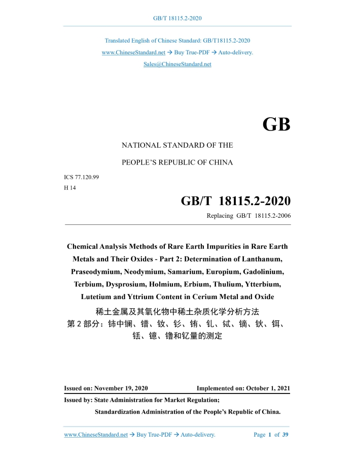 GB/T 18115.2-2020: Chemical analysis methods of rare earth impurities in rare earth metals and their oxides - Part 2: Determination of lanthanum, praseodymium, neodymium, samarium, europium, gadolinium, terbium, dysprosium, holmium, erbium, thulium, ytterbium, lutetium and yttrium contents Delivery: 9 seconds. True-PDF full-copy in English & invoice will be downloaded + auto-delivered via email. See step-by-step procedure Status: Valid GB/T 18115.2: Historical versions