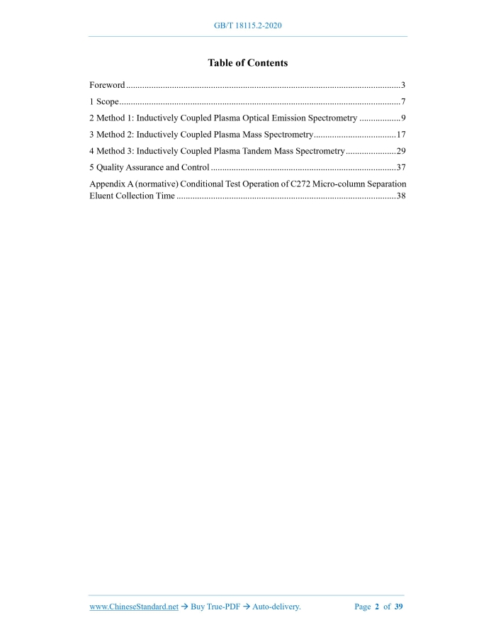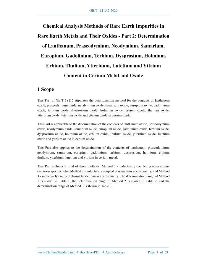 Similar standardsGB/T 18115.2-2020: Chemical analysis methods of rare earth impurities in rare earth metals and their oxides - Part 2: Determination of lanthanum, praseodymium, neodymium, samarium, europium, gadolinium, terbium, dysprosium, holmium, erbium, thulium, ytterbium, lutetium and yttrium contents---This is an excerpt. Full copy of true-PDF in English version (including equations, symbols, images, flow-chart, tables, and figures etc.), auto-downloaded/delivered in 9 seconds, can be purchased online: https://www.ChineseStandard.net/PDF.aspx/GBT18115.2-2020 GB NATIONAL STANDARD OF THE PEOPLE’S REPUBLIC OF CHINA ICS 77.120.99 H 14 Replacing GB/T 18115.2-2006 Chemical Analysis Methods of Rare Earth Impurities in Rare Earth Metals and Their Oxides - Part 2: Determination of Lanthanum, Praseodymium, Neodymium, Samarium, Europium, Gadolinium, Terbium, Dysprosium, Holmium, Erbium, Thulium, Ytterbium, Lutetium and Yttrium Content in Cerium Metal and Oxide ISSUED ON: NOVEMBER 19, 2020 IMPLEMENTED ON: OCTOBER 1, 2021 Issued by: State Administration for Market Regulation; Standardization Administration of the People’s Republic of China. Table of ContentsForeword ... 3 1 Scope ... 7 2 Method 1: Inductively Coupled Plasma Optical Emission Spectrometry ... 9 3 Method 2: Inductively Coupled Plasma Mass Spectrometry ... 17 4 Method 3: Inductively Coupled Plasma Tandem Mass Spectrometry ... 29 5 Quality Assurance and Control ... 37 Appendix A (normative) Conditional Test Operation of C272 Micro-column Separation Eluent Collection Time ... 38 Chemical Analysis Methods of Rare Earth Impurities in Rare Earth Metals and Their Oxides - Part 2: Determination of Lanthanum, Praseodymium, Neodymium, Samarium, Europium, Gadolinium, Terbium, Dysprosium, Holmium, Erbium, Thulium, Ytterbium, Lutetium and Yttrium Content in Cerium Metal and Oxide1 ScopeThis Part of GB/T 18115 stipulates the determination method for the contents of lanthanum oxide, praseodymium oxide, neodymium oxide, samarium oxide, europium oxide, gadolinium oxide, terbium oxide, dysprosium oxide, holmium oxide, erbium oxide, thulium oxide, ytterbium oxide, lutetium oxide and yttrium oxide in cerium oxide. This Part is applicable to the determination of the contents of lanthanum oxide, praseodymium oxide, neodymium oxide, samarium oxide, europium oxide, gadolinium oxide, terbium oxide, dysprosium oxide, holmium oxide, erbium oxide, thulium oxide, ytterbium oxide, lutetium oxide and yttrium oxide in cerium oxide. This Part also applies to the determination of the contents of lanthanum, praseodymium, neodymium, samarium, europium, gadolinium, terbium, dysprosium, holmium, erbium, thulium, ytterbium, lutetium and yttrium in cerium metal. This Part includes a total of three methods: Method 1 - inductively coupled plasma atomic emission spectrometry, Method 2 - inductively coupled plasma mass spectrometry, and Method 3 - inductively coupled plasma tandem mass spectrometry. The determination range of Method 1 is shown in Table 1, the determination range of Method 2 is shown in Table 2, and the determination range of Method 3 is shown in Table 3. temperature, then, cool to room temperature; transfer the solution into a 100 mL volumetric flask, use water to dilute to the scale and mix it well. 1 mL of this solution contains 1 mg of lanthanum oxide. 2.2.6 Standard stock solution of praseodymium oxide: weigh-take 0.1000 g of praseodymium oxide [w (Pr6O11/REO) 99.999%, w (REO) 99.5%] that has been burned at 950 C for 1 hour, place it in a 100 mL beaker, add 10 mL of hydrochloric acid (2.2.2); heat to dissolve it at a low temperature, then, cool to room temperature; transfer the solution into a 100 mL volumetric flask, use water to dilute to the scale and mix it well. 1 mL of this solution contains 1 mg of praseodymium oxide. 2.2.7 Standard stock solution of neodymium oxide: weigh-take 0.1000 g of neodymium oxide [w (Nd2O3/REO) 99.999%, w (REO) 99.5%] that has been burned at 950 C for 1 hour, place it in a 100 mL beaker, add 10 mL of hydrochloric acid (2.2.2); heat to dissolve it at a low temperature, then, cool to room temperature; transfer the solution into a 100 mL volumetric flask, use water to dilute to the scale and mix it well. 1 mL of this solution contains 1 mg of neodymium oxide. 2.2.8 Standard stock solution of samarium oxide: weigh-take 0.1000 g of samarium oxide [w (Sm2O3/REO) 99.999%, w (REO) 99.5%] that has been burned at 950 C for 1 hour, place it in a 100 mL beaker, add 10 mL of hydrochloric acid (2.2.2); heat to dissolve it at a low temperature, then, cool to room temperature; transfer the solution into a 100 mL volumetric flask, use water to dilute to the scale and mix it well. 1 mL of this solution contains 1 mg of samarium oxide. 2.2.9 Standard stock solution of europium oxide: weigh-take 0.1000 g of europium oxide [w (Eu2O3/REO) 99.999%, w (REO) 99.5%] that has been burned at 950 C for 1 hour, place it in a 100 mL beaker, add 10 mL of hydrochloric acid (2.2.2); heat to dissolve it at a low temperature, then, cool to room temperature; transfer the solution into a 100 mL volumetric flask, use water to dilute to the scale and mix it well. 1 mL of this solution contains 1 mg of europium oxide. 2.2.10 Standard stock solution of gadolinium oxide: weigh-take 0.1000 g of gadolinium oxide [w (Gd2O3/REO) 99.999%, w (REO) 99.5%] that has been burned at 950 C for 1 hour, place it in a 100 mL beaker, add 10 mL of hydrochloric acid (2.2.2); heat to dissolve it at a low temperature, then, cool to room temperature; transfer the solution into a 100 mL volumetric flask, use water to dilute to the scale and mix it well. 1 mL of this solution contains 1 mg of gadolinium oxide. 2.2.11 Standard stock solution of terbium oxide: weigh-take 0.1000 g of terbium oxide [w (Tb4O7/REO) 99.999%, w (REO) 99.5%] that has been burned at 950 C for 1 hour, place it in a 100 mL beaker, add 10 mL of nitric acid (2.2.3), add 10 mL of hydrogen peroxide (2.2.1); heat t