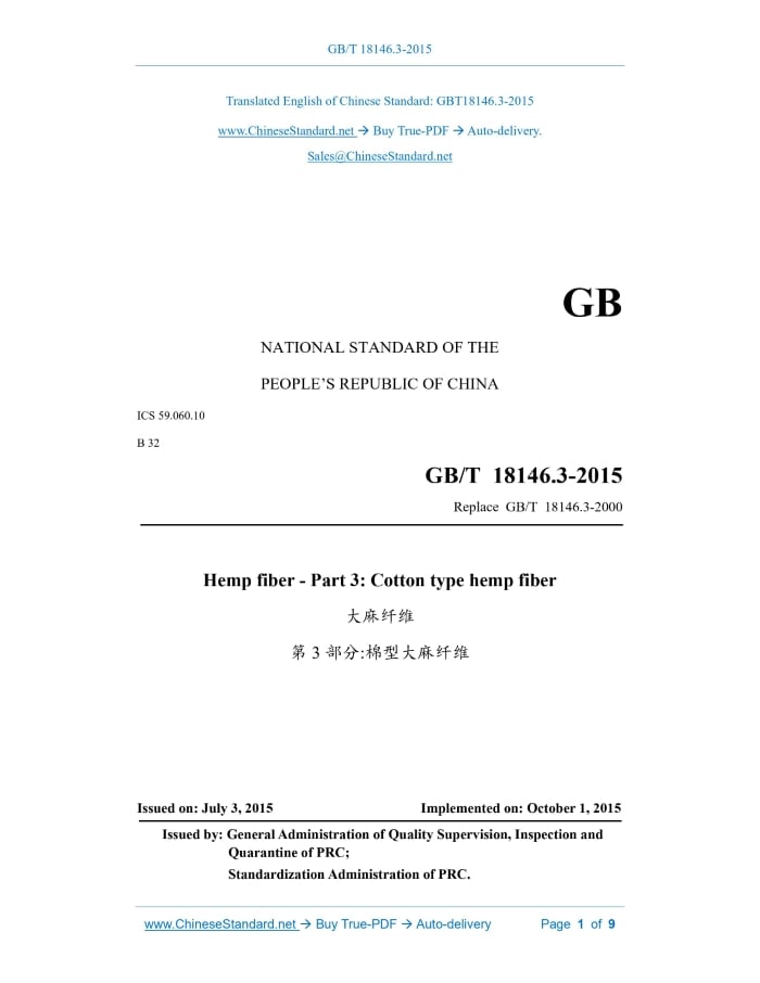 GB/T 18146.3-2015: Hemp fiber -- Part 3: Cotton type hemp fiber Delivery: 9 seconds. True-PDF full-copy in English & invoice will be downloaded + auto-delivered via email. See step-by-step procedure Status: Valid GB/T 18146.3: Historical versions