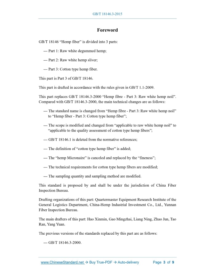 Similar standardsGB/T 18146.3-2015: Hemp fiber -- Part 3: Cotton type hemp fiber---This is an excerpt. Full copy of true-PDF in English version (including equations, symbols, images, flow-chart, tables, and figures etc.), auto-downloaded/delivered in 9 seconds, can be purchased online: https://www.ChineseStandard.net/PDF.aspx/GBT18146.3-2015GB NATIONAL STANDARD OF THE PEOPLE’S REPUBLIC OF CHINA ICS 59.060.10 B 32 Replace GB/T 18146.3-2000 Hemp fiber - Part 3: Cotton type hemp fiber 大麻纤维 ISSUED ON: JULY 3, 2015 IMPLEMENTED ON: OCTOBER 1, 2015 Issued by: General Administration of Quality Supervision, Inspection and Quarantine of PRC; Standardization Administration of PRC. Table of ContentsForeword ... 3 1 Scope ... 4 2 Normative references ... 4 3 Terms and definitions ... 4 4 Technical requirements ... 5 5 Sampling quantity and sampling method ... 5 6 Test methods ... 6 7 Quality assessment ... 8 8 Handover and acceptance ... 8 9 Packaging, marking, transportation, and storage ... 9ForewordGB/T 18146 “Hemp fiber” is divided into 3 parts: --- Part 1: Raw white degummed hemp; --- Part 2: Raw white hemp sliver; --- Part 3: Cotton type hemp fiber. This part is Part 3 of GB/T 18146. This part is drafted in accordance with the rules given in GB/T 1.1-2009. This part replaces GB/T 18146.3-2000 “Hemp fibre - Part 3: Raw white hemp noil”. Compared with GB/T 18146.3-2000, the main technical changes are as follows: --- The standard name is changed from “Hemp fibre - Part 3: Raw white hemp noil” to “Hemp fiber - Part 3: Cotton type hemp fiber”; --- The scope is modified and changed from “applicable to raw white hemp noil” to “applicable to the quality assessment of cotton type hemp fibers”; --- GB/T 18146.1 is deleted from the normative references; --- The definition of “cotton type hemp fiber” is added; --- The “hemp Micronaire” is canceled and replaced by the “fineness”; --- The technical requirements for cotton type hemp fibers are modified; --- The sampling quantity and sampling method are modified. This standard is proposed by and shall be under the jurisdiction of China Fiber Inspection Bureau. Drafting organizations of this part: Quartermaster Equipment Research Institute of the General Logistics Department, China-Hemp Industrial Investment Co., Ltd., Yunnan Fiber Inspection Bureau. The main drafters of this part: Hao Xinmin, Gao Mingzhai, Liang Ning, Zhao Jun, Tao Ran, Yang Yuan. The previous versions of the standards replaced by this part are as follows: --- GB/T 18146.3-2000. Hemp fiber - Part 3: Cotton type hemp fiber1 ScopeThis part of GB/T 18146 specifies the definition, technical requirements, sampling quantity and sampling methods, test methods, inspection rules, packaging, marking, transportation, and storage of cotton type hemp fibers. This part applies to the quality assessment of cotton type hemp fibers.2 Normative referencesThe following documents are essential to the application of this document. For the dated documents, only the versions with the dates indicated are applicable to this document; for the undated documents, only the latest version (including all the amendments) is applicable to this standard. GB/T 8170 Rules of rounding off for numerical values & expression and judgment of limiting values GB/T 9995 Determination of moisture content and moisture regain of textile - Oven- drying method GB/T 18147.1 Test method for hemp fibre - Part 1: Test method for oil content of hemp fibre GB/T 18147.3 Test method for hemp fiber - Part 3: Test method for length of hemp fiber GB/T 18147.4 Test method for hemp fiber - Part 4: Test method for fineness of hemp fiber GB/T 18147.5 Test method for hemp fiber - Part 5: Test method for breaking strength of hemp fiber GB/T 18147.6 Test method for hemp fiber - Part 6: Test method for defect in hemp fiber3 Terms and definitionsThe following terms and definitions apply to this document. The sampling quantity is determined by the number of pieces in each batch. If the number of pieces is 2 or less in each batch, take 1 piece; if it is 5 or less in each batch, take 2 pieces; if it is 10 or less in each batch, take 3 pieces; if it is 25 or less in each batch, take 4 pieces, if it is 350 or less in each batch, take 5 pieces; if it is 350 or more in each batch, take 6 pieces. 5.2 Sampling method 5.2.1 Single-piece sampling 5.2.1.1 Sampling for moisture regain test: Take about 50 g from each sample in the batch (sampling depth shall be 10 m~15 cm from the outer layer of the sack), and immediately put them into an airtight container for moisture regain test. 5.2.1.2 Sampling for appearance quality inspection: Take about 100 g from each sample in the batch (sampling depth shall be 10 cm~15 cm from the outer layer of the sack), and place them flat on the workbench for appearance quality inspection. 5.2.1.3 Fully mix the samples after appearance quality inspection to form laboratory samples for test sampling: a) Sampling for oil content test: Take 3 samples, each about 5 g, and measure the oil content. b) Sampling for length test: Take 3 samples, each about 150 mg, and measure the fiber length. c) Sampling for fineness test: Take 3 samples, each about 300 mg, and measure the fineness. d) Sampling for breaking strength test: Take 12 samples, each about 5 mg, and measure the breaking strength. e) Sampling for the nep and strip fiber test: Take 3 samples, each about 1 g, and measure the nep and the content of strip fiber. 5.2.2 Batch sampling For multiple pieces of a batch, according to the provisions of 5.2.1, take a sample from each piece and test respectively, and take the arithmetic mean of the test data as the test result of the batch.6 Test methods6.1 Moisture regain Through visual inspection and touch by hand, determine that there is no obvious abnormality in the moisture regain of the hemp fibers, and then carry out the test according to GB/T 9995. 6.2 Appearance quality Under the conditions of northerl