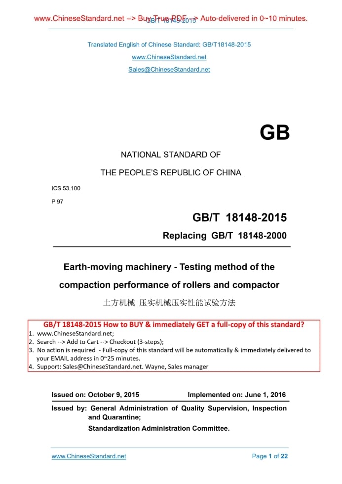 GB/T 18148-2015: Earth-moving machinery - Testing method of the compaction performance of rollers and compactor Delivery: 9 seconds. True-PDF full-copy in English & invoice will be downloaded + auto-delivered via email. See step-by-step procedure Status: Valid GB/T 18148: Historical versions