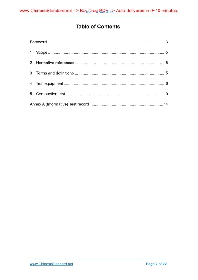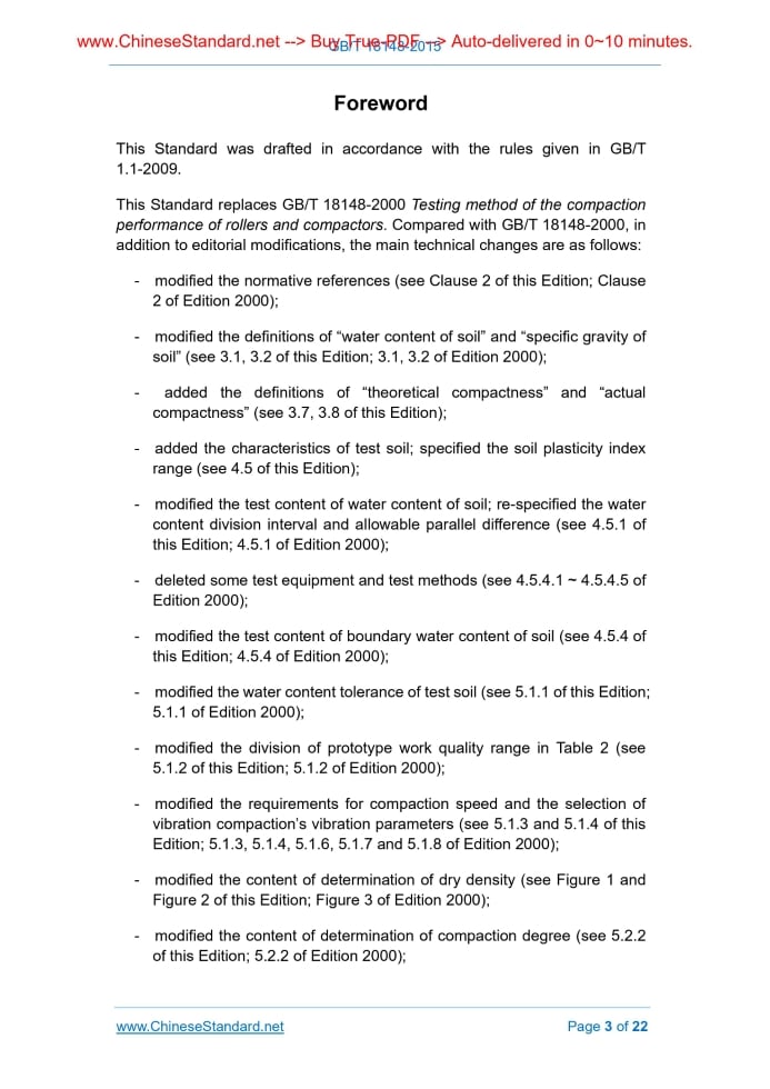 Similar standardsGB/T 18148-2015: Earth-moving machinery - Testing method of the compaction performance of rollers and compactor---This is an excerpt. Full copy of true-PDF in English version (including equations, symbols, images, flow-chart, tables, and figures etc.), auto-downloaded/delivered in 9 seconds, can be purchased online: https://www.ChineseStandard.net/PDF.aspx/GBT18148-2015 GB NATIONAL STANDARD OF THE PEOPLE’S REPUBLIC OF CHINA ICS 53.100 P 97 Replacing GB/T 18148-2000 Earth-moving machinery - Testing method of the compaction performance of rollers and compactor Issued on: OCTOBER 9, 2015 Implemented on: JUNE 1, 2016 Issued by. General Administration of Quality Supervision, Inspection and Quarantine; Standardization Administration Committee. Table of ContentsForeword ... 3 1 Scope ... 5 2 Normative references ... 5 3 Terms and definitions ... 5 4 Test equipment ... 6 5 Compaction test ... 10 Annex A (Informative) Test record ... 14ForewordThis Standard was drafted in accordance with the rules given in GB/T 1.1-2009. This Standard replaces GB/T 18148-2000 Testing method of the compaction performance of rollers and compactors. Compared with GB/T 18148-2000, in addition to editorial modifications, the main technical changes are as follows. - modified the normative references (see Clause 2 of this Edition; Clause 2 of Edition 2000); - modified the definitions of “water content of soil” and “specific gravity of soil” (see 3.1, 3.2 of this Edition; 3.1, 3.2 of Edition 2000); - added the definitions of “theoretical compactness” and “actual compactness” (see 3.7, 3.8 of this Edition); - added the characteristics of test soil; specified the soil plasticity index range (see 4.5 of this Edition); - modified the test content of water content of soil; re-specified the water content division interval and allowable parallel difference (see 4.5.1 of this Edition; 4.5.1 of Edition 2000); - deleted some test equipment and test methods (see 4.5.4.1 ~ 4.5.4.5 of Edition 2000); - modified the test content of boundary water content of soil (see 4.5.4 of this Edition; 4.5.4 of Edition 2000); - modified the water content tolerance of test soil (see 5.1.1 of this Edition; 5.1.1 of Edition 2000); - modified the division of prototype work quality range in Table 2 (see 5.1.2 of this Edition; 5.1.2 of Edition 2000); - modified the requirements for compaction speed and the selection of vibration compaction’s vibration parameters (see 5.1.3 and 5.1.4 of this Edition; 5.1.3, 5.1.4, 5.1.6, 5.1.7 and 5.1.8 of Edition 2000); - modified the content of determination of dry density (see Figure 1 and Figure 2 of this Edition; Figure 3 of Edition 2000); - modified the content of determination of compaction degree (see 5.2.2 of this Edition; 5.2.2 of Edition 2000); Earth-moving machinery - Testing method of the compaction performance of rollers and compactor1 ScopeThis Standard specifies the testing method of the compaction performance of rollers and compactor. This Standard is applicable to compaction performance test of vibratory roller, wheel roller, tire roller, oscillatory roller, vibration plate ram and vibration impact ram.2 Normative referencesThe following referenced documents are indispensable for the application of this document. For dated references, only the edition cited applies. For undated references, the latest edition of the referenced document (including any amendments) applies. GB/T 50123-1999, Standard for soil test method JTG E40-2007, Test Methods of Soils for Highway Engineering3 Terms and definitionsFor the purposes of this document, the following terms and definitions apply. 3.1 water content of soil the ratio of the amount of water lost to the constant weight of dry soil at 105°C ~ 108°C, in percentage 3.2 specific gravity of soil the ratio of the mass of the soil to the constant volume at 105°C ~ 108°C and the mass of distilled water at 4°C 3.3 grain composition test of soil a method for determining the percentage of the total mass of the soil in each of the dry granules 3.4 liquid limit of soil the boundary water content of the soil from the plastic state to the flow state 3.5 plastic limit of soil the boundary water content of the soil from the semi-solid state to the plastic state 3.6 compaction test the test of the relationship between the water content and the dry density of the testing material under certain conditions 3.7 theoretical compactness the ratio of the actual dry density after compaction of the soil to the maximum dry density corresponding to the optimum water content of the soil 3.8 actual compactness the ratio of the actual dry density after compaction of the soil to the dry density corresponding to the actual water content of the soil4 Test equipment4.1 Information required for testing The standards and various record sheets required for the test. 4.2 Test prototype Before the test, the prototype shall be subjected to trial operation so as to make it in normal working condition. 4.3 Main instruments and appliances The test instruments and appliances must be verified by the national statutory metrological verification organization and shall be used within validity period. If necessary, carry out the calibration and standardization. 4.4 Test site The compaction test site shall be a ground trough with concrete bottom and concrete side (it can be replaced by a fully-compacted soil groove). 4.5 Test soil a) ring knife. diameter of 6 cm ~ 8 cm, height of 2 cm ~ 3 cm, wall thickness of 1.5 mm ~ 2 mm; b) balance. weighing of 500 g, resolution of 0.1 g; c) others. ring cover, hammer, soil repair knife, small shovel, ruler and water content determination equipment, etc. 4.5.6.2 Test method Carry out the density test according to the following methods. a) remove the loose soil from the sampling surface; put the known mass of the knife on the surface; then place the ring cover on the ring knife; align the guide bar with the groove on the top of the ring c