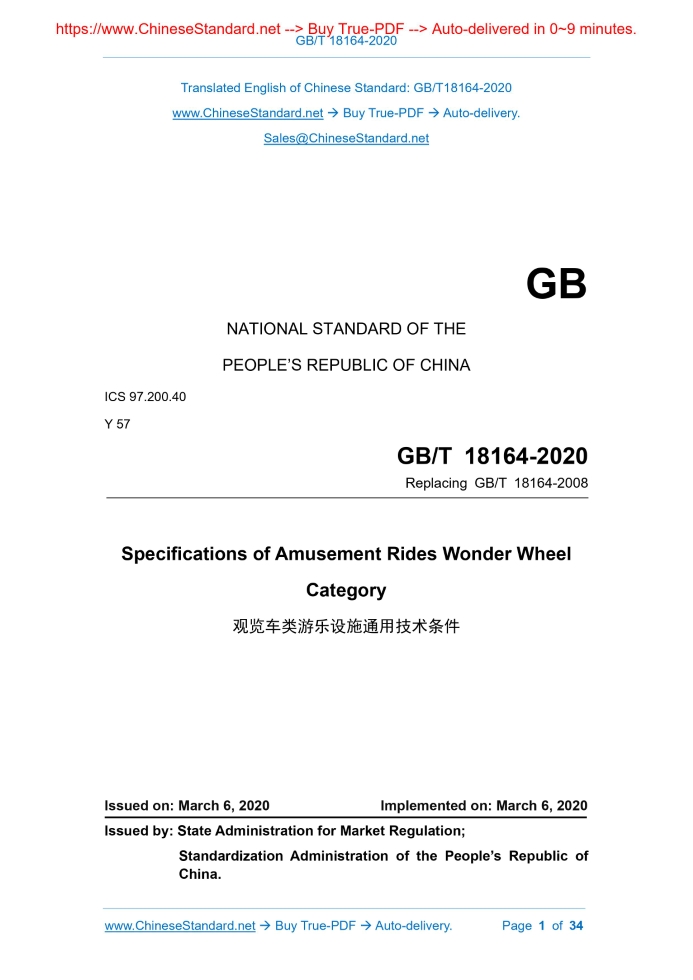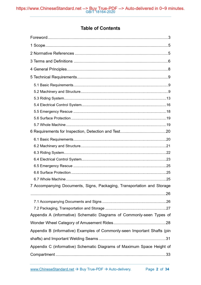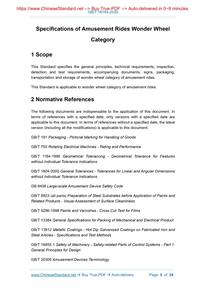 Similar standardsGB/T 18164-2020: Specifications of Amusement Rides Wonder Wheel Category---This is an excerpt. Full copy of true-PDF in English version (including equations, symbols, images, flow-chart, tables, and figures etc.), auto-downloaded/delivered in 9 seconds, can be purchased online: https://www.ChineseStandard.net/PDF.aspx/GBT18164-2020GB NATIONAL STANDARD OF THE PEOPLE’S REPUBLIC OF CHINA ICS 97.200.40 Y 57 Replacing GB/T 18164-2008 Specifications of Amusement Rides Wonder Wheel Category ISSUED ON: MARCH 6, 2020 IMPLEMENTED ON: MARCH 6, 2020 Issued by: State Administration for Market Regulation; Standardization Administration of the People’s Republic of China. Table of ContentsForeword ... 3 1 Scope ... 5 2 Normative References ... 5 3 Terms and Definitions ... 6 4 General Principles ... 8 5 Technical Requirements ... 9 5.1 Basic Requirements ... 9 5.2 Machinery and Structure ... 9 5.3 Riding System ... 13 5.4 Electrical Control System ... 16 5.5 Emergency Rescue ... 18 5.6 Surface Protection ... 19 5.7 Whole Machine ... 19 6 Requirements for Inspection, Detection and Test ... 20 6.1 Basic Requirements ... 20 6.2 Machinery and Structure ... 21 6.3 Riding System ... 22 6.4 Electrical Control System ... 23 6.5 Emergency Rescue ... 25 6.6 Surface Protection ... 25 6.7 Whole Machine ... 25 7 Accompanying Documents, Signs, Packaging, Transportation and Storage ... 26 7.1 Accompanying Documents and Signs ... 26 7.2 Packaging, Transportation and Storage ... 27 Appendix A (informative) Schematic Diagrams of Commonly-seen Types of Wonder Wheel Category of Amusement Rides ... 28 Appendix B (informative) Examples of Commonly-seen Important Shafts (pin shafts) and Important Welding Seams ... 31 Appendix C (informative) Schematic Diagrams of Maximum Space Height of Compartment ... 33 Specifications of Amusement Rides Wonder Wheel Category1 ScopeThis Standard specifies the general principles, technical requirements, inspection, detection and test requirements, accompanying documents, signs, packaging, transportation and storage of wonder wheel category of amusement rides. This Standard is applicable to wonder wheel category of amusement rides.2 Normative ReferencesThe following documents are indispensable to the application of this document. In terms of references with a specified date, only versions with a specified date are applicable to this document. In terms of references without a specified date, the latest version (including all the modifications) is applicable to this document. GB/T 191 Packaging - Pictorial Marking for Handling of Goods GB/T 755 Rotating Electrical Machines - Rating and Performance GB/T 1184-1996 Geometrical Tolerancing - Geometrical Tolerance for Features without Individual Tolerance Indications GB/T 1804-2000 General Tolerances - Tolerances for Linear and Angular Dimensions without Individual Tolerance Indications GB 8408 Large-scale Amusement Device Safety Code GB/T 8923 (all parts) Preparation of Steel Substrates before Application of Paints and Related Products - Visual Assessment of Surface Cleanliness GB/T 9286-1998 Paints and Varnishes - Cross Cut Test for Films GB/T 13384 General Specifications for Packing of Mechanical and Electrical Product GB/T 13912 Metallic Coatings - Hot Dip Galvanized Coatings on Fabricated Iron and Steel Articles - Specifications and Test Methods GB/T 16855.1 Safety of Machinery - Safety-related Parts of Control Systems - Part 1: General Principles for Design GB/T 20306 Amusement Devices Terminology 3.4 Top Spin Type Top spin type refers to the wonder wheel category of amusement rides, where the inner side of the supporting frame in the vertical plane is equipped with supporting shafts (half shafts or through shafts), and the supporting shafts are respectively equipped with a rotary arm, and one end of the rotary arm is connected with the cockpit; the cockpit can rotate in the forward and backward directions with the rotary arm, and simultaneously, it can freely swing; when the rotary arm is equipped with a swing joint, the two arms can asynchronously rotate, and the cockpit will move up and down along with it. NOTE: please refer to Figure A.4. 3.5 Time and Space Shuttle Type Time and space shuttle type refers to the wonder wheel category of amusement rides, where the upper end of the vertical column is equipped with a supporting shaft, and the supporting shaft is equipped with a rotary arm; one end of the rotary arm is connected with the cockpit; the rotary arm can rotate forward and backward; the cockpit is fixed with the rotary arm, or can swing left and right. NOTE: please refer to Figure A.5. 3.6 Flying Carpet Type Flying carpet type refers to the wonder wheel category of amusement rides, where the cockpit is connected with one end of the rotary arm, makes translational movement around the supporting shaft with the rotary arm, and can rotate in the forward and backward directions. NOTE: the rotary arm is generally two-arm or four-arm, and the corresponding supporting column is two-column or four-column (see Figure A.6). 3.7 Pendulum Loop Type Pendulum loop type refers to the wonder wheel category of amusement rides, where the upper end of the vertical column is equipped with a supporting shaft, and the two ends of the supporting shaft stretch out and are respectively equipped with a rotary arm; one end of the rotary arm is the cockpit; the cockpit drives the rotary arm to rotate along a fixed ring-shaped inner slide, and can rotate in the forward and backward directions; the cockpit is fixed with the rotary arm, or can rotate around it. NOTE: please refer to Figure A.7. 3.8 Other Type Other type refers to the wonder wheel category of amusement rides, where the passenger-taking part rotates or swings around the horizontal axis, and has a similar and the foundation should be equipped with a structure that resists transverse shear or corresponding measures. 5.2.3 When calculating the limit wind for the structure of the wond
