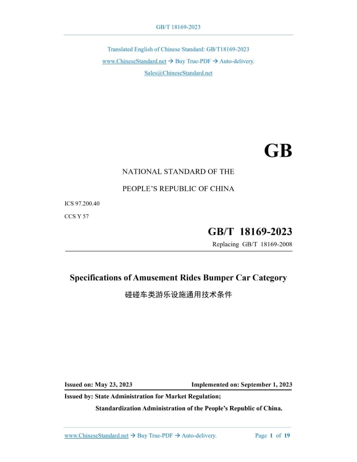 GB/T 18169-2023: Specifications of amusement rides bumper car category Delivery: 9 seconds. True-PDF full-copy in English & invoice will be downloaded + auto-delivered via email. See step-by-step procedure Status: Valid GB/T 18169: Historical versions