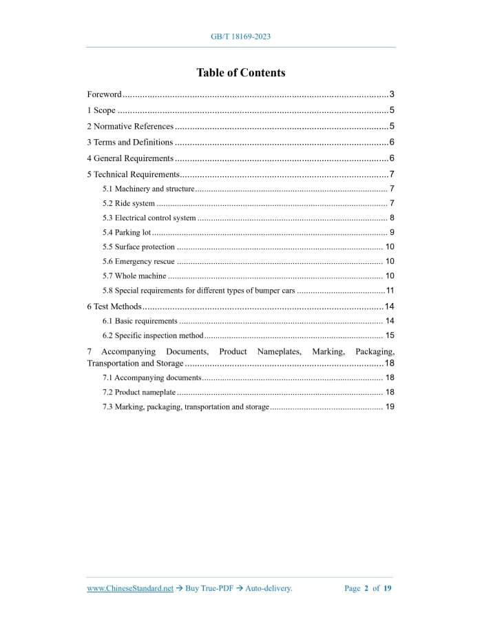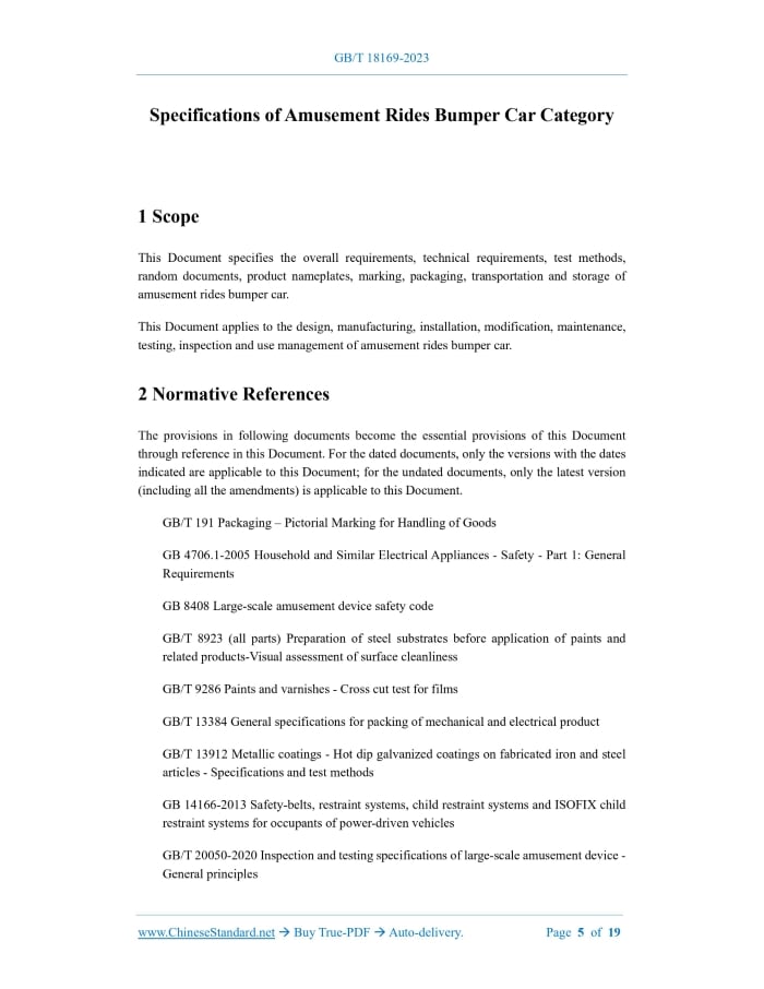 Similar standardsGB/T 18169-2023: Specifications of amusement rides bumper car category---This is an excerpt. Full copy of true-PDF in English version (including equations, symbols, images, flow-chart, tables, and figures etc.), auto-downloaded/delivered in 9 seconds, can be purchased online: https://www.ChineseStandard.net/PDF.aspx/GBT18169-2023GB NATIONAL STANDARD OF THE PEOPLE’S REPUBLIC OF CHINA ICS 97.200.40 CCS Y 57 Replacing GB/T 18169-2008 Specifications of Amusement Rides Bumper Car Category ISSUED ON: MAY 23, 2023 IMPLEMENTED ON: SEPTEMBER 1, 2023 Issued by: State Administration for Market Regulation; Standardization Administration of the People’s Republic of China. Table of ContentsForeword ... 3 1 Scope ... 5 2 Normative References ... 5 3 Terms and Definitions ... 6 4 General Requirements ... 6 5 Technical Requirements ... 7 5.1 Machinery and structure ... 7 5.2 Ride system ... 7 5.3 Electrical control system ... 8 5.4 Parking lot ... 9 5.5 Surface protection ... 10 5.6 Emergency rescue ... 10 5.7 Whole machine ... 10 5.8 Special requirements for different types of bumper cars ... 11 6 Test Methods ... 14 6.1 Basic requirements ... 14 6.2 Specific inspection method ... 15 7 Accompanying Documents, Product Nameplates, Marking, Packaging, Transportation and Storage ... 18 7.1 Accompanying documents ... 18 7.2 Product nameplate ... 18 7.3 Marking, packaging, transportation and storage ... 19 Specifications of Amusement Rides Bumper Car Category1 ScopeThis Document specifies the overall requirements, technical requirements, test methods, random documents, product nameplates, marking, packaging, transportation and storage of amusement rides bumper car. This Document applies to the design, manufacturing, installation, modification, maintenance, testing, inspection and use management of amusement rides bumper car.2 Normative ReferencesThe provisions in following documents become the essential provisions of this Document through reference in this Document. For the dated documents, only the versions with the dates indicated are applicable to this Document; for the undated documents, only the latest version (including all the amendments) is applicable to this Document. GB/T 191 Packaging – Pictorial Marking for Handling of Goods GB 4706.1-2005 Household and Similar Electrical Appliances - Safety - Part 1: General Requirements GB 8408 Large-scale amusement device safety code GB/T 8923 (all parts) Preparation of steel substrates before application of paints and related products-Visual assessment of surface cleanliness GB/T 9286 Paints and varnishes - Cross cut test for films GB/T 13384 General specifications for packing of mechanical and electrical product GB/T 13912 Metallic coatings - Hot dip galvanized coatings on fabricated iron and steel articles - Specifications and test methods GB 14166-2013 Safety-belts, restraint systems, child restraint systems and ISOFIX child restraint systems for occupants of power-driven vehicles GB/T 20050-2020 Inspection and testing specifications of large-scale amusement device - General principles GB/T 20306 Amusement devices terminology GB/T 34371 Risk assessment for amusement ride - General principles3 Terms and DefinitionsFor the purposes of this Document, the terms and definitions given in GB/T 20306 and the following apply. 3.1 Pole-mounted bumper car A bumper car that is fed by sliding (or rolling) contact between electrical components and the sky-net, driven by electrical energy, and runs in a fixed parking lot. 3.2 Floor feeding bumper car A bumper car that is fed by sliding (or rolling) contact between electrical components and the floor, driven by electrical energy, and runs in a fixed parking lot. 3.3 Accumulator feeding bumper car A bumper car that uses its own energy storage unit to provide power and runs in a fixed parking lot. 3.4 Energy storage unit The minimum energy storage system that consists of a battery pack, a battery management system and a power conversion system connected to it.4 General Requirements4.1 The design, manufacturing, installation, modification, repair, testing and inspection, random documents and complete product nameplates of amusement rides bumper car shall meet the relevant requirements of GB 8408 and this Document. 4.2 Risk assessment shall be carried out in accordance with GB/T 34371 during the design stage of amusement rides bumper car. Risk assessment shall also be carried out for amusement rides bumper car that needs to be modified or that continue to be used after the designed service life of the whole machine has expired.5 Technical Requirements5.1 Machinery and structure 5.1.1 The frame shall be made of metal material. 5.1.2 There shall be no exposed sharp edges, corners, burrs, or dangerous protrusions in any part of the bumper car that is accessible to passengers. 5.1.3 The bumper car shall be able to move forward, backward, turn left, and turn right. 5.1.4 The wheel axle shall be designed for infinite life. 5.1.5 The wheel device shall be flexible in rotation, easy to lubricate and repair. 5.1.6 A collision buffer device shall be installed on the steering wheel. The collision buffer device can be made of sponge or foam material. 5.1.7 Steering wheel operation shall be light and effortless. Under full-load conditions, the steering operation resistance at any point on the steering wheel shall be no greater than 40N. 5.1.8 The steering mechanism shall be flexible and reliable; and there shall be no sticking or axial movement. 5.1.9 When the bumper car is blocked, the clutch shall be able to work effectively. 5.1.10 The weld seams of the bumper car frame shall comply with the requirements for weld seams with Level-IV risk assessment of GB 8408. 5.1.11 Buffer devices shall be installed around the bumper car frame and installed at the same height. Bumper car with a maximum operating speed of 4km/h ~ 10km/h shall be equipped with buffer tires. The buffer tires shall protrude from the car body and deco