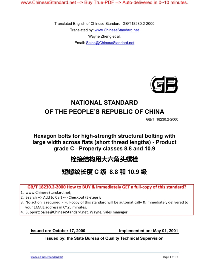 GB/T 18230.2-2000: Hexagon bolts for high-strength structural bolting with large width across flats (short thread length) - Product grade C - Property classes 8 - 8 and 10 - 9 Delivery: 9 seconds. True-PDF full-copy in English & invoice will be downloaded + auto-delivered via email. See step-by-step procedure Status: Obsolete