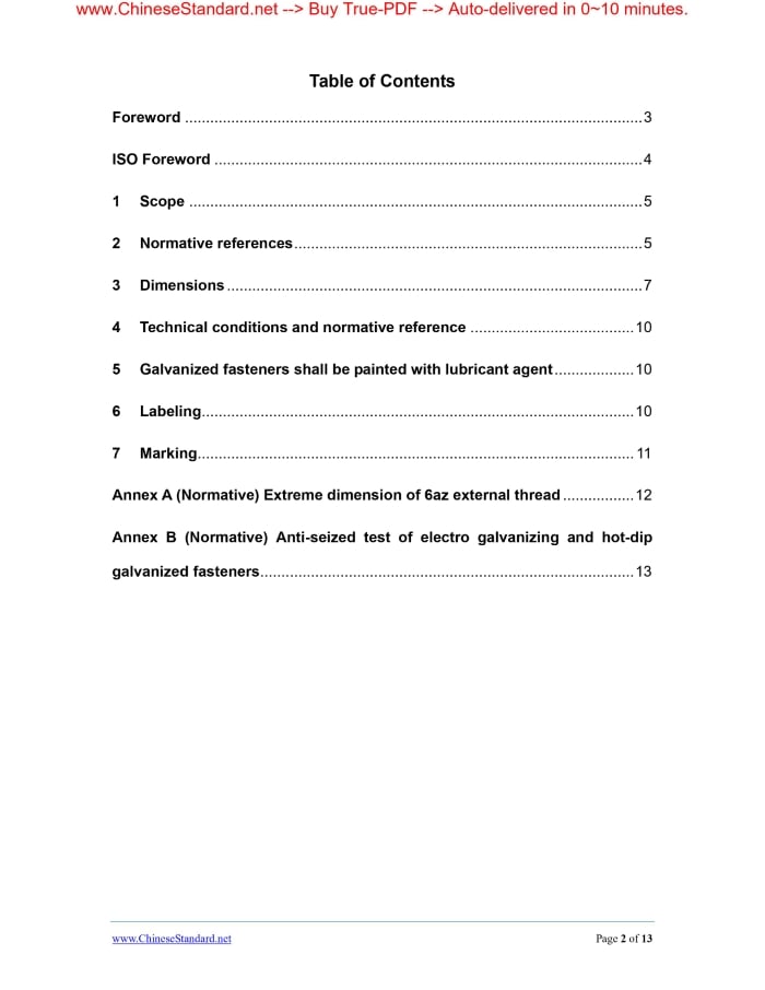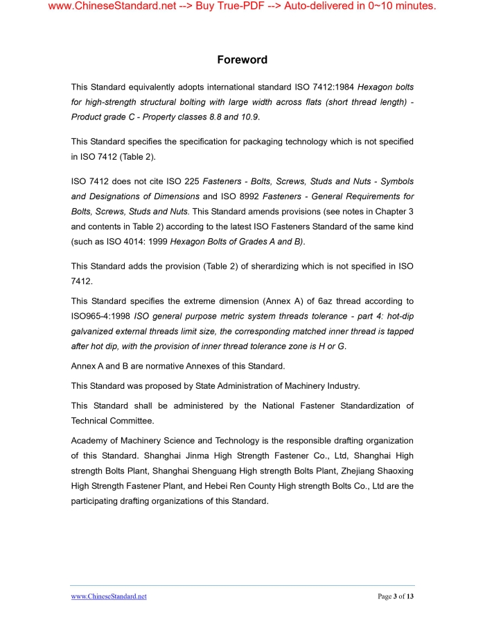 Similar standardsGB/T 18230.2-2000: Hexagon bolts for high-strength structural bolting with large width across flats (short thread length) - Product grade C - Property classes 8 - 8 and 10 - 9---This is an excerpt. Full copy of true-PDF in English version (including equations, symbols, images, flow-chart, tables, and figures etc.), auto-downloaded/delivered in 9 seconds, can be purchased online: https://www.ChineseStandard.net/PDF.aspx/GBT18230.2-2000 NATIONAL STANDARD OF THE PEOPLE’S REPUBLIC OF CHINA Hexagon bolts for high-strength structural bolting with large width across flats (short thread lengths) - Product grade C - Property classes 8.8 and 10.9 Issued on: OCTOBER 17, 2000 Implemented on: MAY 01, 2001 Issued by. the State Bureau of Quality Technical Supervision Table of ContentsForeword ... 3 ISO Foreword ... 4 1 Scope ... 5 2 Normative references ... 5 3 Dimensions ... 7 4 Technical conditions and normative reference ... 10 5 Galvanized fasteners shall be painted with lubricant agent ... 10 6 Labeling ... 10 7 Marking... 11 Annex A (Normative) Extreme dimension of 6az external thread ... 12 Annex B (Normative) Anti-seized test of electro galvanizing and hot-dip galvanized fasteners ... 13ForewordThis Standard equivalently adopts international standard ISO 7412.1984 Hexagon bolts for high-strength structural bolting with large width across flats (short thread length) - Product grade C - Property classes 8.8 and 10.9. This Standard specifies the specification for packaging technology which is not specified in ISO 7412 (Table 2). ISO 7412 does not cite ISO 225 Fasteners - Bolts, Screws, Studs and Nuts - Symbols and Designations of Dimensions and ISO 8992 Fasteners - General Requirements for Bolts, Screws, Studs and Nuts. This Standard amends provisions (see notes in Chapter 3 and contents in Table 2) according to the latest ISO Fasteners Standard of the same kind (such as ISO 4014. 1999 Hexagon Bolts of Grades A and B). This Standard adds the provision (Table 2) of sherardizing which is not specified in ISO 7412. This Standard specifies the extreme dimension (Annex A) of 6az thread according to ISO965-4.1998 ISO general purpose metric system threads tolerance - part 4. hot-dip galvanized external threads limit size, the corresponding matched inner thread is tapped after hot dip, with the provision of inner thread tolerance zone is H or G. Annex A and B are normative Annexes of this Standard. This Standard was proposed by State Administration of Machinery Industry. This Standard shall be administered by the National Fastener Standardization of Technical Committee. Academy of Machinery Science and Technology is the responsible drafting organization of this Standard. Shanghai Jinma High Strength Fastener Co., Ltd, Shanghai High strength Bolts Plant, Shanghai Shenguang High strength Bolts Plant, Zhejiang Shaoxing High Strength Fastener Plant, and Hebei Ren County High strength Bolts Co., Ltd are the participating drafting organizations of this Standard.ISO ForewordISO (International Standardization Organization) is a syndicate consisting of state standard group (members of ISO) across the world. The formulation of the international standard is made by all technical committees of ISO. Each member who is interested in projects of certain technical committee can participate in the committee. Governmental and non-governmental international organizations related with ISO can also take part in the job. ISO is closely related with IEC in terms of electro-technical normalization. International standard draft adopted by technical committee shall be distributed to all member groups for voting. The official publication of international standards needs at least 75% votes by the member groups. International standard ISO 7412 was formulated by ISO/TC 2 Fasteners Technical Committee. National Standard of the People’s Republic of China Hexagon bolts for high-strength structural bolting with large width across flats (short thread length) – Product grade C - Property classes 8. 8 and 10-9 eqv ISO7412.19841 ScopeThis Standard specifies the hexagon bolts for structural bolting with large width across flats - thread specification is M12-M36, short length of thread, performance grades are 8.8 and 10.9; and the product grade is C. If other technical requirements are required, it shall be selected from current standards (such as GB/T196, GB/T197, and GB /T3098.1). The bolts specified in this Standard shall be matched with appropriate nuts (such as GB/T18230.3 or GB/T18230.4), so as to prevent connections from thread tripping due to over-twisting in high-level. 8.8s U1 and 10.9s U1 bolts can be used by negotiation of supplier and purchaser. The bolts must be matched with 6H hot dip galvanizing nuts, and the connections may cause thread tripping due to over-twisting. Note. The satisfactory results can be achieved by making sure to correctly use the bolts. For the purpose of proper use, it is recommended to formulate bolt connections specifications.2 Normative referencesThe provisions contained in the following standards become part of this Standard, through the reference of this Standard. At the time of publication of this Standard, the shown versions of these standards are valid. All standards are subject to revision, and all parties who use this Standard are encouraged to investigate the possibility of applying the newest version of these standards. 1 See Chapter 7. GB/T 90-1985 Acceptance check, marking and packaging of fasteners (eqv ISO 3269. 1984) GB/T 196-1981 Basic Size of Common thread (Diameter of 1~600 mm). GB/T 197-1981 Tolerance and coordination of normal thread (Diameter of 1~355 mm). GB/T 1237-2000 Marking method of fasteners (eqv ISO 8991.1986) GB/T 3098.1-2000 Mechanical properties of fasteners - Bolts, screws and studs (idt ISO 898-1.1999) GB/T 3103.1-1982 Tolerances for Fasteners Bolt, Screw and Nut (eqv ISO 4759-1.1978) GB/T 3106 Bolts, screws and studs; Nominal lengths and thread leng