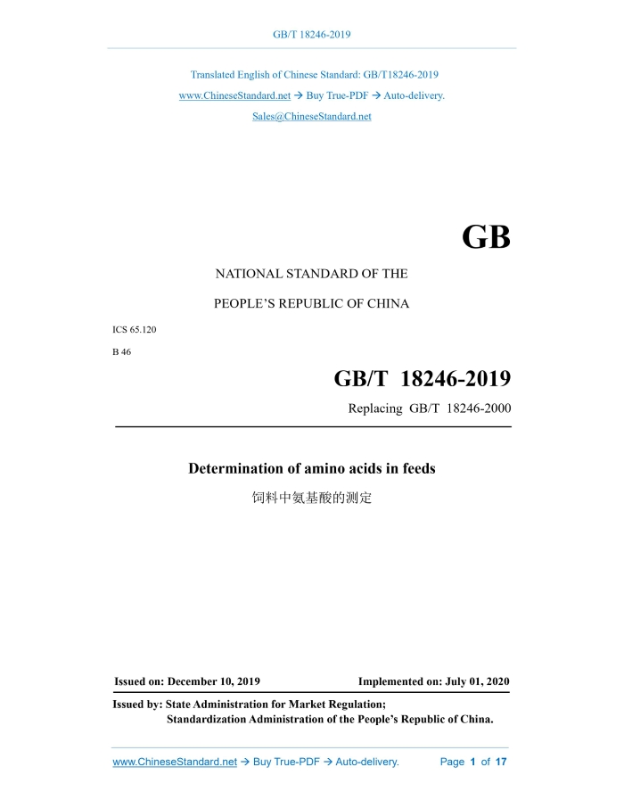 GB/T 18246-2019: Determination of amino acids in feeds Delivery: 9 seconds. True-PDF full-copy in English & invoice will be downloaded + auto-delivered via email. See step-by-step procedure Status: Valid GB/T 18246: Historical versions