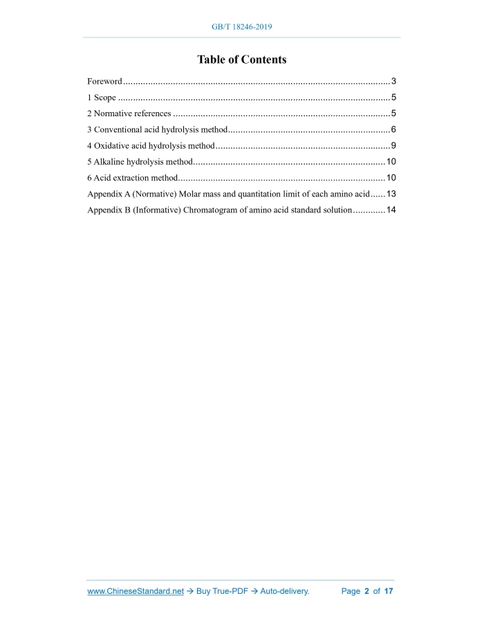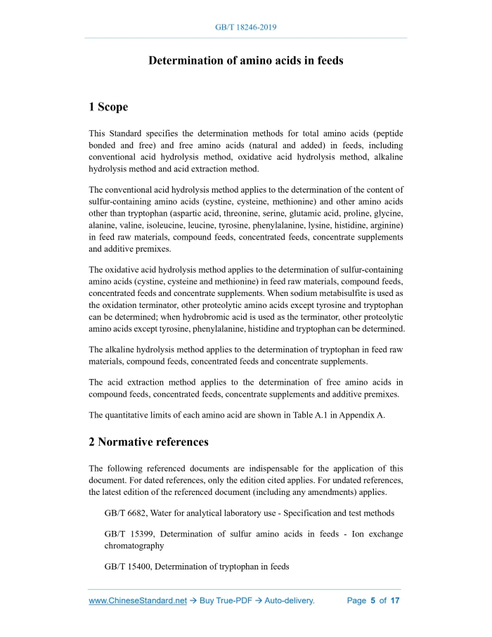 Similar standardsGB/T 18246-2019: Determination of amino acids in feeds---This is an excerpt. Full copy of true-PDF in English version (including equations, symbols, images, flow-chart, tables, and figures etc.), auto-downloaded/delivered in 9 seconds, can be purchased online: https://www.ChineseStandard.net/PDF.aspx/GBT18246-2019GB NATIONAL STANDARD OF THE PEOPLE’S REPUBLIC OF CHINA ICS 65.120 B 46 Replacing GB/T 18246-2000 Determination of amino acids in feeds ISSUED ON: DECEMBER 10, 2019 IMPLEMENTED ON: JULY 01, 2020 Issued by: State Administration for Market Regulation; Standardization Administration of the People’s Republic of China. Table of ContentsForeword ... 3 1 Scope ... 5 2 Normative references ... 5 3 Conventional acid hydrolysis method ... 6 4 Oxidative acid hydrolysis method ... 9 5 Alkaline hydrolysis method ... 10 6 Acid extraction method ... 10 Appendix A (Normative) Molar mass and quantitation limit of each amino acid ... 13 Appendix B (Informative) Chromatogram of amino acid standard solution ... 14 Determination of amino acids in feeds1 ScopeThis Standard specifies the determination methods for total amino acids (peptide bonded and free) and free amino acids (natural and added) in feeds, including conventional acid hydrolysis method, oxidative acid hydrolysis method, alkaline hydrolysis method and acid extraction method. The conventional acid hydrolysis method applies to the determination of the content of sulfur-containing amino acids (cystine, cysteine, methionine) and other amino acids other than tryptophan (aspartic acid, threonine, serine, glutamic acid, proline, glycine, alanine, valine, isoleucine, leucine, tyrosine, phenylalanine, lysine, histidine, arginine) in feed raw materials, compound feeds, concentrated feeds, concentrate supplements and additive premixes. The oxidative acid hydrolysis method applies to the determination of sulfur-containing amino acids (cystine, cysteine and methionine) in feed raw materials, compound feeds, concentrated feeds and concentrate supplements. When sodium metabisulfite is used as the oxidation terminator, other proteolytic amino acids except tyrosine and tryptophan can be determined; when hydrobromic acid is used as the terminator, other proteolytic amino acids except tyrosine, phenylalanine, histidine and tryptophan can be determined. The alkaline hydrolysis method applies to the determination of tryptophan in feed raw materials, compound feeds, concentrated feeds and concentrate supplements. The acid extraction method applies to the determination of free amino acids in compound feeds, concentrated feeds, concentrate supplements and additive premixes. The quantitative limits of each amino acid are shown in Table A.1 in Appendix A.2 Normative referencesThe following referenced documents are indispensable for the application of this document. For dated references, only the edition cited applies. For undated references, the latest edition of the referenced document (including any amendments) applies. GB/T 6682, Water for analytical laboratory use - Specification and test methods GB/T 15399, Determination of sulfur amino acids in feeds - Ion exchange chromatography GB/T 15400, Determination of tryptophan in feeds GB/T 20195, Animal feeding stuffs. Preparation of test samples JJG 1064, Automatic amino acid analyzer3 Conventional acid hydrolysis method3.1 Principle The protein in the feed is hydrolyzed into amino acids at 110 ℃ and 6 mol/L hydrochloric acid solution, separated by ion exchange chromatography and derivatized on a ninhydrin column. Proline is determined at a wavelength of 440 nm, and other amino acids are determined at a wavelength of 570 nm. 3.2 Reagents or materials Unless otherwise specified, all reagents used in this Standard are analytical reagents. 3.2.1 Water: Shall comply with the requirements of Grade 1 water in GB/T 6682. 3.2.2 Hydrochloric acid: guaranteed reagent. 3.2.3 Hydrochloric acid hydrating solution (6 mol/L): Mix 500 mL of hydrochloric acid (3.2.2) with 500 mL of water; add 1 g of phenol; mix well. 3.2.4 Sodium citrate buffer solution [pH = 2.2, c(Na+) = 0.2 mol/L]: Weigh 19.6 g of trisodium citrate into a 1 000 mL volumetric flask; add water to dissolve; then, add 16.5 mL of hydrochloric acid (3.2.2), 5.0 mL of thiodiglycol, and 1 g of phenol; use water to fix the volume and filter. 3.2.5 Amino acid standard stock solution: Containing 17 kinds of amino acids for routine protein hydrolysate analysis (aspartic acid, threonine, serine, glutamic acid, proline, glycine, alanine, cystine, valine, methionine, isoleucine, leucine, tyrosine, phenylalanine, lysine, histidine and arginine). The concentration of each component is 2.50 μmol/mL. Certified standard solutions shall be used. 3.2.6 Amino acid standard working solution: Accurately transfer 2 mL of amino acid standard stock solution (3.2.5) into a 50 mL volumetric flask; use sodium citrate buffer solution (3.2.4) to fix the volume, with a concentration of 100 nmol/mL for each amino acid component; package and seal in ampoules, approximately 1 mL each; store at 2 °C ~ 8 °C, valid for 3 months. 3.2.7 Sodium citrate buffer solutions and ninhydrin solutions of different pH values and ionic strengths: Prepare or purchase according to the instrument manual. 3.2.8 Liquid nitrogen. 3.3 Instruments and equipment 3.3.1 Automatic amino acid analyzer: equipped with cation exchange column, ninhydrin post-column derivatization device and 570 nm and 440 nm photometric detectors. 3.3.2 Balance: sensitivity 0.1 mg and 0.01 mg. 3.3.3 Vacuum pump. 3.3.4 Blowtorch. 3.3.5 Constant temperature drying oven: The temperature can reach 110 ℃ ± 2 ℃. 3.3.6 Centrifuge: speed not less than 4 000 r/min. 3.3.7 Rotary evaporator or concentrator: The temperature can be adjusted between room temperature and 65 °C, with a temperature control accuracy of ±1 °C and a vacuum degree as low as 3.3×103 Pa (25 mmHg). 3.4 Test sample Prepare the sample according to GB/T 2