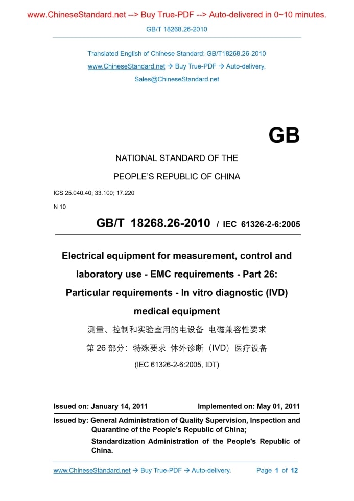 GB/T 18268.26-2010: Electrical equipment for measurement, control and laboratory use -- EMC requirements -- Part 26: Particular requirements -- In vitro diagnostic (IVD) medical equipment Delivery: 9 seconds. True-PDF full-copy in English & invoice will be downloaded + auto-delivered via email. See step-by-step procedure Status: Valid