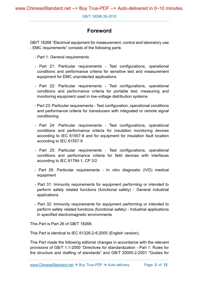 Similar standardsGB/T 18268.26-2010: Electrical equipment for measurement, control and laboratory use -- EMC requirements -- Part 26: Particular requirements -- In vitro diagnostic (IVD) medical equipment---This is an excerpt. Full copy of true-PDF in English version (including equations, symbols, images, flow-chart, tables, and figures etc.), auto-downloaded/delivered in 9 seconds, can be purchased online: https://www.ChineseStandard.net/PDF.aspx/GBT18268.26-2010 Electrical equipment for measuremen, control and laboratory use.EMC requirements.Part 26. Particular requirements.In vitro diagnostic (IVD) medical equipment ICS 25.040.40; 33.100; 17.220 N10 National Standards of People's Republic of China Electrical equipment for measurement, control and laboratory use Electromagnetic compatibility requirements-Part 26. Special requirements In vitro diagnostic (IVD) medical devices Electricalequipmentformeasurement, controlandlaboratoryuse- EMCrequirements-Part 26. Particularrequirements- Invitrodiagnostic (IVD) medicalequipment (IEC 61326-2-6..2005, IDT) Published on January 14,.2011 General Administration of Quality Supervision, Inspection and Quarantine of the People's Republic of China Published by China National Standardization Administration ForewordGB/T 18268 "Electromagnetic Compatibility Requirements for Electrical Equipment for Measurement, Control, and Laboratory Use" consists of --- Part 1. General requirements --- Part 21. Special requirements for test configuration and working conditions of sensitivity testing and measuring equipment for electromagnetic compatibility-free protection And performance criteria --- Part 22. Special requirements for test configurations, working conditions and test equipment for portable test, measurement and monitoring equipment for low-voltage power distribution systems Performance criteria --- Part 23. Special requirements for test configurations, operating conditions and performance criteria with integrated or remote signal conditioning transmitters --- Part 24. Special requirements for insulation monitoring devices in accordance with IEC 61557-8 and insulation fault determination in accordance with IEC 61557-9 Test equipment, operating conditions and performance criteria --- Part 25. Special requirements for test configurations, working conditions and performance of field devices with interfaces in accordance with IEC 61784-1, CP3/2 Criterion --- Part 26. Special requirements for in vitro diagnostic (IVD) medical devices --- Part 31. Immunity requirements for equipment performing or preparing to perform safety functions (functional safety) General industrial applications --- Part 32. Immunity requirements for equipment performing or preparing to perform safety functions (functional safety) specify in an electromagnetic environment Industrial applications This part is Part 26 of GB/T 18268. This section is equivalent to IEC 61326-2-6..2005 (English version). This section is based on GB/T 1.1-2000 "Guidelines for Standardization Work Part 1. Standard Structure and Rules for Writing" and The relevant provisions of GB/T 20000.2-2001 "Standardization Work Guide Part 2. Rules for Adopting International Standards" modify. --- Removed the preface and introduction of international standards; --- "This part of IEC 61326" was changed to "this part of GB/T 18268"; --- The guideline of the original reference file is changed to the guideline of the normative reference file according to the provisions of GB/T 1.1-2000; --- Normative references have been added to the reference documents appearing in Table 1 and Chapter 9 GB/T 17626.2, GB/T 17626.3, GB/T 17626.4, GB/T 17626.5, GB/T 17626.6, GB/T 17626.8, GB/T 17626.11, and GB 4824; --- Replace the comma "," with a decimal point "." As a decimal point. In the international standards adopted in this section, the additional contents of each chapter have adopted special numbers, such as 3.101, 3.102, etc., to show the difference. Jian In this section, international standards are equivalently adopted. In order to be consistent with international standards, this section has not changed. This section is proposed by China Machinery Industry Federation. This section is under the jurisdiction of the National Industrial Process Measurement and Control Standardization Technical Committee (SAC/TC124). This section is responsible for drafting. Shanghai Institute of Industrial Automation Instrumentation. This section participated in the drafting unit. Shanghai Instrumentation Automatic Control System Inspection and Testing Institute, Fujian Shangrun Precision Instrument Co., Ltd. The main drafters of this section. Wang Ying, Ge Jian, Li Minghua, and Hong Jizhen. This section is the first release. Electrical equipment for measurement, control and laboratory use Electromagnetic compatibility requirements-Part 26. Special requirements In vitro diagnostic (IVD) medical devices1 ScopeThe scope of GB/T 18268.1 applies to this part. In addition, this part of GB/T 18268 is based on the characteristics of in vitro diagnostic medical devices And its electromagnetic environment, the basic requirements for immunity and emission of electromagnetic compatibility are specified.2 Normative referencesThe clauses in the following documents become clauses of this section after being referenced in this part of GB/T 18268. All quotes with date Documents, all subsequent amendments (excluding errata) or revisions are not applicable to this section, however, The parties to the agreement investigate whether the latest versions of these documents are available. For undated references, the latest edition applies In this section. GB/T 4365-2003 Electromagnetic Terms for Electromagnetic Compatibility (IEC 60050-161..1990, IDT) GB 4824 Limits and measurement methods for electromagnetic disturbance characteristics of industrial, scientific and medical (ISM) radio frequency equipment (GB 4824-2004, (CISPR11..2003, IDT) GB/T 17626.2 Electromagnetic compatibili