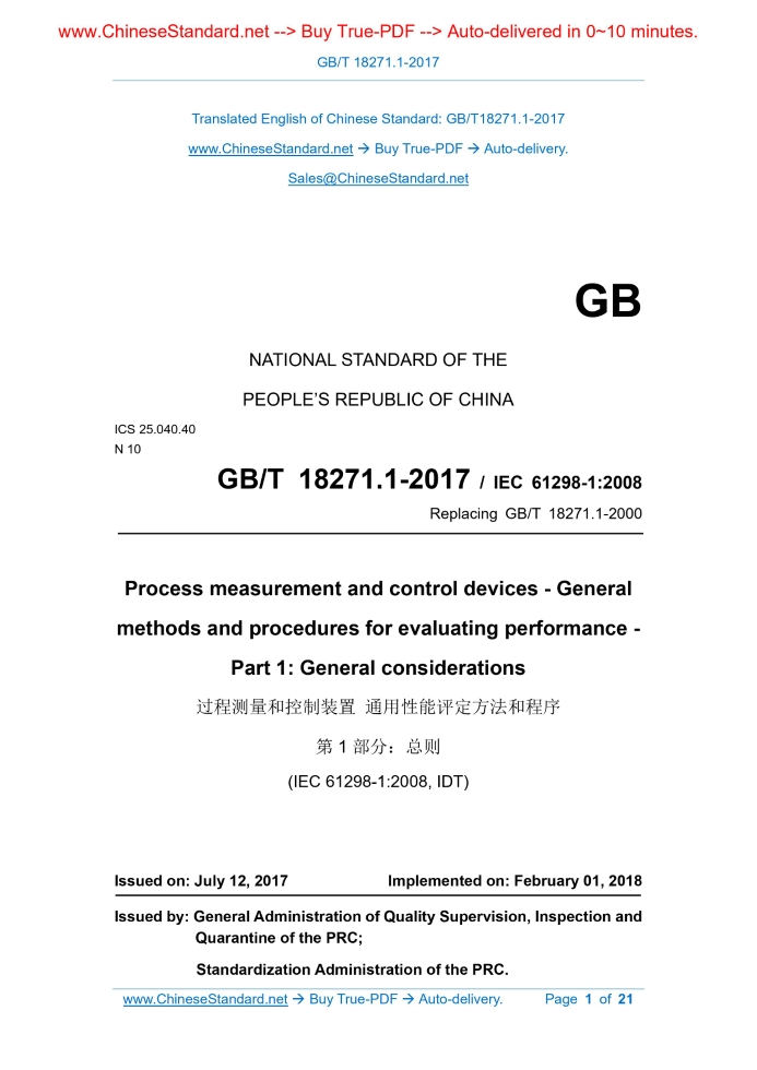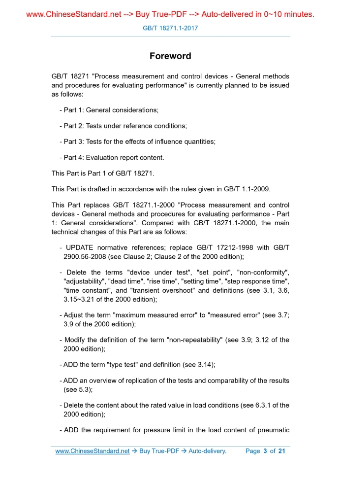 Similar standardsGB/T 18271.1-2017: Process measurement and control devices -- General methods and procedures for evaluating performance -- Part 1: General considerations---This is an excerpt. Full copy of true-PDF in English version (including equations, symbols, images, flow-chart, tables, and figures etc.), auto-downloaded/delivered in 9 seconds, can be purchased online: https://www.ChineseStandard.net/PDF.aspx/GBT18271.1-2017 Process measurement and control devices--General methods and procedures for evaluating performance--Part 1. General considerations ICS 25.040.40 N10 National Standards of People's Republic of China Replace GB/T 18271.1-2000 Process measurement and control devices General performance assessment methods and procedures Part 1. General (IEC 61298-1..2008, IDT) 2017-07-12 release 2018-02-01 Implementation General Administration of Quality Supervision, Inspection and Quarantine of the People's Republic of China Issued by China National Standardization Administration ForewordGB/T 18271 "Universal Performance Evaluation Methods and Procedures for Process Measurement and Control Devices" currently plans to release the following parts. --- Part 1. General Provisions; --- Part 2. Test under reference conditions; --- Part 3. Experiments on the influence of the quantity; --- Part 4. The content of the assessment report. This part is Part 1 of GB/T 18271. This section was drafted in accordance with the rules given in GB/T 1.1-2009. This part replaces GB/T 18271.1-2000 "General performance evaluation methods and procedures for process measurement and control devices. Part 1. General Principles, compared with GB/T 18271.1-2000, the main technical changes are as follows. --- Updated normative references, replacing GB/T 17212-1998 with GB/T 2900.56-2008 (see Chapter 2,.2000) Chapter 2 of the edition); --- Removed the terms "tested device" "setpoint" "inconsistency" "adjustability" "time lag" "rise time" "settling time" "stepping "Time", "time constant" and "instantaneous overshoot" and definitions (see 3.1, 3.6, 3.15 ~ 3.21 of the.2000 edition); --- Adjust the term "maximum measurement error" to "measurement error" (see 3.7; 3.9 in the.2000 edition); --- Modified the definition of the term "non-repeatability" (see 3.9; 3.12 in the.2000 edition); --- Added the term "type test" and definition (see 3.14); --- Added an overview of the reproducibility of the test and the comparability of the test results (see 5.3); --- Removed the content of rated value in the load condition (see 6.3.1 of the.2000 edition); --- Increased the requirements for pressure limits in the load content of pneumatic devices (see 6.3); --- Removed the requirement in the test sequence that the calibration value of the device under test should be verified before each test and included in the report (See 7.7 in the.2000 version); --- Removed references (see Appendix A of the.2000 edition). The translation method used in this part is equivalent to the use of IEC 61298-1..2008 "General performance evaluation methods and procedures for process measurement and control devices Part 1. General Provisions. The Chinese documents that have a consistent correspondence with the normatively cited international documents in this section are as follows. --- GB/T 2900.79-2008 Electrotechnical terminology Electrical and electronic measurement and instrumentation Part 3. Electrical measurement instrumentation Type [IEC 60050 (300-313)..2001, IDT] --- GB/T 2900.89-2012 Electrotechnical terminology Electrical and electronic measurement and instrumentation Part 2. General terminology for electrical measurement [IEC 60050 (300-312)..2001, IDT] --- GB/T 2900.90-2012 Electrotechnical terminology Electrical and electronic measurement and instrumentation Part 4. Special techniques for various types of instruments Language [IEC 60050 (300-314)..2001, IDT] --- GB/T 3101-1993 General principles on quantities, units and symbols (ISO 31-0..1992, EQV) --- GB/T 3102 (all parts) quantity and unit [ISO 31 (all parts)]. This part is proposed by China Machinery Industry Federation. This part is under the jurisdiction of the National Industrial Process Measurement Control and Automation Standardization Technical Committee (SAC/TC124). This section was drafted. Shanghai Industrial Automation Instrumentation Institute, Chongqing Industrial Automation Instrumentation Institute, Southwest University, Shanghai Automation Instrument Co., Ltd. The main drafters of this section. Wang Jianing, Liu Qin, Zhou Xuelian, Ni Min. The previous versions of the standard replaced by this part are as follows. --- GB/T 18271.1-2000. Process measurement and control devices General performance assessment methods and procedures Part 1. General1 ScopeGB/T 18271 stipulates a general method for performing functional and performance characteristics tests of process measurement and control devices and preparing test reports Laws and procedures. The test methods and procedures specified in GB/T 18271 apply to any kind of test or any type of process measurement and control equipment Set. These experiments are applicable to any process with specific input and output variables and a specific relationship (transfer function) between input and output variables. Process measurement and control devices, including analog devices and digital devices. For devices that require special test items, it should be in accordance with GB/T 18271 Combined with the product standards specifically stipulated for such special test items, the test is conducted. This part of GB/T 18271 discusses the general principles applicable to all parts of GB/T 18271.2 Normative referencesThe following documents are essential for the application of this document. For dated references, only the dated version applies to this article Pieces. For the cited documents without date, the latest version (including all amendments) applies to this document. GB/T 2900.56-2008 Electrical engineering terminology control technology