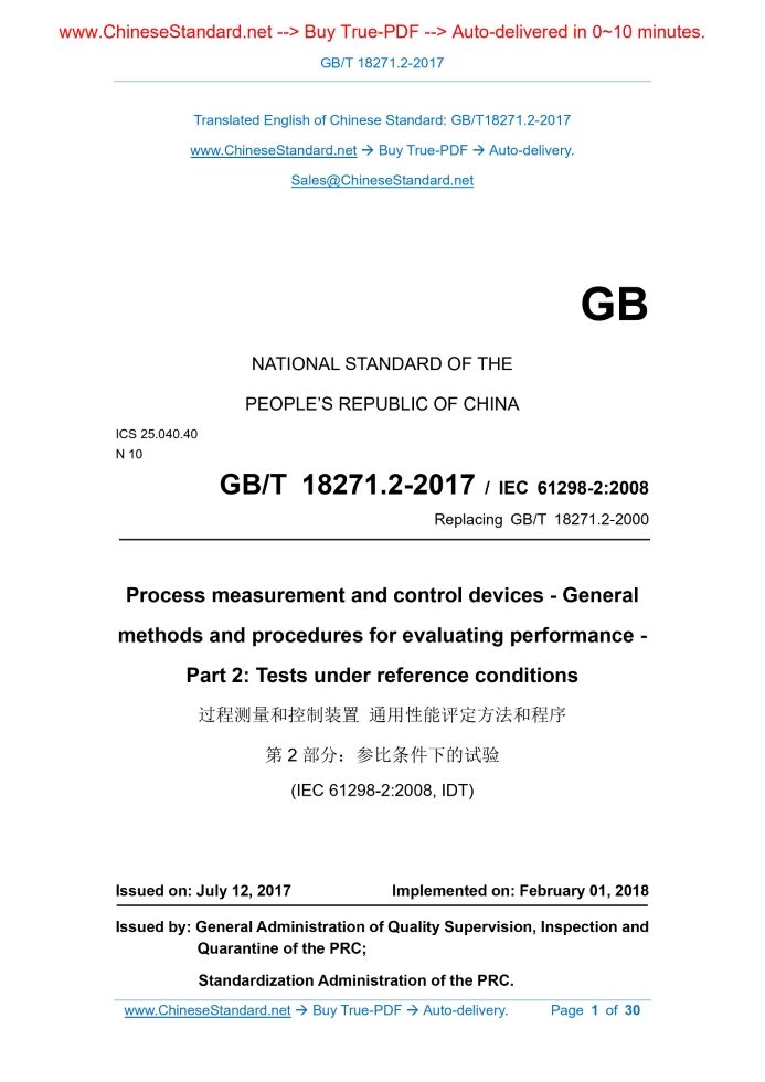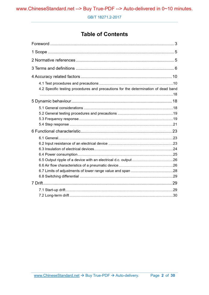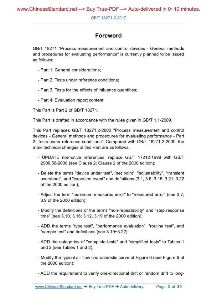 Similar standardsGB/T 18271.2-2017: Process measurement and control devices -- General methods and procedures for evaluating performance -- Part 2: Tests under reference conditions---This is an excerpt. Full copy of true-PDF in English version (including equations, symbols, images, flow-chart, tables, and figures etc.), auto-downloaded/delivered in 9 seconds, can be purchased online: https://www.ChineseStandard.net/PDF.aspx/GBT18271.2-2017 NATIONAL STANDARD OF THE PEOPLE’S REPUBLIC OF CHINA ICS 25.040.40 N 10 GB/T 18271.2-2017 / IEC 61298-2.2008 Replacing GB/T 18271.2-2000 Process measurement and control devices - General methods and procedures for evaluating performance - Part 2.Tests under reference conditions (IEC 61298-2.2008, IDT) Issued on. JULY 12, 2017 Implemented on. FEBRUARY 01, 2018 Issued by. General Administration of Quality Supervision, Inspection and Quarantine of the PRC; Standardization Administration of the PRC. Table of ContentsForeword... 3 1 Scope... 5 2 Normative references... 5 3 Terms and definitions... 6 4 Accuracy related factors... 10 4.1 Test procedures and precautions... 10 4.2 Specific testing procedures and precautions for the determination of dead band ... 18 5 Dynamic behaviour... 18 5.1 General considerations... 18 5.2 General testing procedures and precautions... 19 5.3 Frequency response... 19 5.4 Step response... 21 6 Functional characteristic... 23 6.1 General... 23 6.2 Input resistance of an electrical device... 23 6.3 Insulation of electrical devices... 24 6.4 Power consumption... 25 6.5 Output ripple of a device with an electrical d.c. output... 26 6.6 Air flow characteristics of a pneumatic device... 26 6.7 Limits of adjustments of lower range value and span... 28 6.8 Switching differential... 29 7 Drift... 29 7.1 Start-up drift... 29 7.2 Long-term drift... 30ForewordGB/T 18271 "Process measurement and control devices - General methods and procedures for evaluating performance" is currently planned to be issued as follows. - Part 1.General considerations; - Part 2.Tests under reference conditions; - Part 3.Tests for the effects of influence quantities; - Part 4.Evaluation report content. This Part is Part 2 of GB/T 18271. This Part is drafted in accordance with the rules given in GB/T 1.1-2009. This Part replaces GB/T 18271.2-2000 "Process measurement and control devices - General methods and procedures for evaluating performance - Part 2.Tests under reference conditions". Compared with GB/T 18271.2-2000, the main technical changes of this Part are as follows. - UPDATE normative references; replace GB/T 17212-1998 with GB/T 2900.56-2008 (see Clause 2; Clause 2 of the 2000 edition); - Delete the terms "device under test", "set point", "adjustability", "transient overshoot", and "expected event" and definitions (3.1, 3.6, 3.15, 3.21, 3.22 of the 2000 edition); - Adjust the term "maximum measured error" to "measured error" (see 3.7; 3.9 of the 2000 edition); - Modify the definitions of the terms "non-repeatability" and "step response time" (see 3.10, 3.16; 3.12, 3.19 of the 2000 edition); - ADD the terms "type test", "performance evaluation", "routine test", and "sample test" and definitions (see 3.19~3.22); - ADD the categories of "complete tests" and "simplified tests" to Tables 1 and 2 (see Tables 1 and 2); - Modify the typical air flow characteristic curve of Figure 6 (see Figure 6 of the 2000 edition); - ADD the requirement to verify one-directional drift or random drift to long- term drift (see 7.2). This Part, using translation method, is identical to IEC 61298-2.2008 "Process measurement and control devices - General methods and procedures for evaluating performance - Part 2.Tests under reference conditions". China’s documents which have a consistent correspondence with the international documents normatively referenced in this Part are as follows. - GB/T 2900.79-2008 Electrotechnical terminology - Electrical and electronic measurements and measuring instruments - Part 3.Types of electrical measuring instruments [IEC 60050(300-313).2001, IDT] - GB/T 2900.89-2012 Electrotechnical terminology - Electrical and electronic measurements and measuring instruments - Part 2.General terms relating to electrical measurements [IEC 60050(300-312).2001, IDT] - GB/T 2900.90-2012 Electrotechnical terminology - Electrical and electronic measurements and measuring instruments - Part 4.Specific terms according to the type of instruments [IEC 60050(300-314).2001, IDT] - GB 4793.1-2007 Safety requirements for electrical equipment for measurement, control, and laboratory use - Part 1.General requirements (IEC 61010-1.2001, IDT) This Part was proposed by China Machinery Industry Federation. This Part shall be under the jurisdiction of National TC 124 on Industrial Process Measurement, Control and Automation of SAC (SAC/TC 124). Drafting organizations of this Part. Shanghai Institute of Process Automation & Instrumentation, Chongqing Institute of Industrial Automation and Instrumentation, Southwest University, Shanghai Automation Instrumentation Co., Ltd. Main drafters of this Part. Wang Jianing, Liu Qin, Zhou Xuelian, Ni Min. The previous editions of the standard replaced by this Part were released as follows. - GB/T 18271.2-2000. Process measurement and control devices - General methods and procedures for evaluating performance - Part 2.Tests under reference conditions1 ScopeGB/T 18271 specifies general methods and procedures for conducting tests and reporting on the functional and performance characteristics of process measurement and control devices. The tests are applicable to any such devices characterized by their own specific input and output variables, and by the specific relationship (transfer function) between the inputs and outputs, and include analogue and digital devices. For devices that require special tests, GB/T 18271 should be used, together with any product specific standard specifying special tests.2 Normative referencesThe following docume