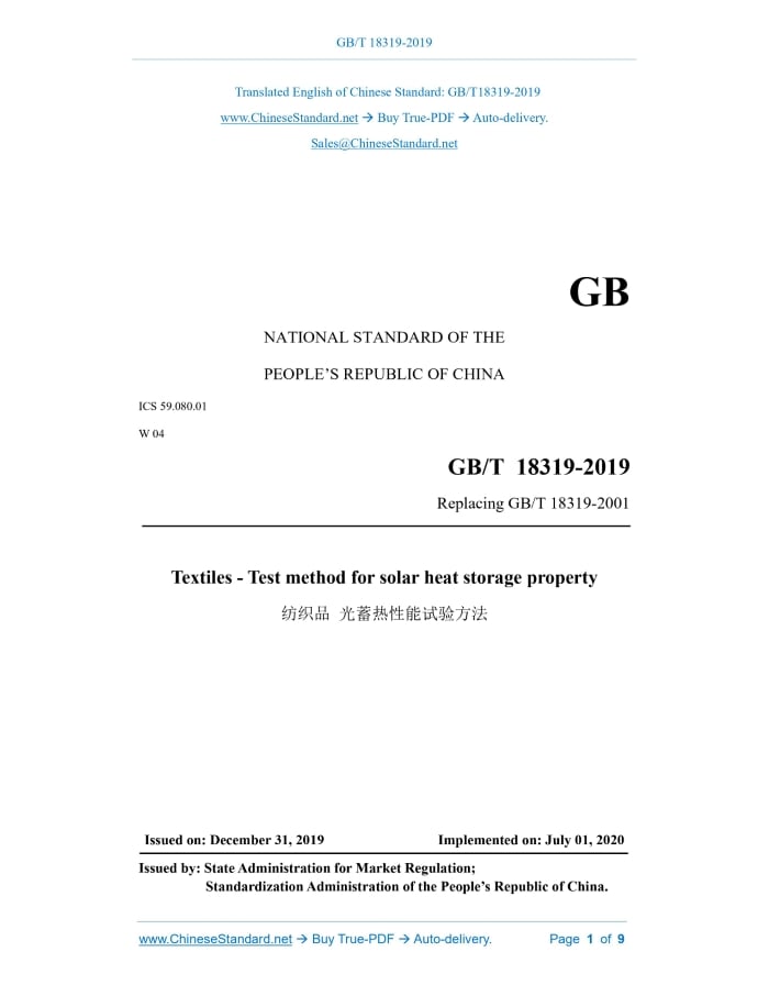 GB/T 18319-2019: Textiles - Test method for solar heat storage property Delivery: 9 seconds. True-PDF full-copy in English & invoice will be downloaded + auto-delivered via email. See step-by-step procedure Status: Valid GB/T 18319: Historical versions