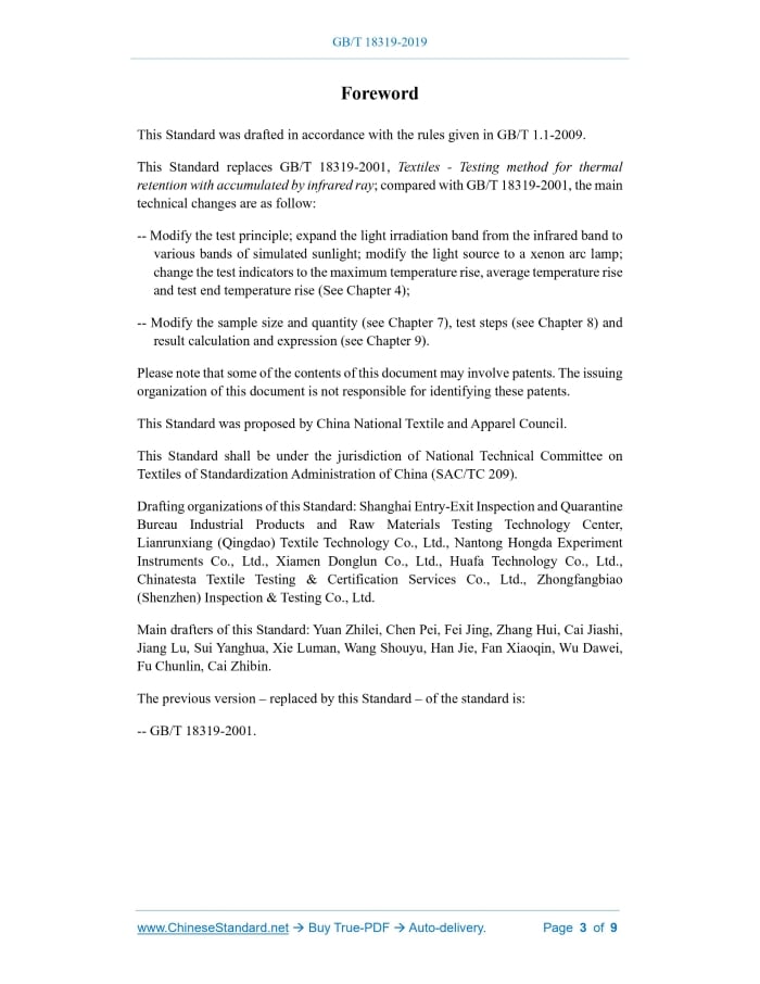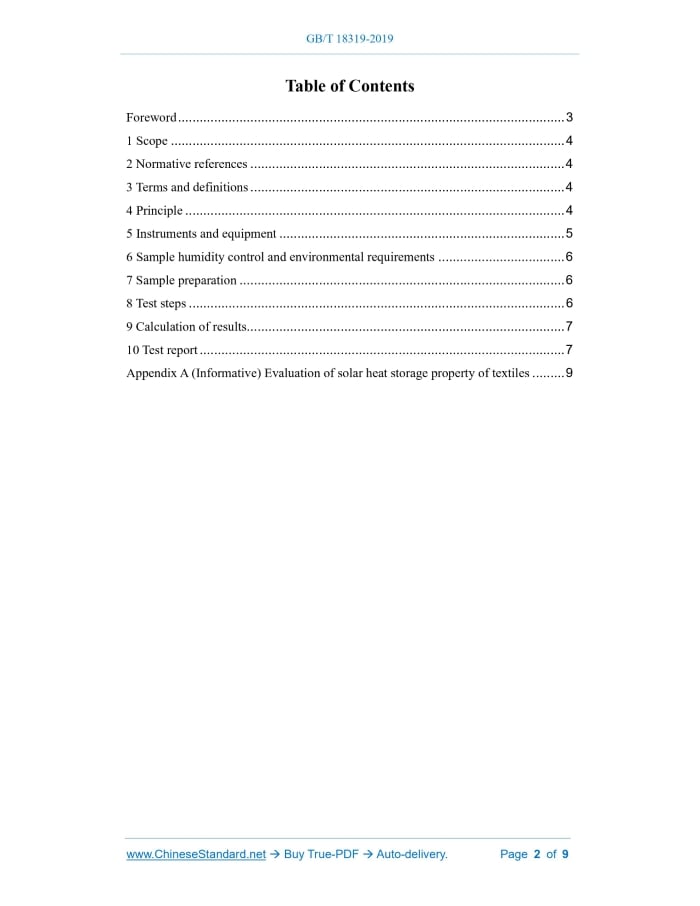 Similar standardsGB/T 18319-2019: Textiles - Test method for solar heat storage property---This is an excerpt. Full copy of true-PDF in English version (including equations, symbols, images, flow-chart, tables, and figures etc.), auto-downloaded/delivered in 9 seconds, can be purchased online: https://www.ChineseStandard.net/PDF.aspx/GBT18319-2019GB NATIONAL STANDARD OF THE PEOPLE’S REPUBLIC OF CHINA ICS 59.080.01 W 04 Replacing GB/T 18319-2001 Textiles - Test method for solar heat storage property ISSUED ON: DECEMBER 31, 2019 IMPLEMENTED ON: JULY 01, 2020 Issued by: State Administration for Market Regulation; Standardization Administration of the People’s Republic of China. Table of ContentsForeword ... 3 1 Scope ... 4 2 Normative references ... 4 3 Terms and definitions ... 4 4 Principle ... 4 5 Instruments and equipment ... 5 6 Sample humidity control and environmental requirements ... 6 7 Sample preparation ... 6 8 Test steps ... 6 9 Calculation of results ... 7 10 Test report ... 7 Appendix A (Informative) Evaluation of solar heat storage property of textiles ... 9ForewordThis Standard was drafted in accordance with the rules given in GB/T 1.1-2009. This Standard replaces GB/T 18319-2001, Textiles - Testing method for thermal retention with accumulated by infrared ray; compared with GB/T 18319-2001, the main technical changes are as follow: -- Modify the test principle; expand the light irradiation band from the infrared band to various bands of simulated sunlight; modify the light source to a xenon arc lamp; change the test indicators to the maximum temperature rise, average temperature rise and test end temperature rise (See Chapter 4); -- Modify the sample size and quantity (see Chapter 7), test steps (see Chapter 8) and result calculation and expression (see Chapter 9). Please note that some of the contents of this document may involve patents. The issuing organization of this document is not responsible for identifying these patents. This Standard was proposed by China National Textile and Apparel Council. This Standard shall be under the jurisdiction of National Technical Committee on Textiles of Standardization Administration of China (SAC/TC 209). Drafting organizations of this Standard: Shanghai Entry-Exit Inspection and Quarantine Bureau Industrial Products and Raw Materials Testing Technology Center, Lianrunxiang (Qingdao) Textile Technology Co., Ltd., Nantong Hongda Experiment Instruments Co., Ltd., Xiamen Donglun Co., Ltd., Huafa Technology Co., Ltd., Chinatesta Textile Testing & Certification Services Co., Ltd., Zhongfangbiao (Shenzhen) Inspection & Testing Co., Ltd. Main drafters of this Standard: Yuan Zhilei, Chen Pei, Fei Jing, Zhang Hui, Cai Jiashi, Jiang Lu, Sui Yanghua, Xie Luman, Wang Shouyu, Han Jie, Fan Xiaoqin, Wu Dawei, Fu Chunlin, Cai Zhibin. The previous version – replaced by this Standard – of the standard is: -- GB/T 18319-2001. Textiles - Test method for solar heat storage property1 ScopeThis Standard specifies the test method for solar heat storage property of textiles. This Standard applies to all types of textile products. Fibers and yarns can be made into sheets and then implemented as a reference.2 Normative referencesThe following referenced documents are indispensable for the application of this document. For dated references, only the edition cited applies. For undated references, the latest edition of the referenced document (including any amendments) applies. GB/T 6529, Textiles - Standard atmospheres for conditioning and testing3 Terms and definitionsFor the purposes of this document, the following terms and definitions apply. 3.1 solar heat storage property Property that textiles absorb sunlight from the environment, convert it into heat energy, and maintain it for a period of time to increase the temperature. 3.2 irradiance Radiant power incident on unit surface area. Note: The unit is watts per square meter (W/m2).4 PrincipleUse a xenon arc lamp as the irradiation light source. Place the sample under a certain irradiation intensity, and the temperature of the sample changes due to absorption of light energy. Use a temperature sensor to test the temperature of the sample; record the temperature change of the sample at every point-in-time after 10 minutes of irradiation and 10 minutes of turning off the light source; calculate the maximum temperature rise 4 – temperature recorder; 5 – temperature sensor 1; 6 – temperature sensor 2; 7 – sample pressing frame. Figure 1 – Example of structural diagram of solar heat storage tester6 Sample humidity control and environmental requirementsPerform humidifying in accordance with the standard atmospheric temperature and humidity environment and procedures specified in GB/T 6529, and carry out the test, where no other thermal radiation sources that may affect it exist indoors.7 Sample preparationThe sample shall be representative. Cut at least three test pieces from each sample. The size of each test piece shall be at least 180 mm × 180 mm. If there are areas with large differences in structure, color, etc. (including spliced components in the product) in the sample, it is advisable to sample each area separately if possible. For fibers and yarns, sheet test pieces can be made for testing.8 Test stepsWarning – Xenon arc light is harmful to eyes. Proper protective measures should be taken during testing. 8.1 Turn on the xenon arc lamp of the tester and preheat it for 5 minutes. Use an irradiance meter to test the irradiance at the center of the sample table and adjust the irradiance to (400 ± 10) W/m2; then, turn off the xenon arc lamp and let the test table cool to ambient temperature. 8.2 Place the sample in the center on the sample table with the front side of the sample facing up; then, use the sample pressing frame to fix the sample, to ensure that the sample is in full contact with temperature sensor 1. 8.3 Turn on the xenon arc lamp, and the temperature recorder will automati