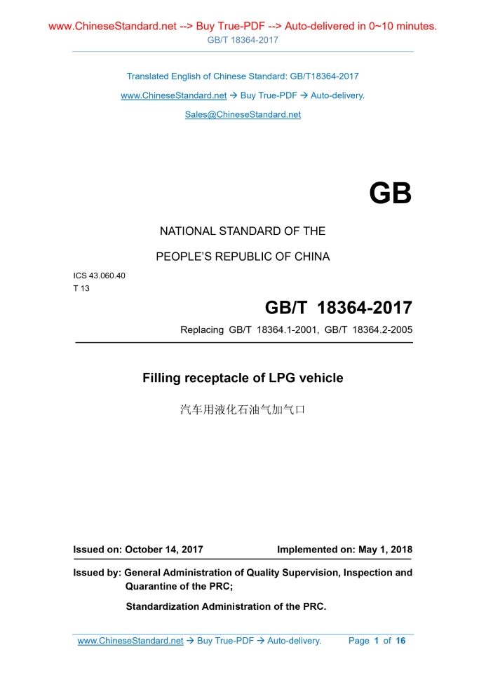 GB/T 18364-2017: Filling receptacle of LPG vehicle Delivery: 9 seconds. True-PDF full-copy in English & invoice will be downloaded + auto-delivered via email. See step-by-step procedure Status: Valid GB/T 18364: Historical versions