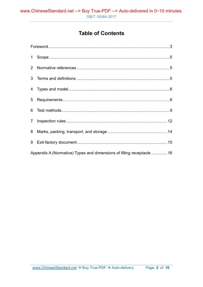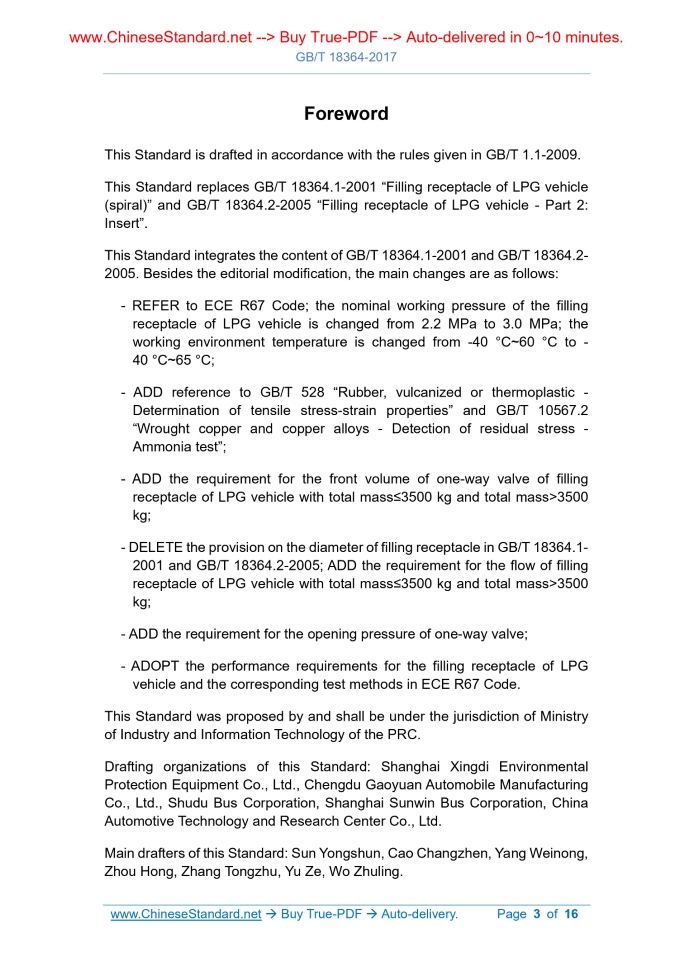 Similar standardsGB/T 18364-2017: Filling receptacle of LPG vehicle---This is an excerpt. Full copy of true-PDF in English version (including equations, symbols, images, flow-chart, tables, and figures etc.), auto-downloaded/delivered in 9 seconds, can be purchased online: https://www.ChineseStandard.net/PDF.aspx/GBT18364-2017GB NATIONAL STANDARD OF THE PEOPLE’S REPUBLIC OF CHINA ICS 43.060.40 T 13 Replacing GB/T 18364.1-2001, GB/T 18364.2-2005 Filling receptacle of LPG vehicle Issued on: OCTOBER 14, 2017 Implemented on: MAY 1, 2018 Issued by. General Administration of Quality Supervision, Inspection and Quarantine of the PRC; Standardization Administration of the PRC. Table of ContentsForeword . 3 1 Scope .. 5 2 Normative references .. 5 3 Terms and definitions .. 5 4 Types and model .. 6 5 Requirements .. 6 6 Test methods .. 9 7 Inspection rules .. 12 8 Marks, packing, transport, and storage . 14 9 Exit-factory document .. 15 Appendix A (Normative) Types and dimensions of filling receptacle .. 16 Foreword This Standard is drafted in accordance with the rules given in GB/T 1.1-2009. This Standard replaces GB/T 18364.1-2001 “Filling receptacle of LPG vehicle (spiral)” and GB/T 18364.2-2005 “Filling receptacle of LPG vehicle - Part 2. Insert”. This Standard integrates the content of GB/T 18364.1-2001 and GB/T 18364.2- 2005. Besides the editorial modification, the main changes are as follows. - REFER to ECE R67 Code; the nominal working pressure of the filling receptacle of LPG vehicle is changed from 2.2 MPa to 3.0 MPa; the working environment temperature is changed from -40 °C~60 °C to - 40 °C~65 °C; - ADD reference to GB/T 528 “Rubber, vulcanized or thermoplastic - Determination of tensile stress-strain properties” and GB/T 10567.2 “Wrought copper and copper alloys - Detection of residual stress - Ammonia test”; - ADD the requirement for the front volume of one-way valve of filling receptacle of LPG vehicle with total mass≤3500 kg and total mass >3500 kg; - DELETE the provision on the diameter of filling receptacle in GB/T 18364.1- 2001 and GB/T 18364.2-2005; ADD the requirement for the flow of filling receptacle of LPG vehicle with total mass≤3500 kg and total mass >3500 kg; - ADD the requirement for the opening pressure of one-way valve; - ADOPT the performance requirements for the filling receptacle of LPG vehicle and the corresponding test methods in ECE R67 Code. This Standard was proposed by and shall be under the jurisdiction of Ministry of Industry and Information Technology of the PRC. Drafting organizations of this Standard. Shanghai Xingdi Environmental Protection Equipment Co., Ltd., Chengdu Gaoyuan Automobile Manufacturing Co., Ltd., Shudu Bus Corporation, Shanghai Sunwin Bus Corporation, China Automotive Technology and Research Center Co., Ltd. Main drafters of this Standard. Sun Yongshun, Cao Changzhen, Yang Weinong, Zhou Hong, Zhang Tongzhu, Yu Ze, Wo Zhuling. Filling receptacle of LPG vehicle1 ScopeThis Standard specifies the definitions, types, technical requirements, test methods, inspection rules, marks, packing, exit-factory document, transport, and storage of filling receptacle of LPG vehicle. This Standard is applicable to the filling receptacle of LPG vehicle, which uses the LPG vehicle as required in GB 19159 as the fuel, of which the nominal working pressure is 3.0 MPa (The pressure value described in this Standard is gauge pressure) and the working environment temperature is -40 °C~65 °C.2 Normative referencesThe following documents are essential to the application of this document. For the dated references, only the versions with the dates indicated are applicable to this document. For the undated references, the latest version (including all the amendments) are applicable to this document. GB/T 528 Rubber, vulcanized or thermoplastic - Determination of tensile stress-strain properties GB/T 9969 General Principles for Preparation of Instructions for Use of Industrial Products GB/T 10125 Corrosion tests in artificial atmospheres - Salt spray tests GB/T 10567.2 Wrought copper and copper alloys - Detection of residual stress - Ammonia test GB/T 17895 Natural gas vehicle and liquefied petroleum gas vehicle - Vocabulary GB 19159 Automotive liquefied petroleum gases GB 19239 Mounting requirements of special equipment for gas vehicle CB/T 3764 Thickness Series and Quality Requirements for Metallic and Chemical Coatings3 Terms and definitions5.1.4 The installation of filling receptacle on a vehicle shall comply with the provisions of GB 19239. 5.1.5 The metal parts of filling receptacle shall not use castings or die castings. 5.1.6 In the filling receptacle, the appearance requirements of all parts treated with metal and chemical coatings shall comply with the relevant provisions of GB/T 3764. 5.1.7 The front volume of one-way valve. For the filing receptacle of LPG vehicle with total mass≤3500 kg, it shall≤0.1 cm3; for the filing receptacle of LPG vehicle with total mass >3500 kg, it shall≤0.5 cm3. 5.1.8 With water as the test medium, under 0.3 MPa pressure difference, the flow through the filing receptacle of LPG vehicle with total mass≤3500 kg shall≥20 L/min; under 0.3 MPa pressure difference, the flow through the filing receptacle of LPG vehicle with total mass >3500 kg shall≥30 L/min. 5.1.9 When the pressure difference between the inlet and outlet of filling receptacle≤0.2 MPa, the one-way valve shall be opened. 5.2 Performance requirements 5.2.1 Hydrostatic pressure strength After the test of hydrostatic pressure strength is carried out according to the method specified in 6.3, the pressure bearing parts of filling receptacle shall be free of visible cracks or permanent deformation. 5.2.2 Air tightness According to the method specified in 6.4, CARRY out air tightness test, the leakage rate≤15 cm3/h. 5.2.3 One-way valve leak-proof According to the method specified in 6.5, CARRY out the test, at any air pressure in 3 MP
