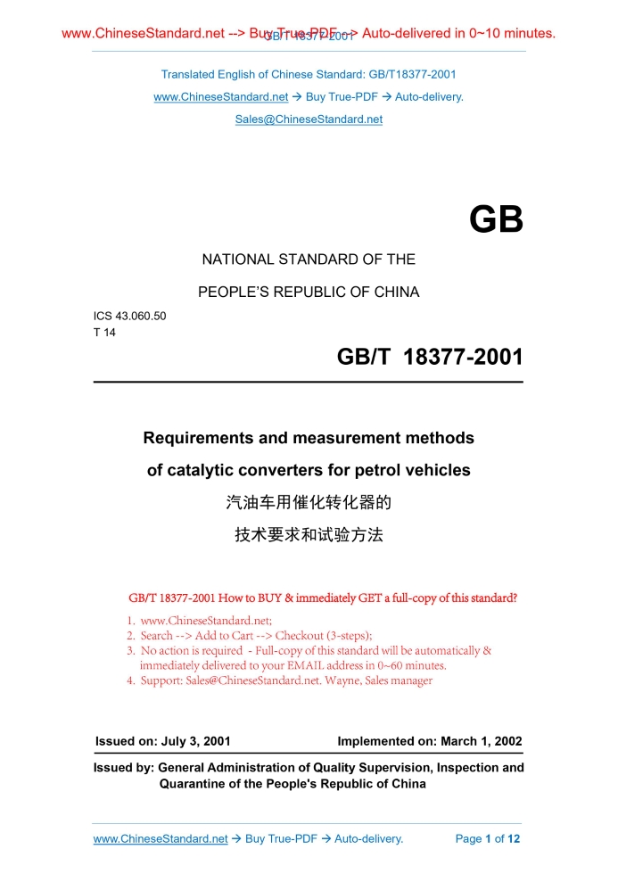 GB/T 18377-2001: Requirements and measurement methods of catalytic converters for petrol vehicles Delivery: 9 seconds. True-PDF full-copy in English & invoice will be downloaded + auto-delivered via email. See step-by-step procedure Status: Valid