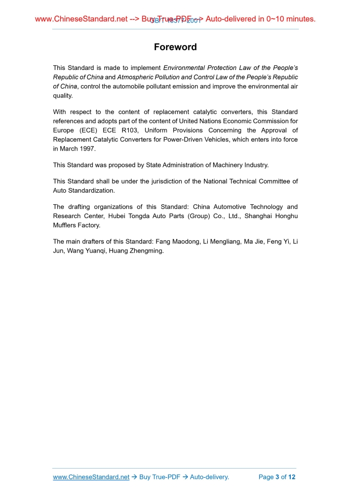 Similar standardsGB/T 18377-2001: Requirements and measurement methods of catalytic converters for petrol vehicles---This is an excerpt. Full copy of true-PDF in English version (including equations, symbols, images, flow-chart, tables, and figures etc.), auto-downloaded/delivered in 9 seconds, can be purchased online: https://www.ChineseStandard.net/PDF.aspx/GBT18377-2001GB NATIONAL STANDARD OF THE PEOPLE’S REPUBLIC OF CHINA ICS 43.060.50 T 14 Requirements and measurement methods of catalytic converters for petrol vehicles Issued on: JULY 3, 2001 Implemented on: MARCH 1, 2002 Issued by. General Administration of Quality Supervision, Inspection and Quarantine of the People's Republic of China 3. No action is required - Full-copy of this standard will be automatically & immediately delivered to your EMAIL address in 0~60 minutes. Table of ContentsForeword ... 3 1 Scope .. 4 2 Normative References ... 4 3 Definitions ... 4 4 Test conditions ... 6 5 Requirements ... 6 6 Test methods .. 8ForewordThis Standard is made to implement Environmental Protection Law of the People’s Republic of China and Atmospheric Pollution and Control Law of the People’s Republic of China, control the automobile pollutant emission and improve the environmental air quality. With respect to the content of replacement catalytic converters, this Standard references and adopts part of the content of United Nations Economic Commission for Europe (ECE) ECE R103, Uniform Provisions Concerning the Approval of Replacement Catalytic Converters for Power-Driven Vehicles, which enters into force in March 1997. This Standard was proposed by State Administration of Machinery Industry. This Standard shall be under the jurisdiction of the National Technical Committee of Auto Standardization. The drafting organizations of this Standard. China Automotive Technology and Research Center, Hubei Tongda Auto Parts (Group) Co., Ltd., Shanghai Honghu Mufflers Factory. The main drafters of this Standard. Fang Maodong, Li Mengliang, Ma Jie, Feng Yi, Li Jun, Wang Yuanqi, Huang Zhengming. Requirements and measurement methods of catalytic converters for petrol vehicles1 ScopeThis Standard specifies the technical requirements and test methods of catalytic converters for petrol vehicles. This Standard applies to catalytic converters for petrol vehicles. This Standard also applies to catalytic converter for fuel liquefied petroleum gas (LPG) vehicles.2 Normative ReferencesThe provisions in following documents become the provisions of this Standard through reference in this Standard. When this Standard is published, all the versions shown are effective. However, all standards will be revised. Parties whose use this Standard shall study if the latest versions of the following standards are applicable. GB/T 10125-1997, Corrosion tests in artificial atmospheres - Salt spray tests (eqv ISO 9227.1990) GB/T 12534-1990, Motor vehicles - General rules of road test method GB/T 14761-1999, Limits and measurement methods for emissions of pollutants from motor vehicles GB/T 14762-1993, Test method for exhaust pollutants from gasoline engine of vehicle QC/T 630-1999, Test method for automobile exhaust mufflers3 DefinitionsFor the purposes of this Standard, the following definitions apply. 3.1 catalytic converter A device which uses catalysts to reduce hydrocarbon (HC), carbon monoxide (CO) and nitric oxide (NOx) in automotive exhaust. 3.2 original equipment catalytic converter4 Test conditions4.1 For all test items which are carried out on the road or in test site, the test conditions and vehicle preparation etc. shall comply with the general provisions of GB/T 123534. 4.2 For all test items which are carried out inside test room, the test conditions etc. shall comply with the general provisions of GB 14761 or GB 14762. 4.3 The vehicle for the evaluation test for the replacement catalytic converter shall be driven for 3 000 km at least. The vehicle emission control system shall be free from any defect; any original equipment part related to emission control shall be repaired or replaced in case of excessive wear or malfunction. Before emission test, the vehicle shall be adjusted correctly according to the technical specifications of the manufacturer. 4.4 The engine for the accelerated ageing test of the catalytic converter shall be repaired and maintained correctly to ensure all properties comply with the technical specifications of the manufacturer, especially that during the accelerated ageing test of the catalytic converter, the excess air coefficient of the engine under steady working conditions shall be controlled within the range of 1 ± 0.02.5 Requirements5.1 General requirements 5.1.1 The catalytic converter shall be marked indelibly of manufacturer name or trademark, type of the catalytic converter and direction of inlet and outlet. 5.1.2 The design, manufacture and installation of the catalytic converter shall ensure that the vehicle comply with all provisions of national standards. 5.1.3 The design, manufacture and installation of the catalytic converter shall prevent the possible corrosion or oxidation during the use of the vehicle, to a certain extent. 5.1.4 The design and manufacture of the catalytic converter shall ensure that when the leakage test is carried out as specified in 6.1, its pressure drops shall not be greater than 10 kPa. During the installation of the catalytic converter, it shall be ensured that the interfaces are sealed. 5.1.5 The replacement catalytic converter shall be installed at the same position of original equipment catalytic converter; the ground clearance of the vehicle shall not be reduced; and the position of oxygen sensor in exhaust pipe shall not be altered. 5.1.6 The catalytic converter shall be provided with thermal insulation measures to ensure use safety. 5.4.1 For original equipment catalytic converter, its endurance mileage is 80 000 km under the conditions of normal use and maintenance of the vehicle. 5.