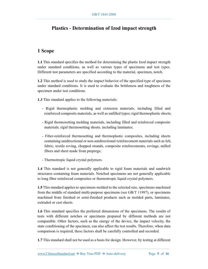 GB/T 1843-2008: Plastics - Determination of izod impact strength Delivery: 9 seconds. True-PDF full-copy in English & invoice will be downloaded + auto-delivered via email. See step-by-step procedure Status: Valid GB/T 1843: Historical versions