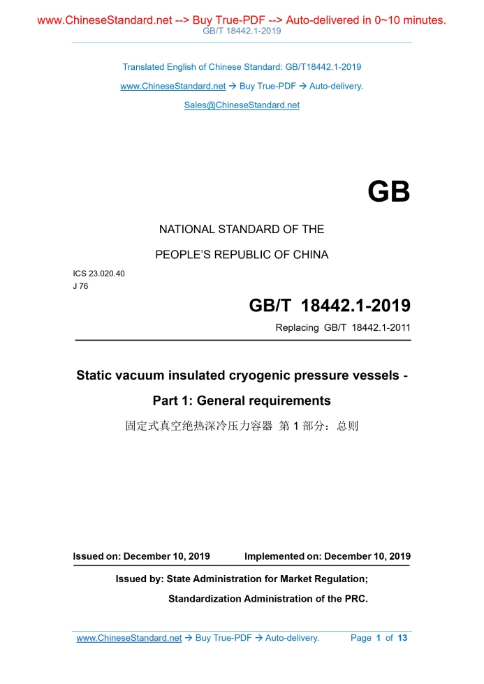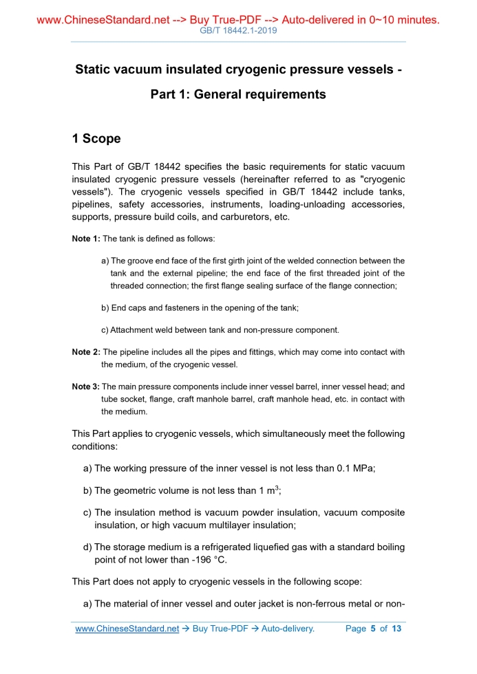 Similar standardsGB/T 18442.1-2019: Static vacuum insulated cryogenic pressure vessels - Part 1: General requirements---This is an excerpt. Full copy of true-PDF in English version (including equations, symbols, images, flow-chart, tables, and figures etc.), auto-downloaded/delivered in 9 seconds, can be purchased online: https://www.ChineseStandard.net/PDF.aspx/GBT18442.1-2019 NATIONAL STANDARD OF THE PEOPLE’S REPUBLIC OF CHINA ICS 23.020.40 J 76 Replacing GB/T 18442.1-2011 Static vacuum insulated cryogenic pressure vessels - Part 1.General requirements Issued on. DECEMBER 10, 2019 Implemented on. DECEMBER 10, 2019 Issued by. State Administration for Market Regulation; Standardization Administration of the PRC. Table of ContentsForeword... 3 1 Scope... 5 2 Normative references... 6 3 Terms and definitions... 7 4 General requirements... 8 Bibliography... 13ForewordGB/T 18442 "Static vacuum insulated cryogenic pressure vessels" is divided into the following 7 parts. - Part 1.General requirements; - Part 2.Materials; - Part 3.Design; - Part 4.Fabrication; - Part 5.Inspection and test; - Part 6.Safety device requirements; - Part 7.Rules of pressure strengthening for inner vessels. This Part is Part 1 of GB/T 18442. This Part is drafted in accordance with the rules given in GB/T 1.1-2009. This Part replaces GB/T 18442.1-2011 "Static vacuum insulated cryogenic pressure vessel - Part 1.General requirements". Compared with GB/T 18442.1- 2011, the main technical changes of this Part are as follows. - Modify the scope of application and the scope of non-application; - Delete 8 terms and definitions such as vacuum fiber insulation and vacuum insulation; ADD 6 terms and definitions such as annular space, tank, and inner vessel; REVISE 4 terms and definitions such as vacuum insulated cryogenic pressure vessel and high vacuum multilayer insulation; - ADD the responsibilities of the design client; modify the qualifications and responsibilities of the design organization and fabrication organization; - Delete the requirements of design documents and general design drawings and adjust them to the design part of GB/T 18442.3; - MOVE the classification content of welded joints of tank pressure components in GB/T 18442.4-2011 to this Part; and, add the classification diagram of welded joints of outer jacket and pipeline. Attention is drawn to the possibility that some of the elements of this document may be the subject of patent rights. The issuing authority of this document shall not be held responsible for identifying any or all such patent rights. This Part was proposed by and shall be under the jurisdiction of China Standardization Committee on Boilers and Pressure Vessels (SAC/TC 262). Drafting organizations of this Part. Shanghai Gas Industry Association, Zhangjiagang CIMC Sanctum Cryogenic Equipment Co., Ltd., China Special Equipment Inspection and Research Institute, Zhangjiagang Branch of Special Equipment Safety Supervision Inspection Institute of Jiangsu Province, East China University of Science and Technology, Machinery Industry Shanghai Lanya Petrochemical Equipment Testing Institute Co., Ltd., Air Liquide (China) Holding Co., Ltd., Shanghai Huayi Group Equipment Engineering Co., Ltd. Main drafters of this Part. Zhou Weiming, Luo Xiaozhong, Chen Zhaohui, Wang Fei, Teng Junhua, Gao Jie, Hui Hu, Zhang Yufu, Chen Qinjian, Wei Yongbiao. The previous editions of the standard replaced by this Part were released as follows. - GB/T 18442.1-2011; - GB 18442-2001. Static vacuum insulated cryogenic pressure vessels - Part 1.General requirements1 ScopeThis Part of GB/T 18442 specifies the basic requirements for static vacuum insulated cryogenic pressure vessels (hereinafter referred to as "cryogenic vessels"). The cryogenic vessels specified in GB/T 18442 include tanks, pipelines, safety accessories, instruments, loading-unloading accessories, supports, pressure build coils, and carburetors, etc. Note 1.The tank is defined as follows. a) The groove end face of the first girth joint of the welded connection between the tank and the external pipeline; the end face of the first threaded joint of the threaded connection; the first flange sealing surface of the flange connection; b) End caps and fasteners in the opening of the tank; c) Attachment weld between tank and non-pressure component. Note 2.The pipeline includes all the pipes and fittings, which may come into contact with the medium, of the cryogenic vessel. Note 3.The main pressure components include inner vessel barrel, inner vessel head; and tube socket, flange, craft manhole barrel, craft manhole head, etc. in contact with the medium. This Part applies to cryogenic vessels, which simultaneously meet the following conditions. a) The working pressure of the inner vessel is not less than 0.1 MPa; b) The geometric volume is not less than 1 m3; c) The insulation method is vacuum powder insulation, vacuum composite insulation, or high vacuum multilayer insulation; d) The storage medium is a refrigerated liquefied gas with a standard boiling point of not lower than -196 °C. This Part does not apply to cryogenic vessels in the following scope. a) The material of inner vessel and outer jacket is non-ferrous metal or non- metal; b) HAVE a spherical structure; c) Stacked insulation; d) Mobile; e) STORE refrigerated liquefied gas medium with standard boiling point below -196 °C; f) The storage medium is toxic gas according to GB 12268; g) Those with special requirements such as national defense and military equipment.2 Normative referencesThe following documents are indispensable for the application of this document. For the dated references, only the editions with the dates indicated are applicable to this document. For the undated references, the latest edition (including all the amendments) are applicable to this document. GB/T 150 (all parts) Pressure vessels GB/T 18442.2 Static vacuum insulated cryogenic pressure vessels - Part 2. Materials GB/T 1844