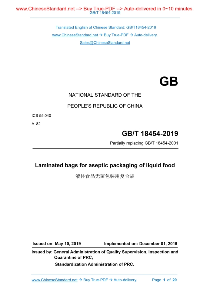 GB/T 18454-2019: Laminated bags for aseptic packaging of liquid food Delivery: 9 seconds. True-PDF full-copy in English & invoice will be downloaded + auto-delivered via email. See step-by-step procedure Status: Valid GB/T 18454: Historical versions