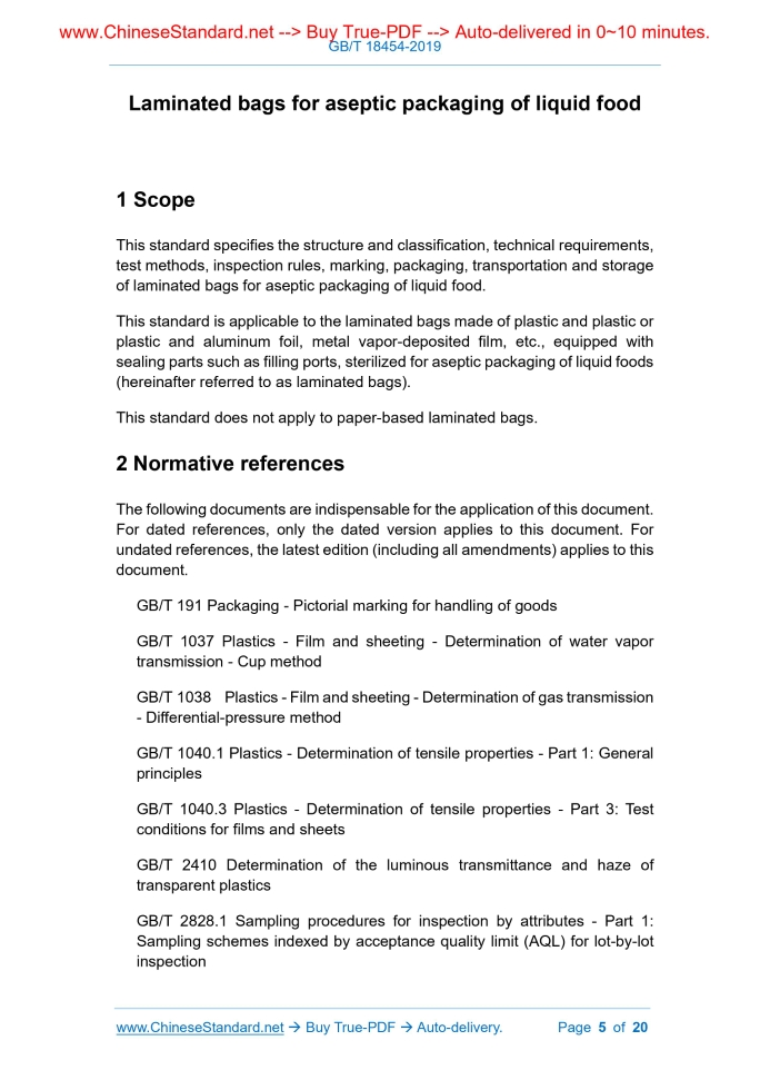 Similar standardsGB/T 18454-2019: Laminated bags for aseptic packaging of liquid food---This is an excerpt. Full copy of true-PDF in English version (including equations, symbols, images, flow-chart, tables, and figures etc.), auto-downloaded/delivered in 9 seconds, can be purchased online: https://www.ChineseStandard.net/PDF.aspx/GBT18454-2019NATIONAL STANDARD OF THE PEOPLE’S REPUBLIC OF CHINA ICS 55.040 A 82 Partially replacing GB/T 18454-2001 Laminated bags for aseptic packaging of liquid food ISSUED ON: MAY 10, 2019 IMPLEMENTED ON: DECEMBER 01, 2019 Issued by: General Administration of Quality Supervision, Inspection and Quarantine of PRC; Standardization Administration of PRC. Table of ContentsForeword ... 3 1 Scope ... 5 2 Normative references ... 5 3 Terms and definitions ... 7 4 Structure and classification ... 9 5 Technical requirements ... 9 6 Test methods ... 12 7 Inspection rules ... 16 8 Marking, packaging, transportation and storage ... 19 Laminated bags for aseptic packaging of liquid food1 ScopeThis standard specifies the structure and classification, technical requirements, test methods, inspection rules, marking, packaging, transportation and storage of laminated bags for aseptic packaging of liquid food. This standard is applicable to the laminated bags made of plastic and plastic or plastic and aluminum foil, metal vapor-deposited film, etc., equipped with sealing parts such as filling ports, sterilized for aseptic packaging of liquid foods (hereinafter referred to as laminated bags). This standard does not apply to paper-based laminated bags.2 Normative referencesThe following documents are indispensable for the application of this document. For dated references, only the dated version applies to this document. For undated references, the latest edition (including all amendments) applies to this document. GB/T 191 Packaging - Pictorial marking for handling of goods GB/T 1037 Plastics - Film and sheeting - Determination of water vapor transmission - Cup method GB/T 1038 Plastics - Film and sheeting - Determination of gas transmission - Differential-pressure method GB/T 1040.1 Plastics - Determination of tensile properties - Part 1: General principles GB/T 1040.3 Plastics - Determination of tensile properties - Part 3: Test conditions for films and sheets GB/T 2410 Determination of the luminous transmittance and haze of transparent plastics GB/T 2828.1 Sampling procedures for inspection by attributes - Part 1: Sampling schemes indexed by acceptance quality limit (AQL) for lot-by-lot inspection GB 4789.2 National food safety standard - Microbiological examination of food: Aerobic plate count GB 4789.3 National food safety standard - Food microbiological examination - Enumeration of coliforms GB 4789.4 National food safety standard - Microbiological examination of food - Examination of salmonella GB 4789.5 National food safety standard - Microbiological examination of food hygiene - Examination of shigella GB 4789.10 National food safety standard - Food microbiological examination - Examination of staphylococcus aureus GB 4789.11 National food safety standard - Microbiological examination of food hygiene - Examination of β-Streptococcus hemolyticus GB 4789.15 National food safety standard - Food microbiological examination: Enumeration of moulds and yeasts GB 4806.6 National food safety standard - Plastic resin used in food- contact GB 4806.7 National food safety standard - Food contact plastic materials and articles GB 4806.11 National food safety standard - Food contact rubber materials and articles GB/T 4857.5 Packaging - Transport packages - Vertical impact test method by dropping GB/T 6672 Plastics film and sheeting - Determination of thickness by mechanical scanning GB/T 6673 Determination of length and width of plastics film and sheeting GB/T 8808-1988 Soft composite plastic material - Peeling test method GB 9683 Hygienic standard for composite laminated food packaging bag GB 9685 National food safety standard - Standard for uses of additives in food contact materials and their products GB 18280.1 Sterilization of health care products - Radiation - Part 1: Requirements for development, validation and routine control of a sterilization process for medical devices The package which packs the sterilized food in a sterile environment or seals it in a sterilized container to maintain a long shelf life at room temperature without preservatives, meanwhile maximizes the original nutrients and flavors in food. 3.3 Laminated bags for aseptic packaging of liquid food A laminated bag which is made of a multi-layer film structure and is equipped with a sealing member such as a filling port, for filling the sterilized liquid food. Note: The laminated bag is for inner packaging and is used together with containers such as paper box, cartons, drums or wooden boxes. 3.4 Sterilization A confirmed process that leaves the product free of viable microorganisms. Note 1: During the sterilization process, the nature of microbial inactivation is exponential. The survival of microorganisms on a single product can be expressed by probability. Although this probability can be reduced to very low, it is impossible to fall to zero. Note 2: Rewrite the definition 3.39 of GB 18280.1-2015. 3.5 Bioburden The total number of viable microorganisms on a product and/or sterile barrier system and/or therein. [GB 18280.2-2015, definition 3.2.2] 3.6 Sterility assurance level; SAL The probability of a single living microorganism present on the product unit after sterilization. Note: SAL represents a magnitude, typically 10-6 or 10-3. Although 10-6 is smaller than 10-3, it provides a margin greater than 10-3. [GB 18280.2-2015, definition 3.2.11] Where: T - Thickness deviation, %; HM - Measured value of thickness, in micrometers (μm); HS - Standard value of thickness, in microns (μm); S - Standard thickness in Specification, in microns (μm). 6.4 Physical and mechanical performance 6.4.1 Oxygen permeab